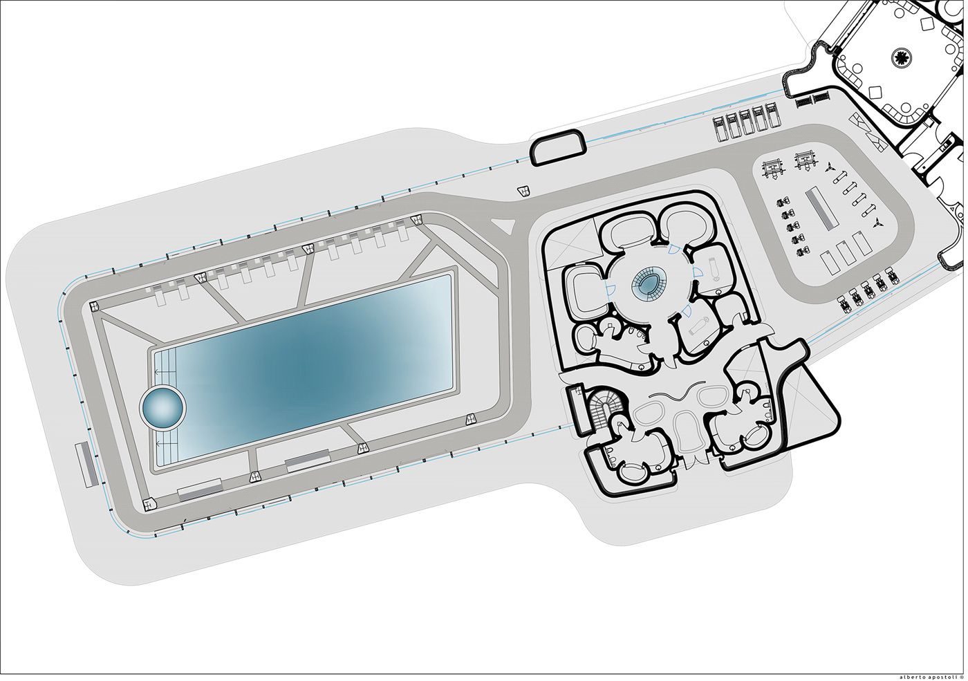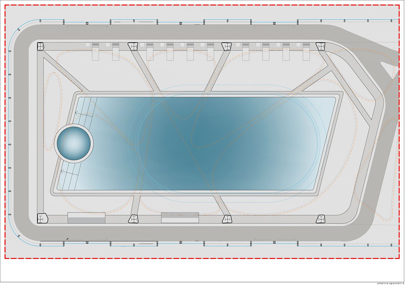 Этот бассейн является частью спортивного комплекса со спа-салоном и тренажерным залом. Здание отличается современной конструкцией и большими окнами по бокам и частично на потолке.