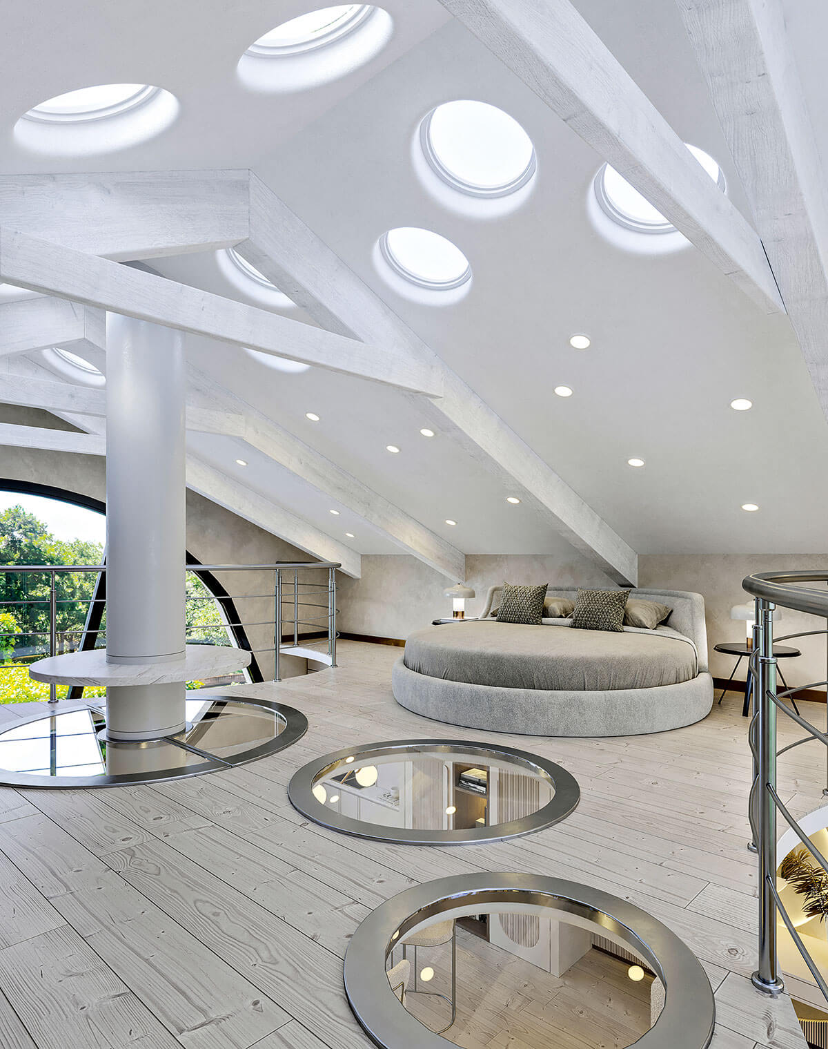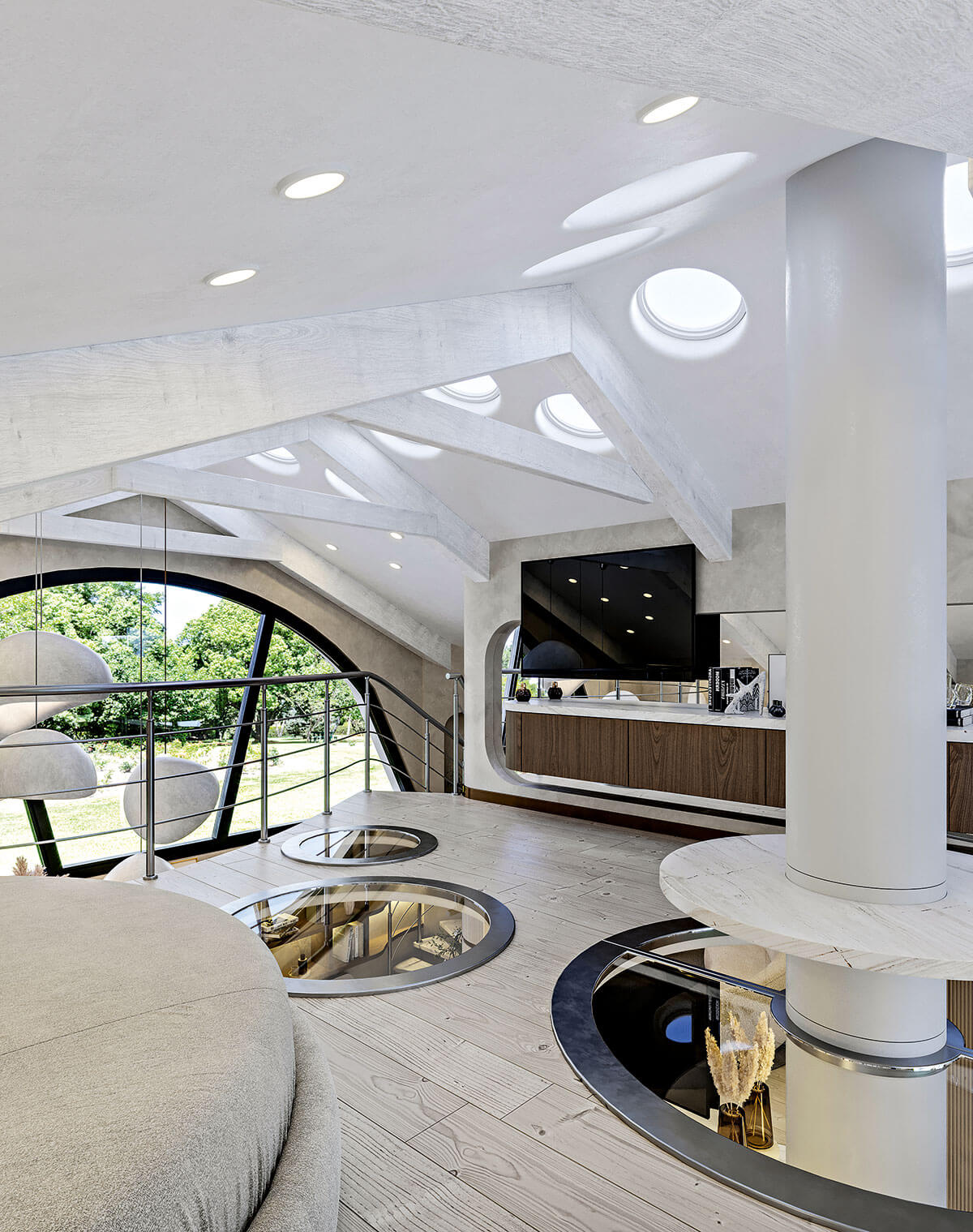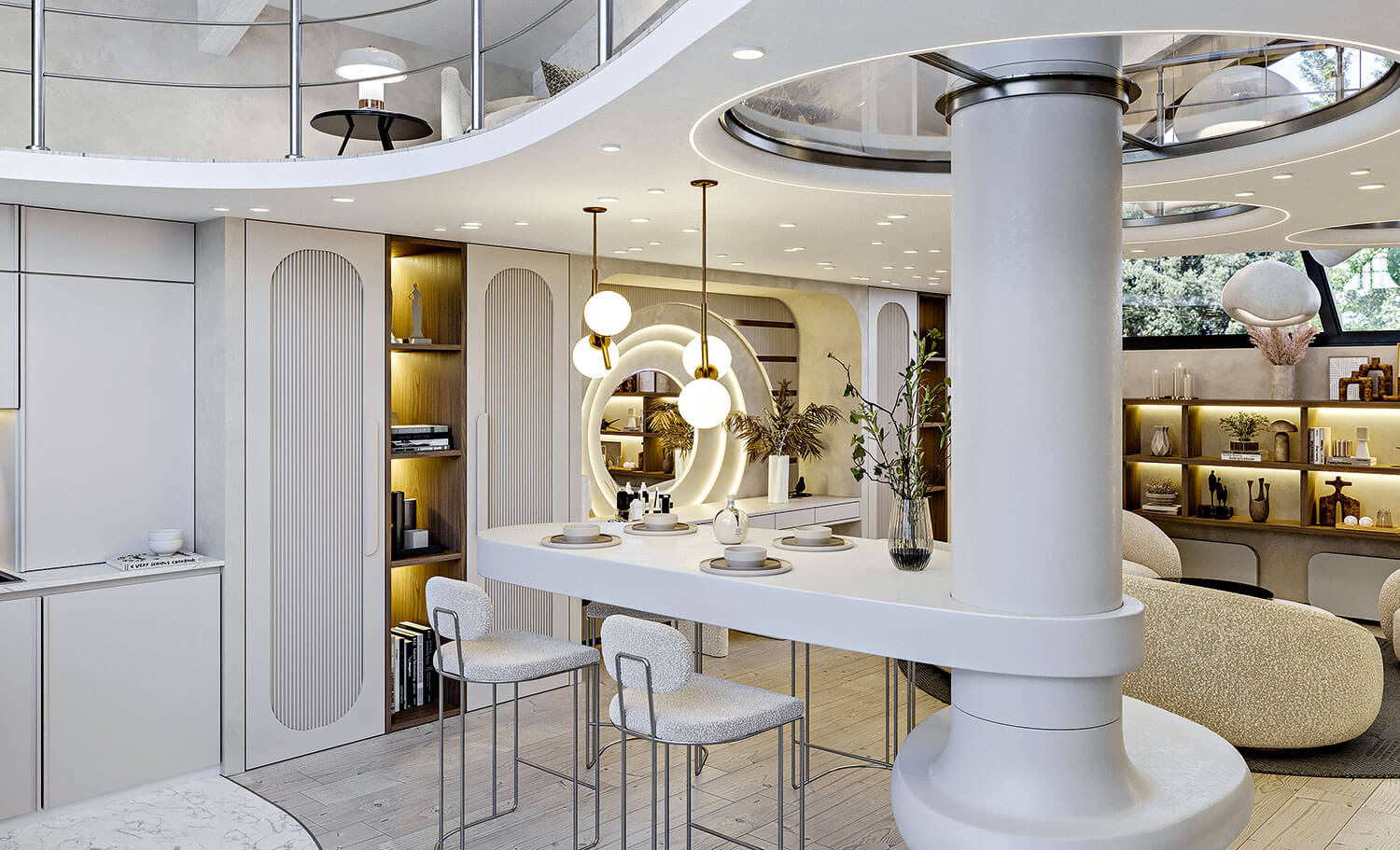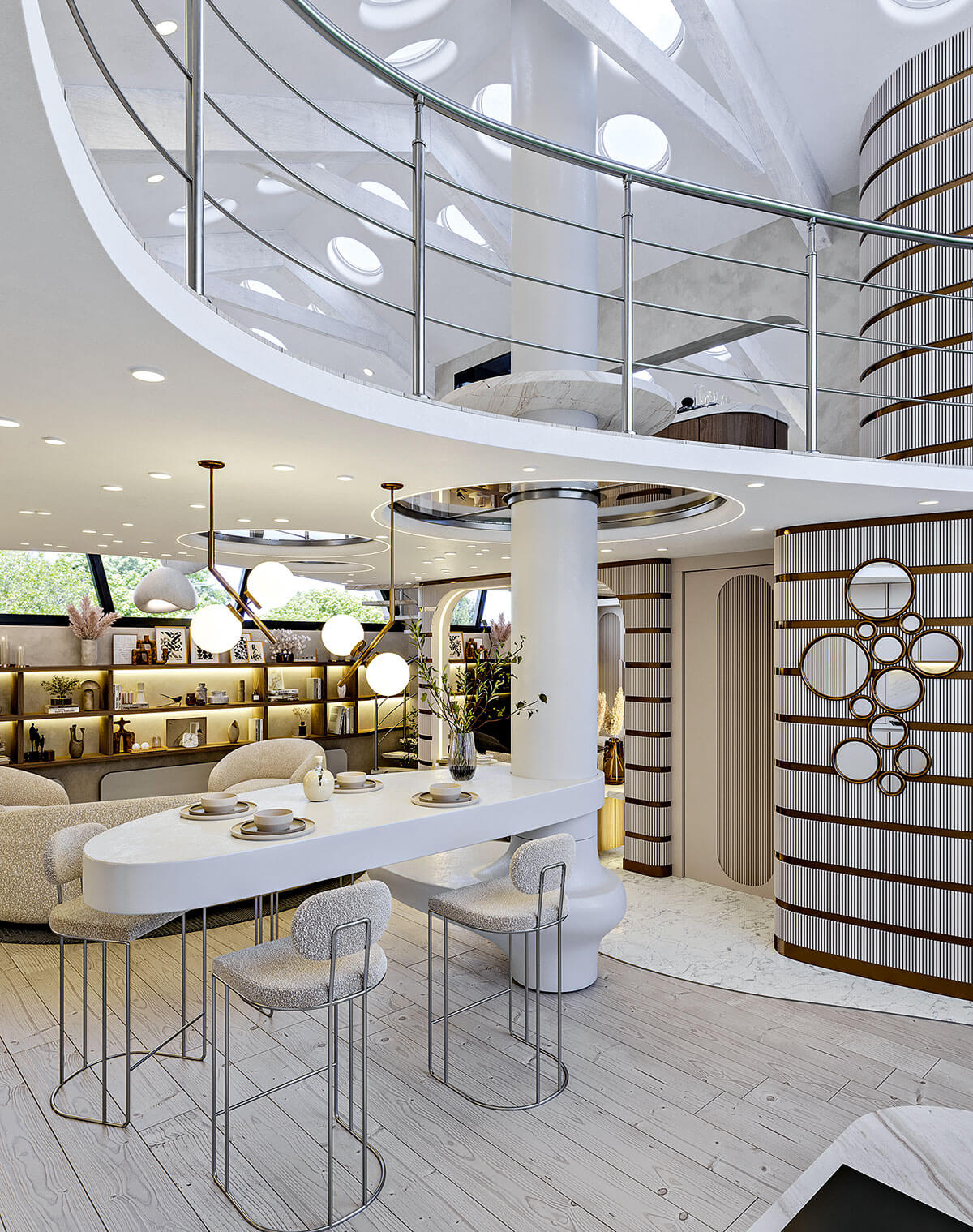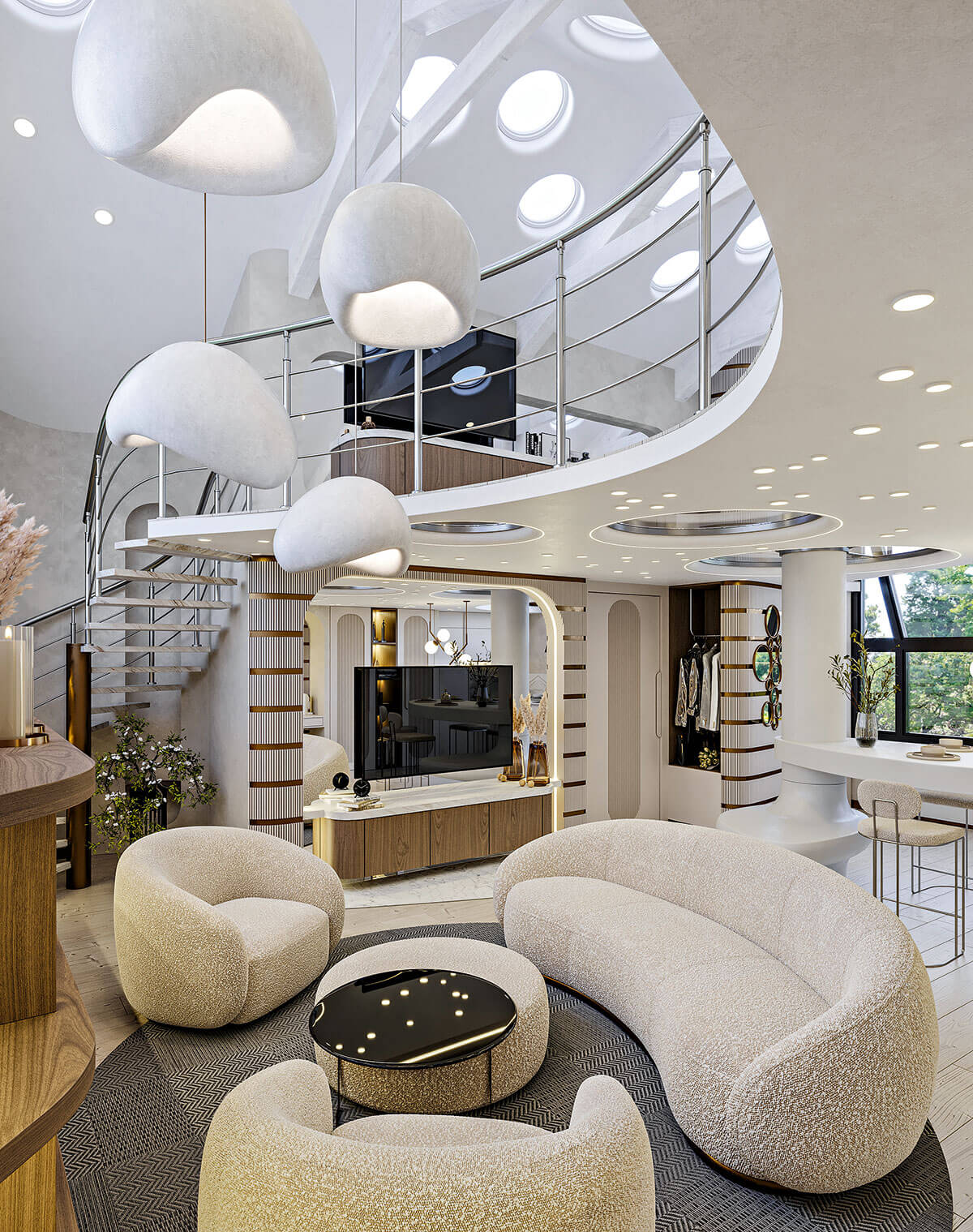 Необычный и притягательный образ представленного интерьера завораживает и восхищает. Наполняющие его элементы выглядят словно выходцы из другого измерения. Все компоненты жилого пространства гармонично вписаны в общую структуру, напоминающую причудливый конструктор, где отсутствуют прямые линии и стандартные решения. В работе авторы проекта использовали сложные сочетания кривых, плавных и закругленных переходов одной поверхности в другую, горизонтальной плоскости в вертикальную. Архитекторам удалось успешно решить задачу, поставленную заказчиками, — реализовать самые смелые творческие идеи и создать двухуровневое жилое пространство, сохранив ощущение простора и добавив полезной площади. Обтекаемые формы предметов обеспечивают удобство функционального использования прихожей, гостиной, столовой, кухни. Винтовая лестница спрятана от глаз в имеющейся нише. Трубу от мусоропровода, от которой нельзя было избавиться, архитекторы виртуозно обыграли и сделали доминантой, «нанизав» на нее консольную лавочку и барную стойку. Чтобы второй этаж, где расположена спальня, не нависал глухо над гостиной, авторы спроектировали в перекрытии пропускающие свет остекленные круглые ниши. Точечные светильники, хаотично установленные на потолках первого и второго этажей, создают эффект звездного неба. Овальная мебель и аксессуары словно обволакивают пространство, сглаживая углы. Такой интерьер никогда не наскучит и при всей своей оригинальности и футуристичности он необыкновенно комфортный и уютный.