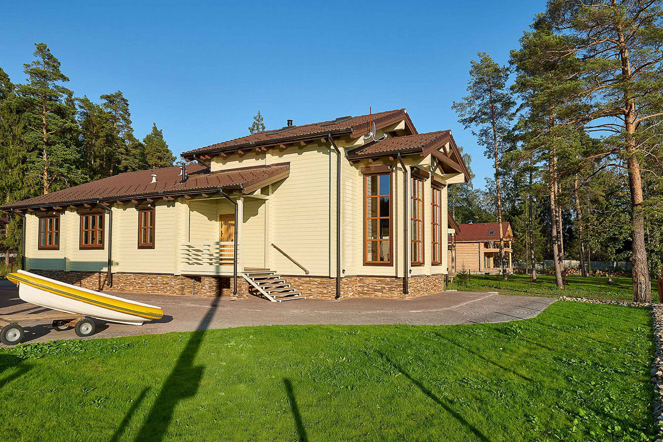 Дом «АЛЯСКА» насчитывает 230 кв.м. В проекте дома есть большая гостиная, в которой с комфортом разместятся и семья, и гости. Эркер спроектировали с большими окнами, чтобы открыть максимальный вид на озеро из гостиной. Кухня имеет выход на террасу также с видом на озеро. В доме три спальных комнаты, два санузла. Есть просторный холл в спальной зоне, где можно оборудовать кабинет. Есть своя котельная.