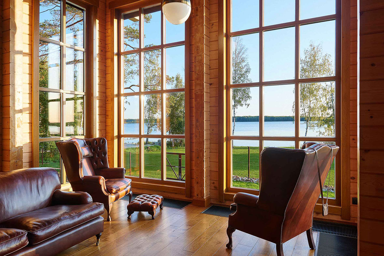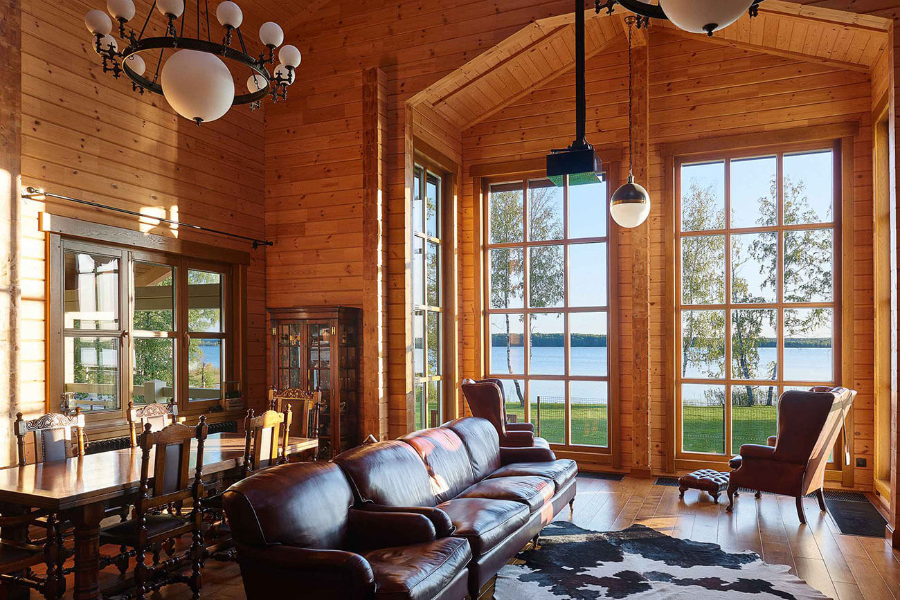 Интерьер для своего загородного дома заказчики создавали сами. Они выбрали линию английского стиля. Для гостиной подобрали винтажные кожаные кресла из Англии, которые так и притягивают расположиться поудобнее и наслаждаться безмятежностью окружающей природы.