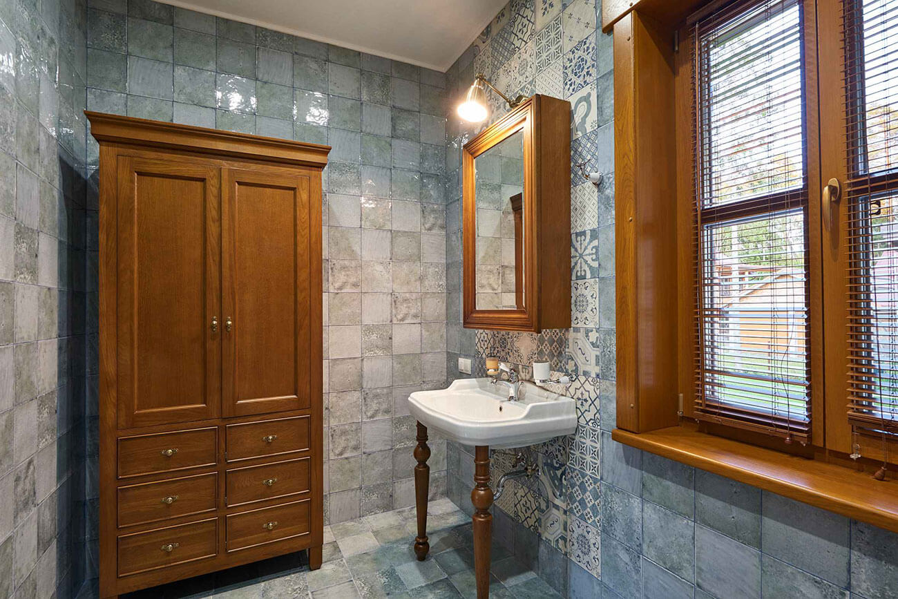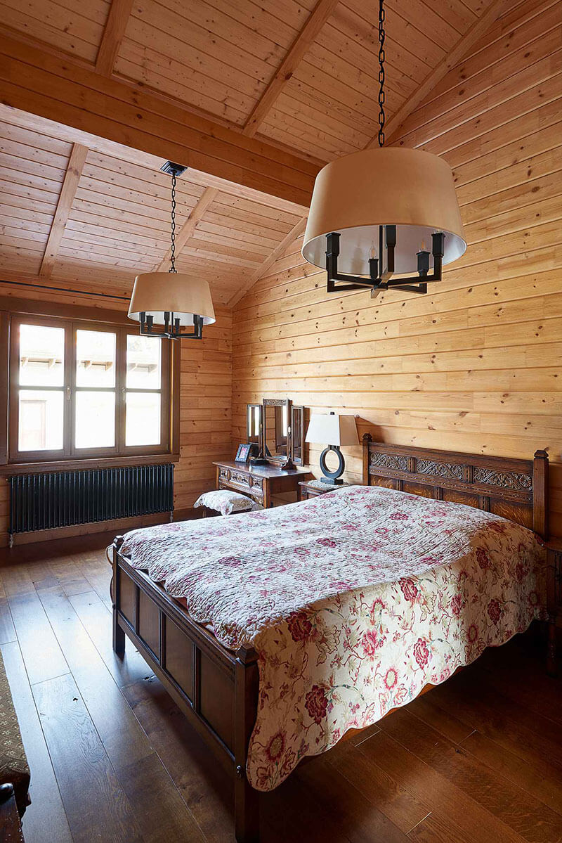 Спальня и ванная комната выдержаны в английской классике, как и весь дом. Солидная и добротная мебель из массива, деревянные элементы в отделке окон создают теплое и уютное настроение загородного дома.