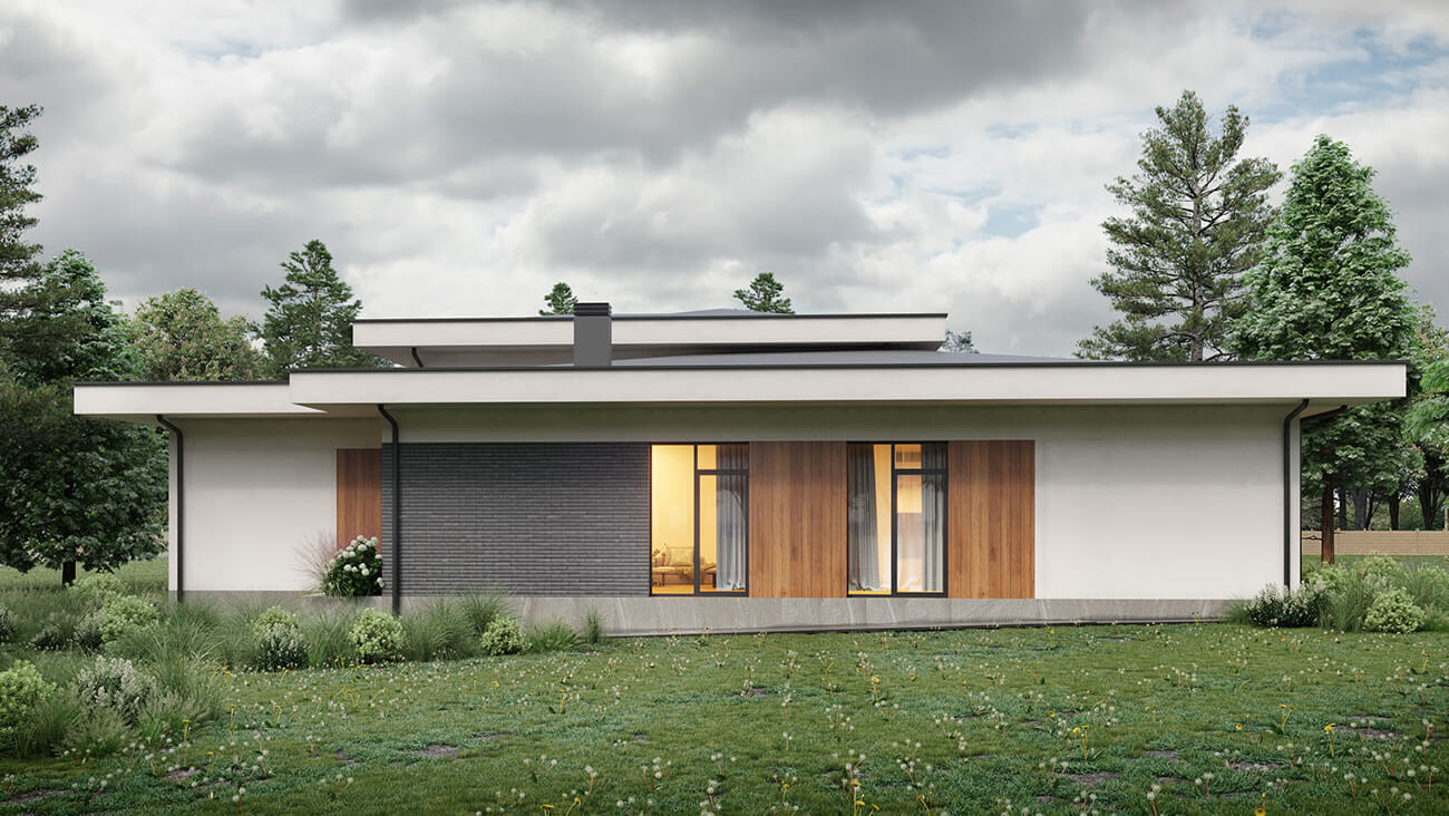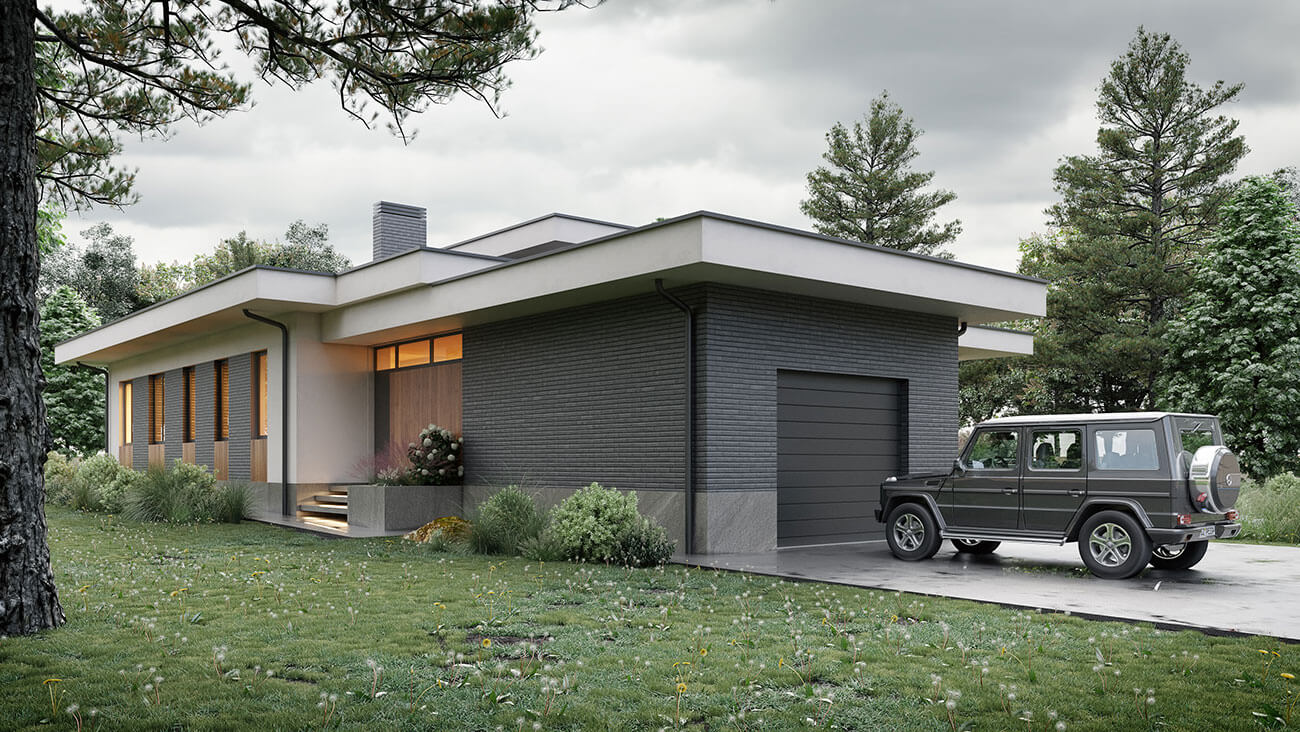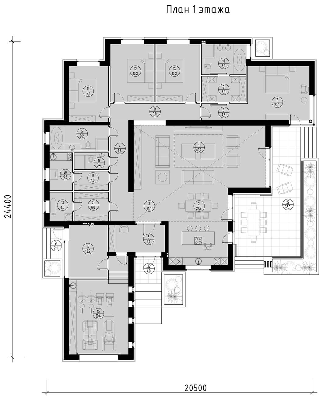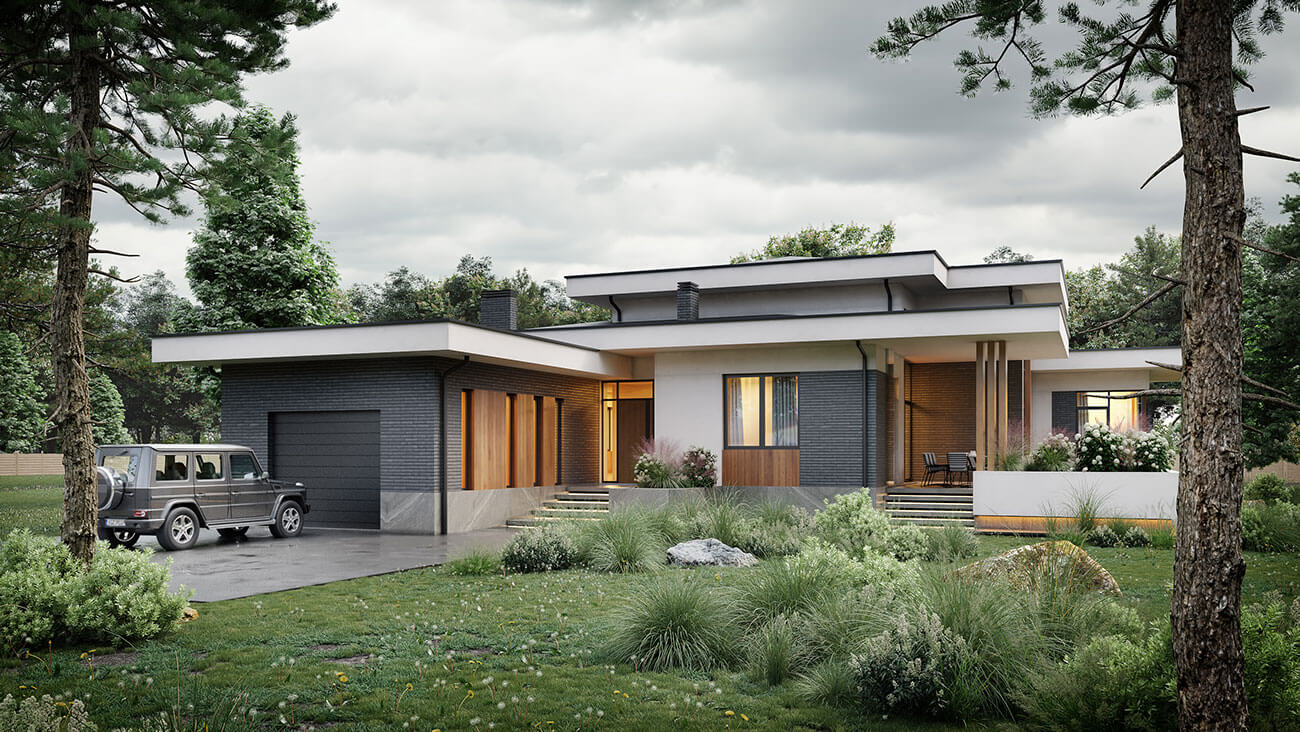Главная особенность проекта — это максимально удобная планировка. При входе находится общественная зона с большой гостиной, столовой и кухней, в отдельной зоне — хозяйственные помещения и приватная зона с главной спальней, детскими и гостевой спальнями.