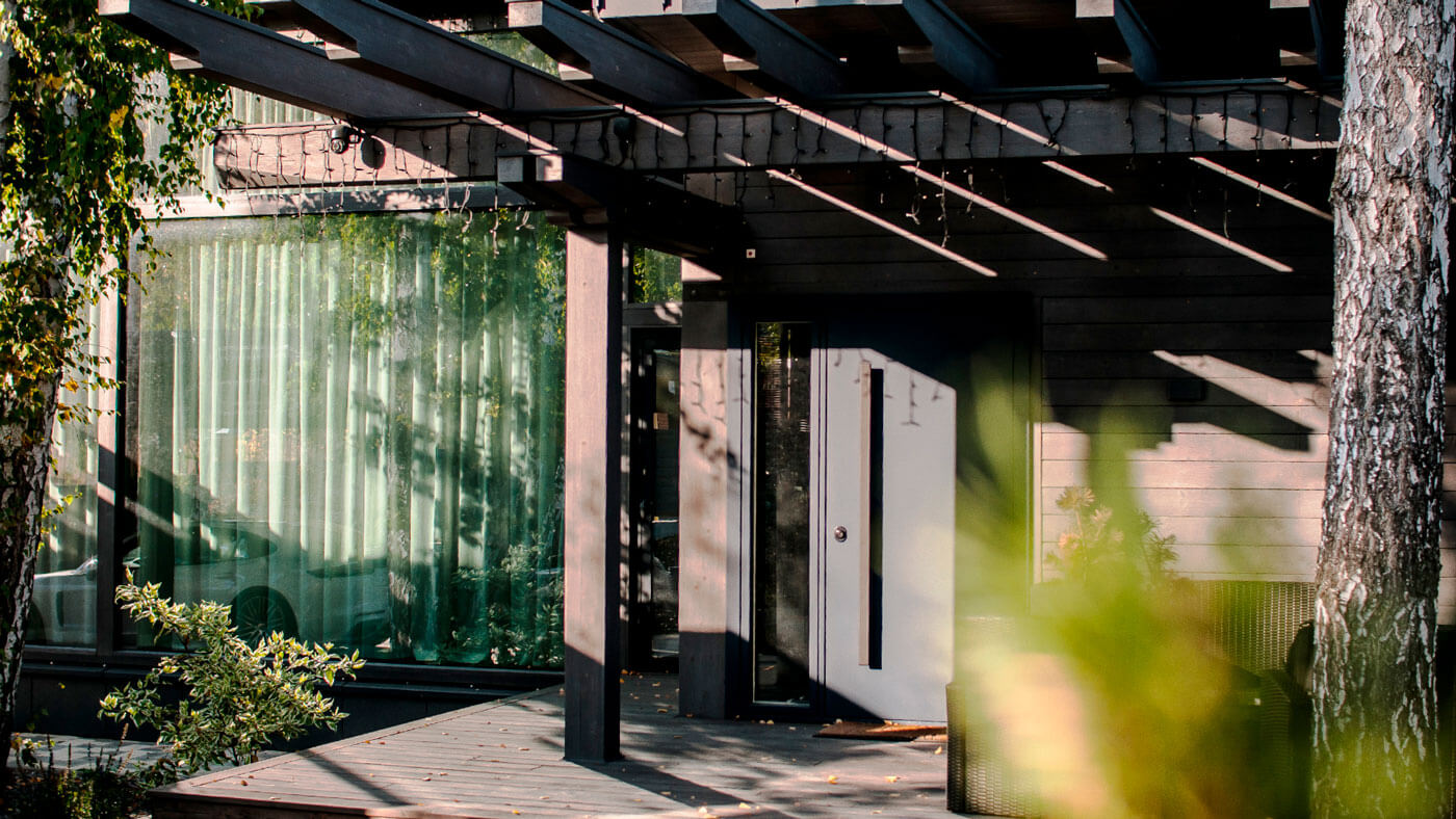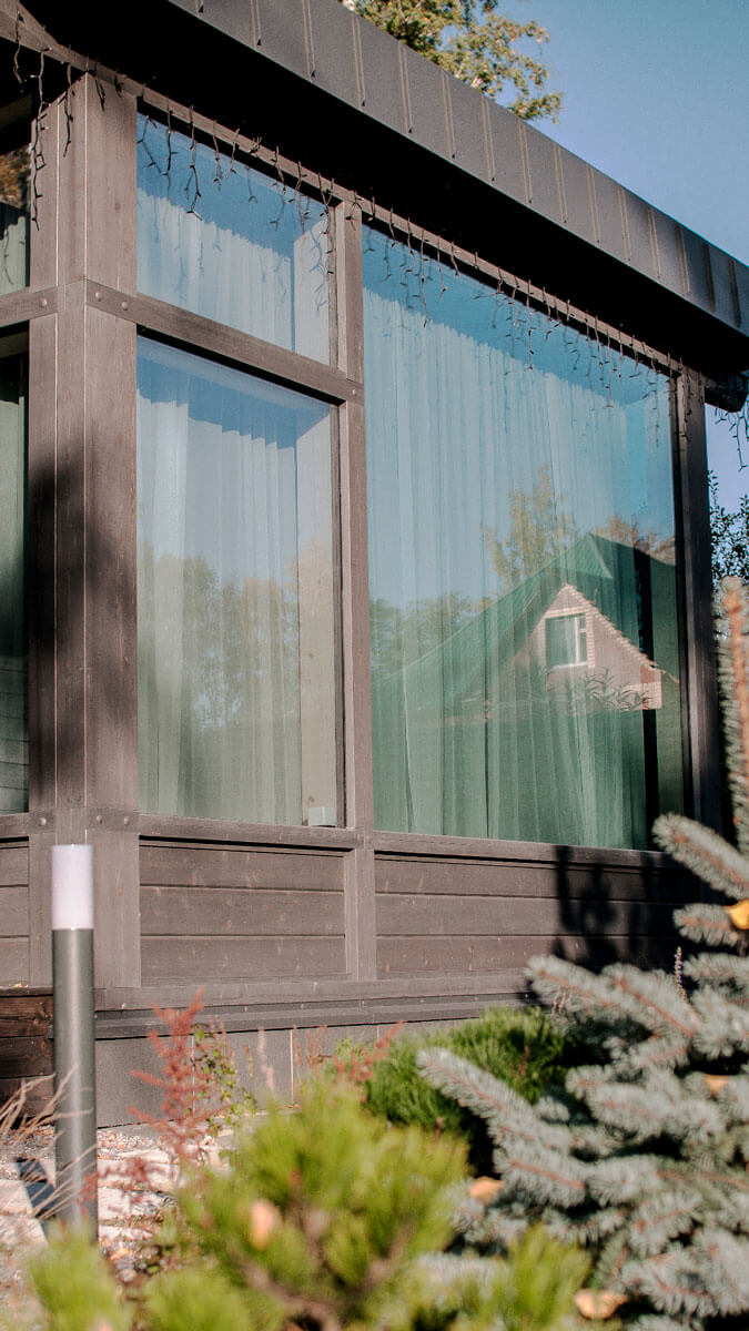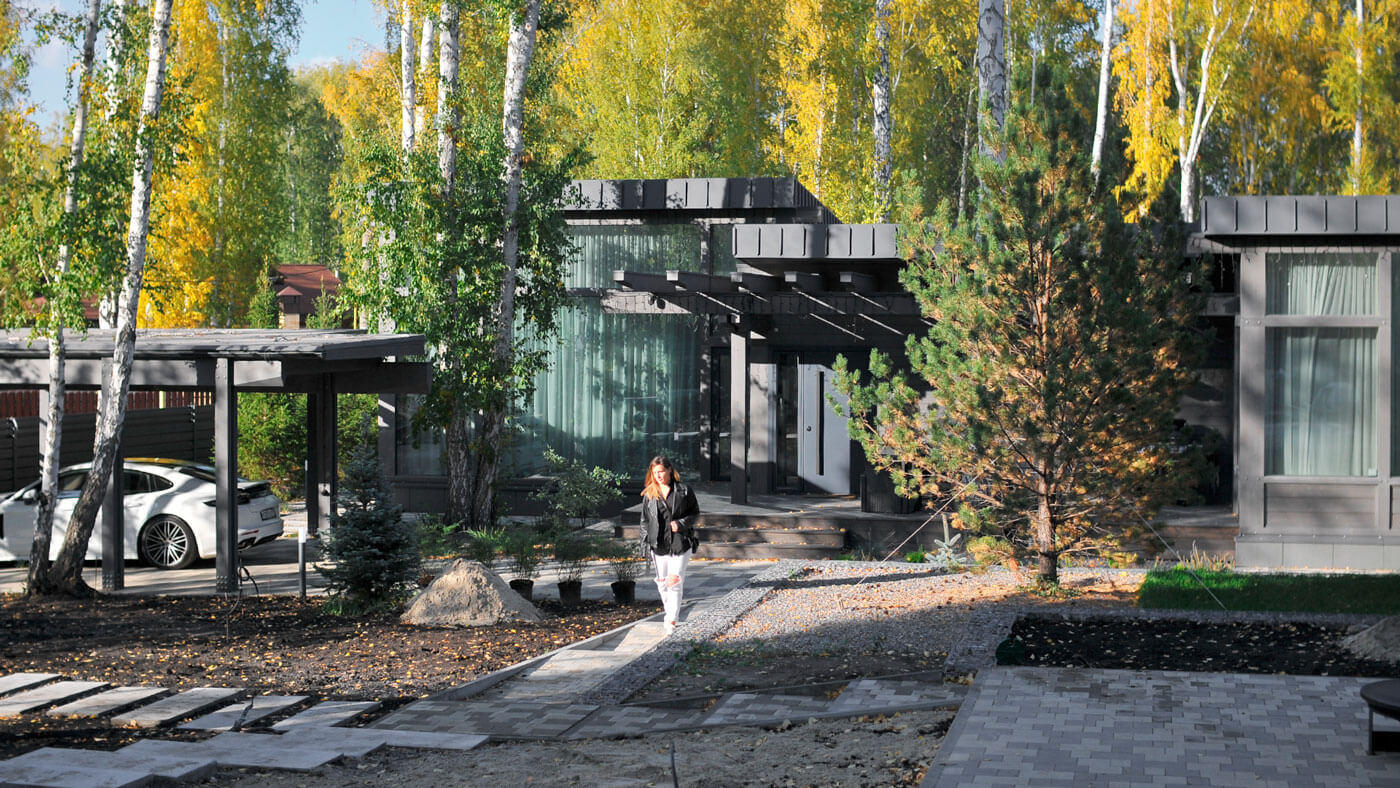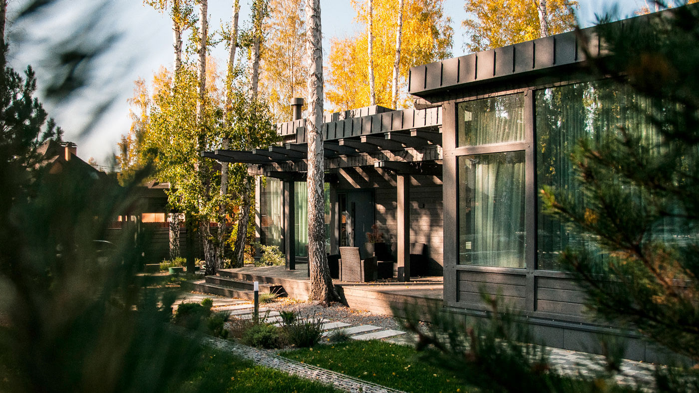 В проекте применена простая и лаконичная форма здания. Декоративные элементы созданы несущими деревянными конструкциями. Дом выглядит очень современно и актуально. Идеальное сочетание стекла и дерева соединяются в данном объекте. Особенностью данного проекта - интеграция в существующую природу. Дом запроектирован и построен по всем современным тенденциям и сохранит свою актуальность ещё долгое время.