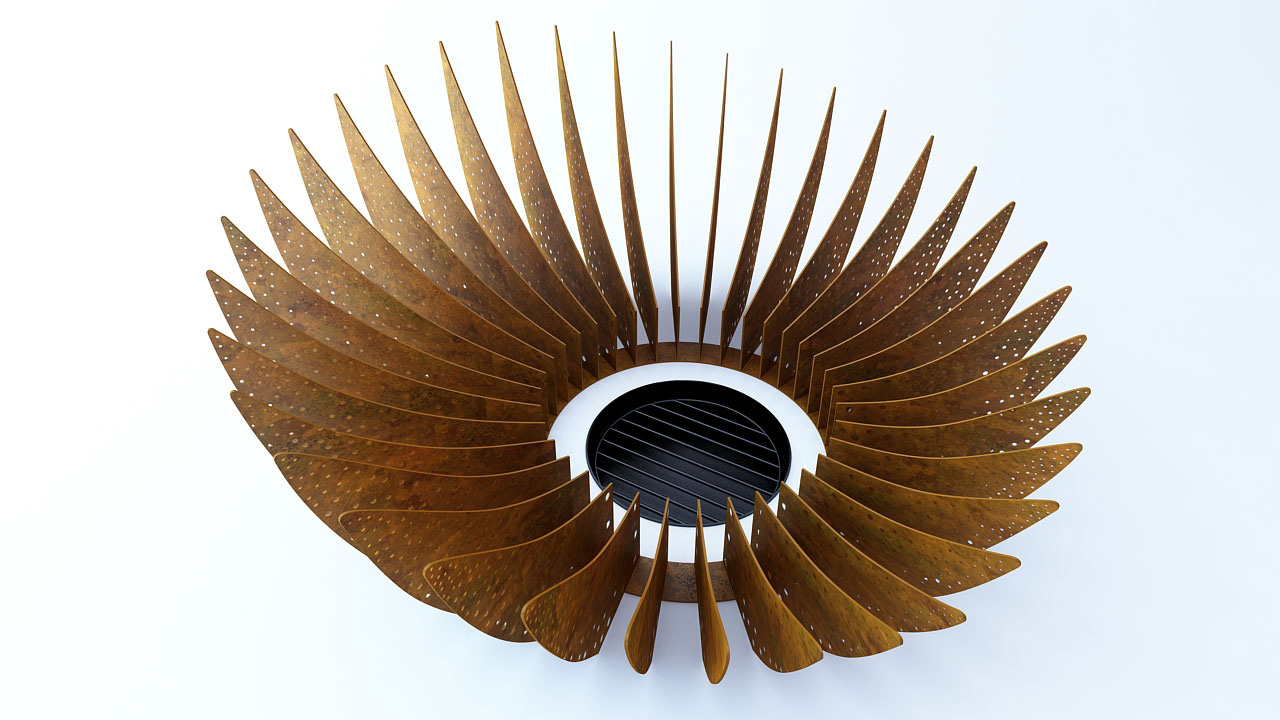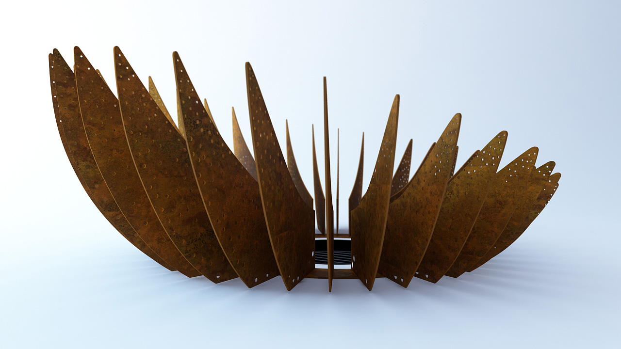 Основная конструкция состоит из множества лепестков переменного сечения из материала Corten. Художественная перфорация лепестков делает их более воздушными и эффектными в момент.