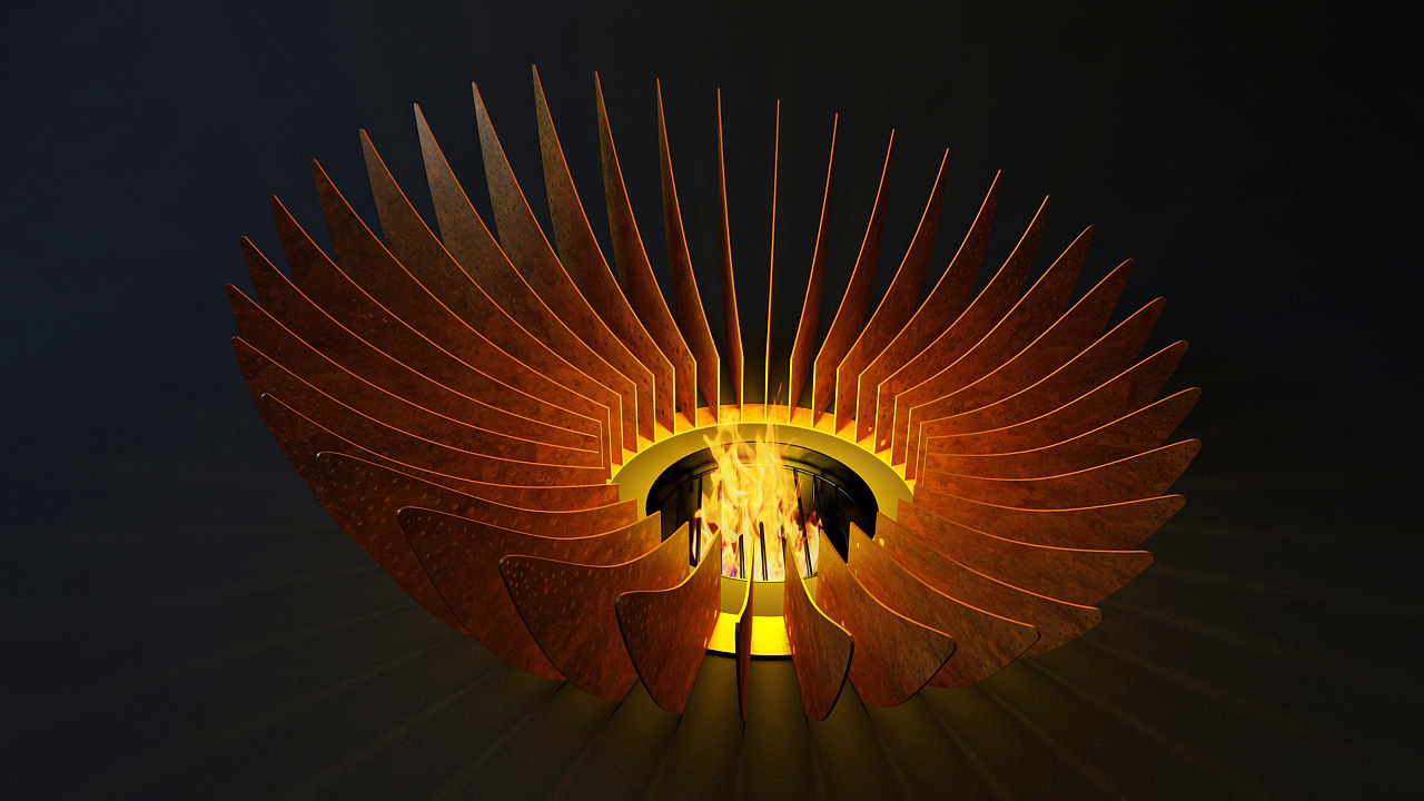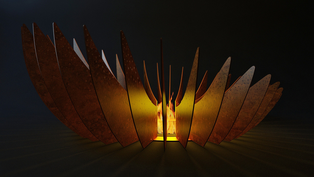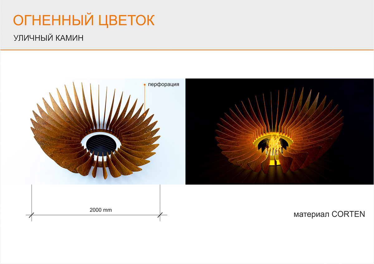 Центральный элемент — чаша-очаг. Асимметричное расположение лепестков позволяет сделать удобный доступ с одной стороны камина.