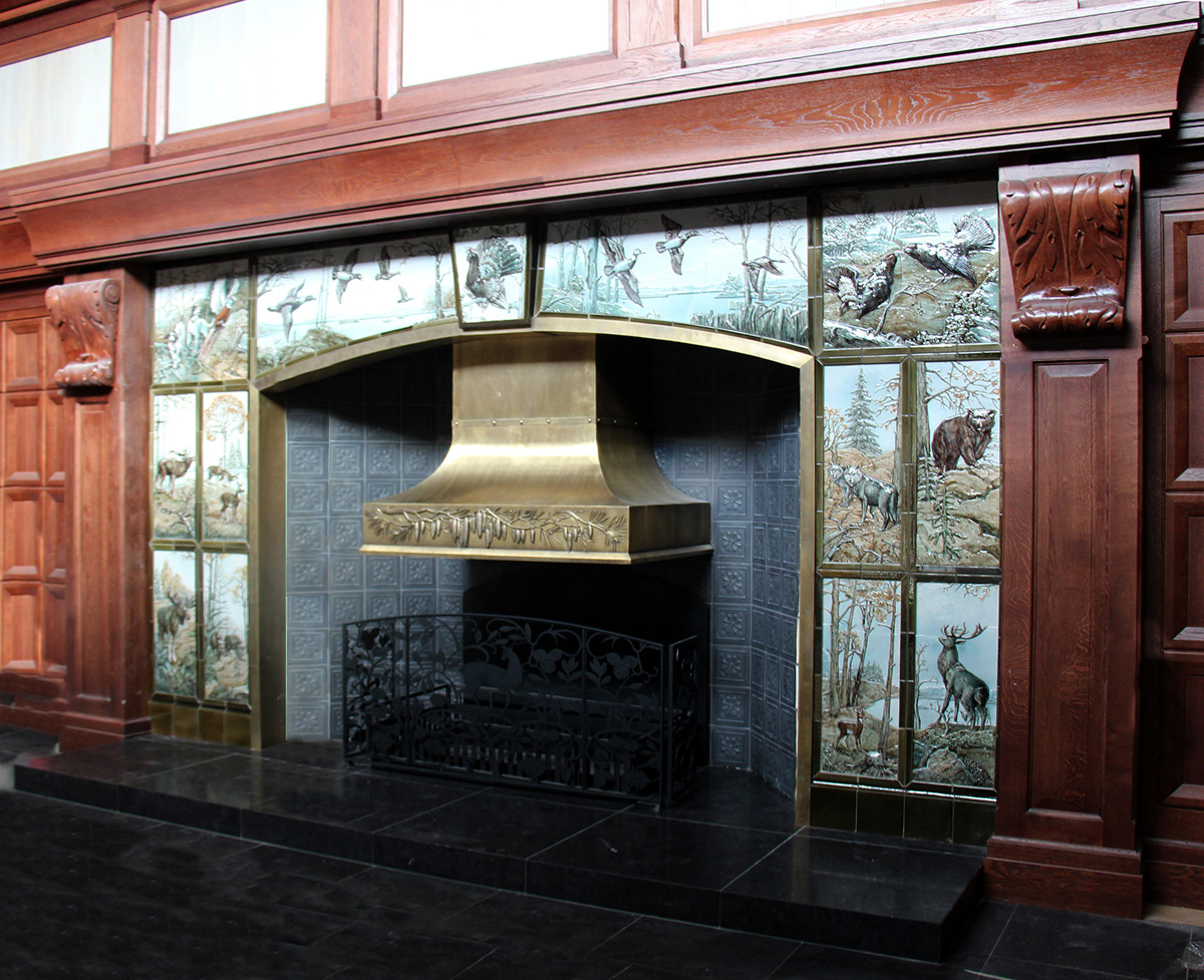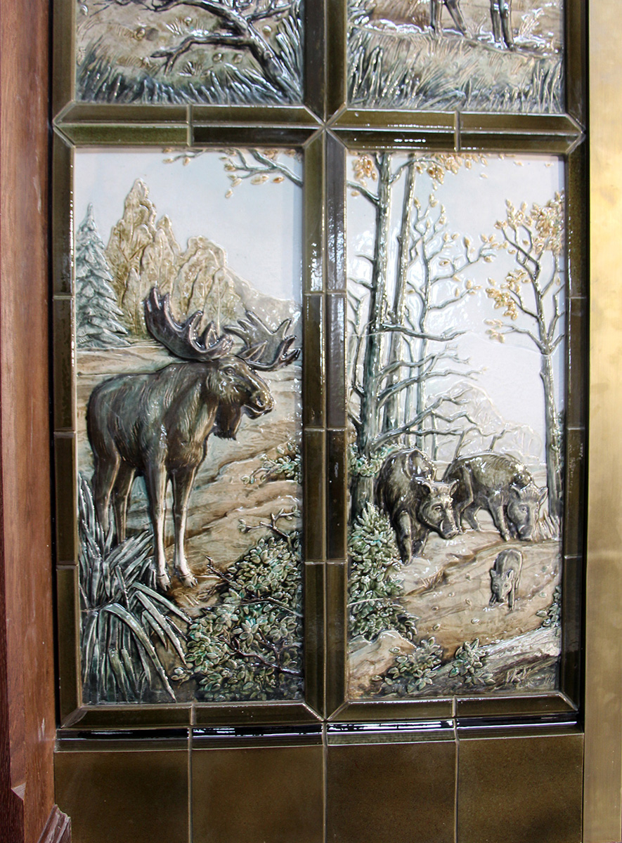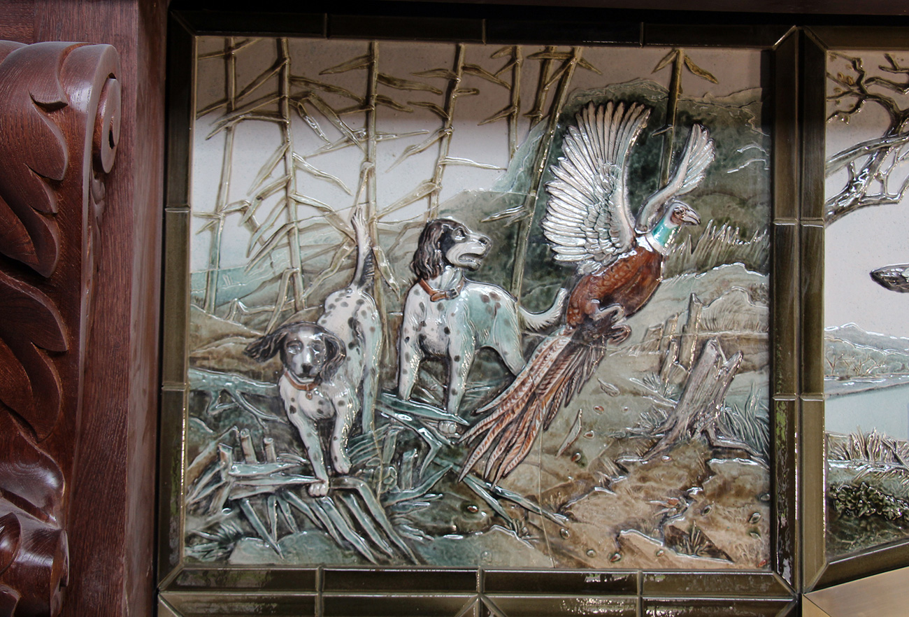 Изразцовый камин был выполнен для загородного дома с охотничьими угодьями, расположенного в живописных лесных пейзажах, которые стали центральной темой в оформлении камина.