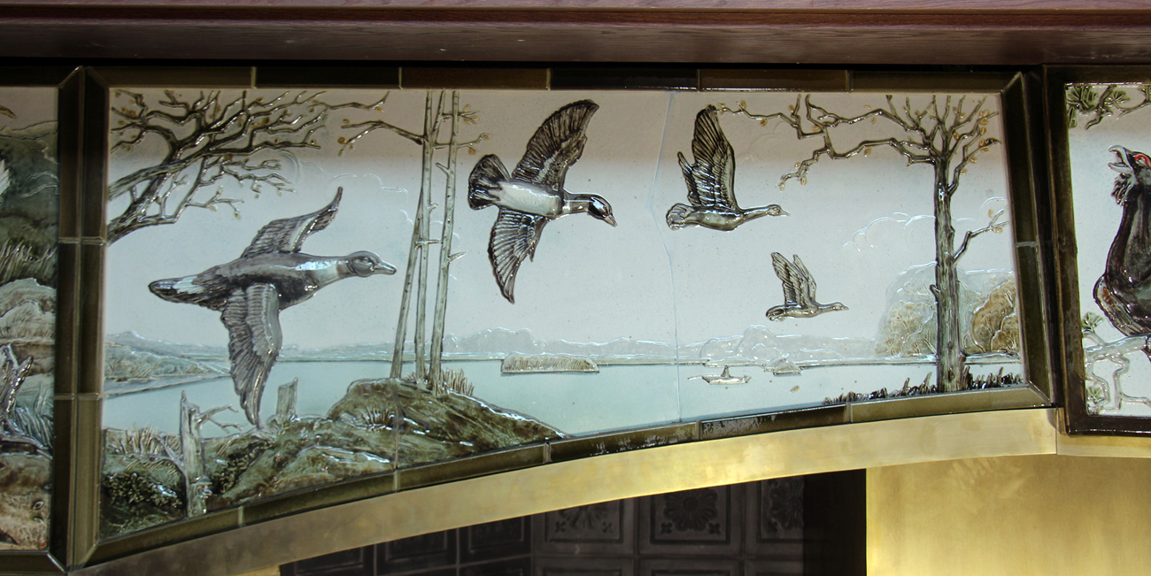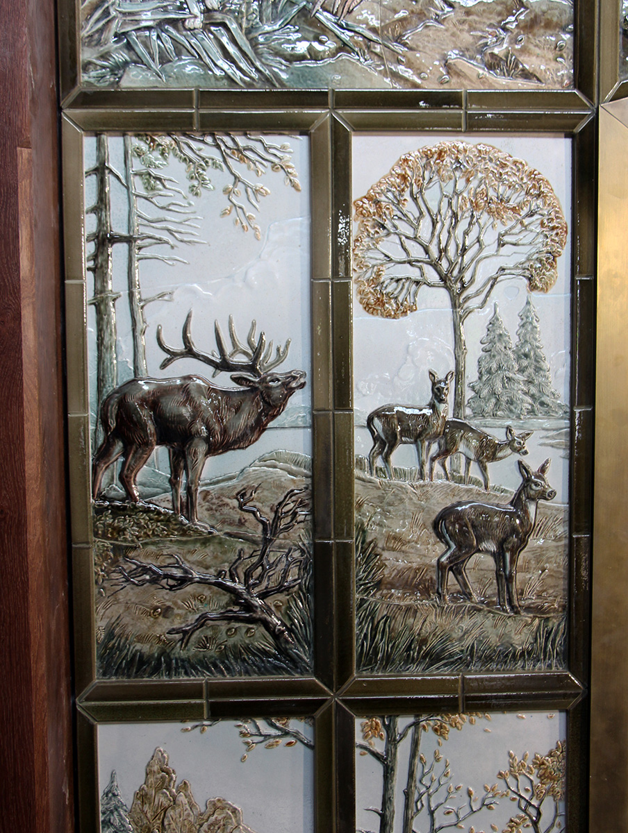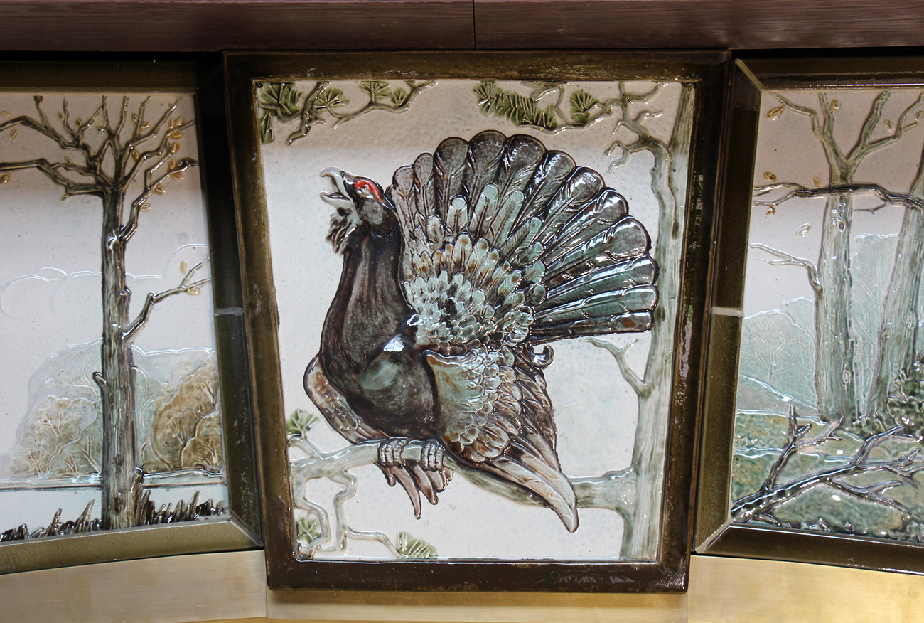 Изразцовый камин был выполнен для загородного дома с охотничьими угодьями, расположенного в живописных лесных пейзажах, которые стали центральной темой в оформлении камина.
