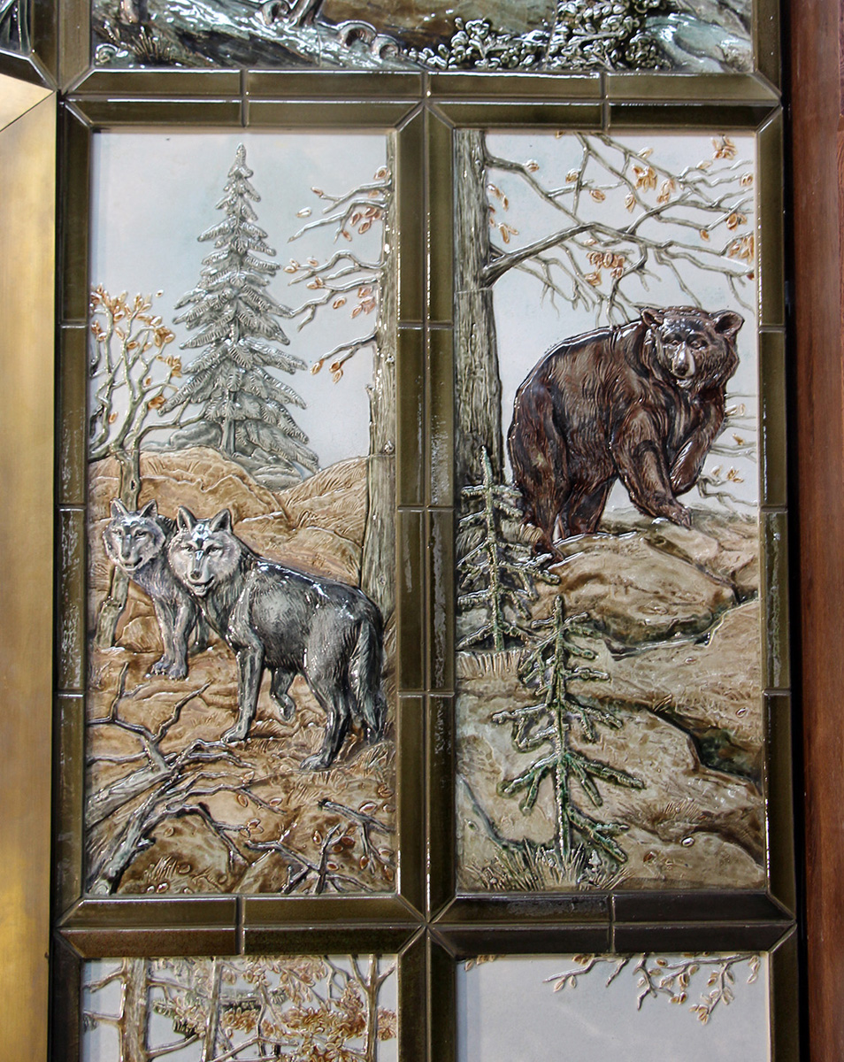 Облицовка выполнена в виде художественного панно, составленного из нескольких изразцов, каждый из которых представляет собой самостоятельное произведение, посвященное своеобразию природы региона. Скульпторы и художники мастерской обратились к наследию реалистической пейзажной школы и разработали уникальные сюжеты и композиции, учитывая особенности керамики как материала.