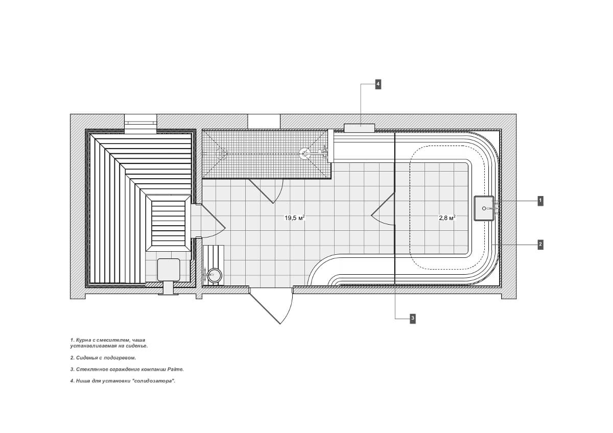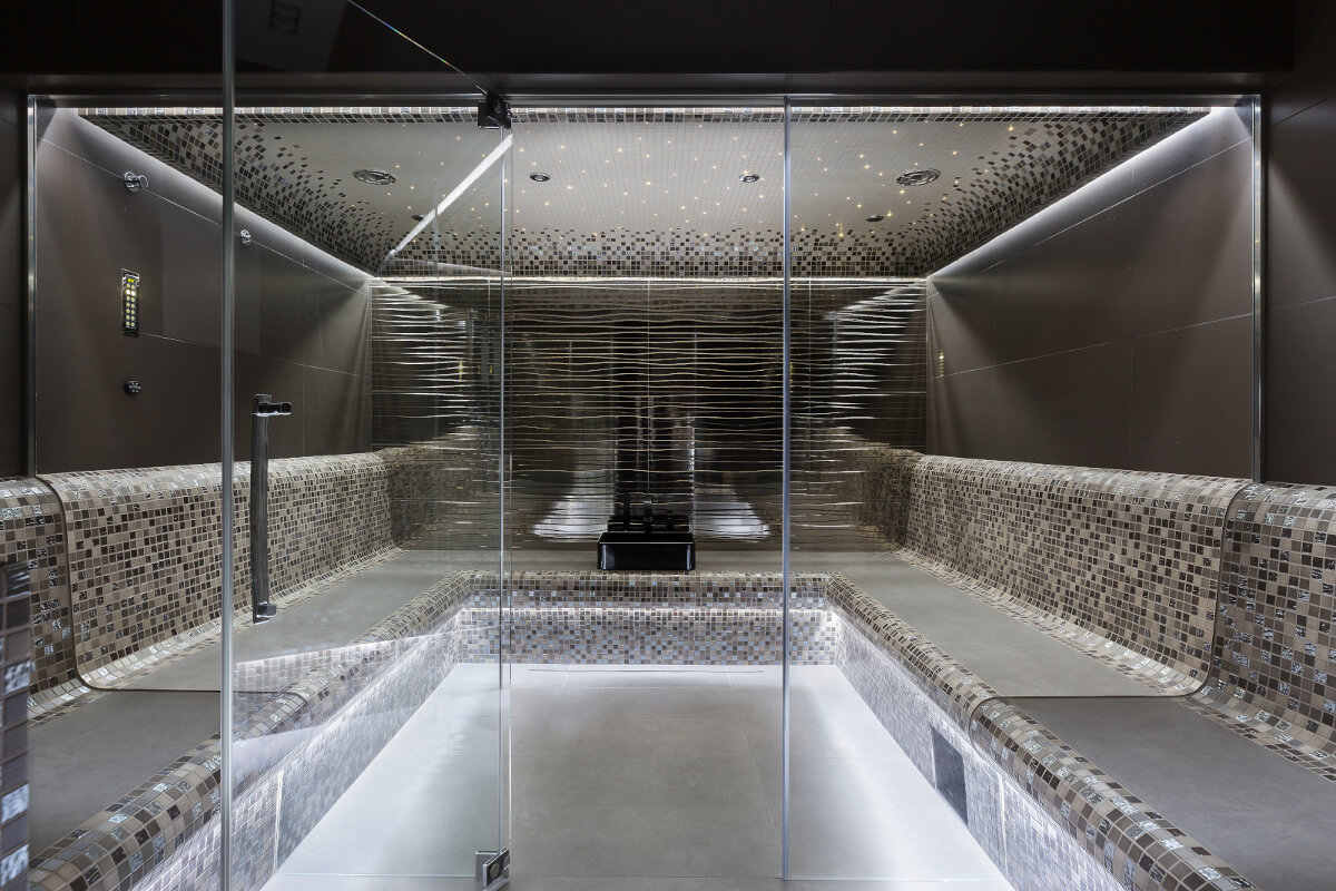 В хамамме и зоне отдыха лавки с подогревом. Лавки хаммама по замыслу дизайнера проходит сквозь стеклянное ограждение.