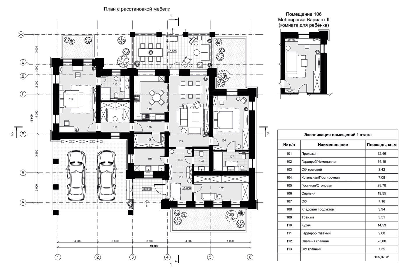 Не выходя из-под навеса для двух автомобилей, можно пройти ко входу в дом. Просторная светлая прихожая с большой гардеробной/чемоданной и гостевым санузлом ведёт в гостиную. Из гостиной можно выйти на крытую уютную уличную террасу с видом на внутренний двор. В прихожей находится котельная/постирочная и кладовая продуктов при кухне. Кухня может быть изолирована от гостиной за счёт сдвижных дверей. Личные комнаты расположены в разных концах дома, что обеспечивает приватность пространств. Спальни имеют отдельные санузлы, зоны хранения одежды и рабочие места. В мастер-спальне также спроектированы французские балконы с видом на сад. В доме предусмотрен люк на чердак для дополнительного хранения вещей. Минимальное количество коридоров и оптимизированный план помогают использовать каждый квадратный метр усадьбы нового времени для жизни.