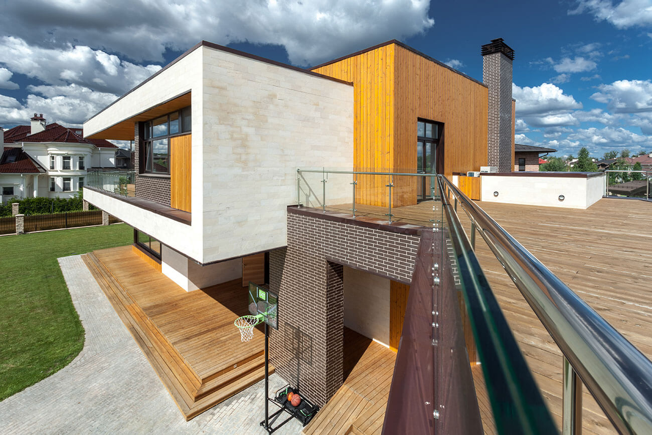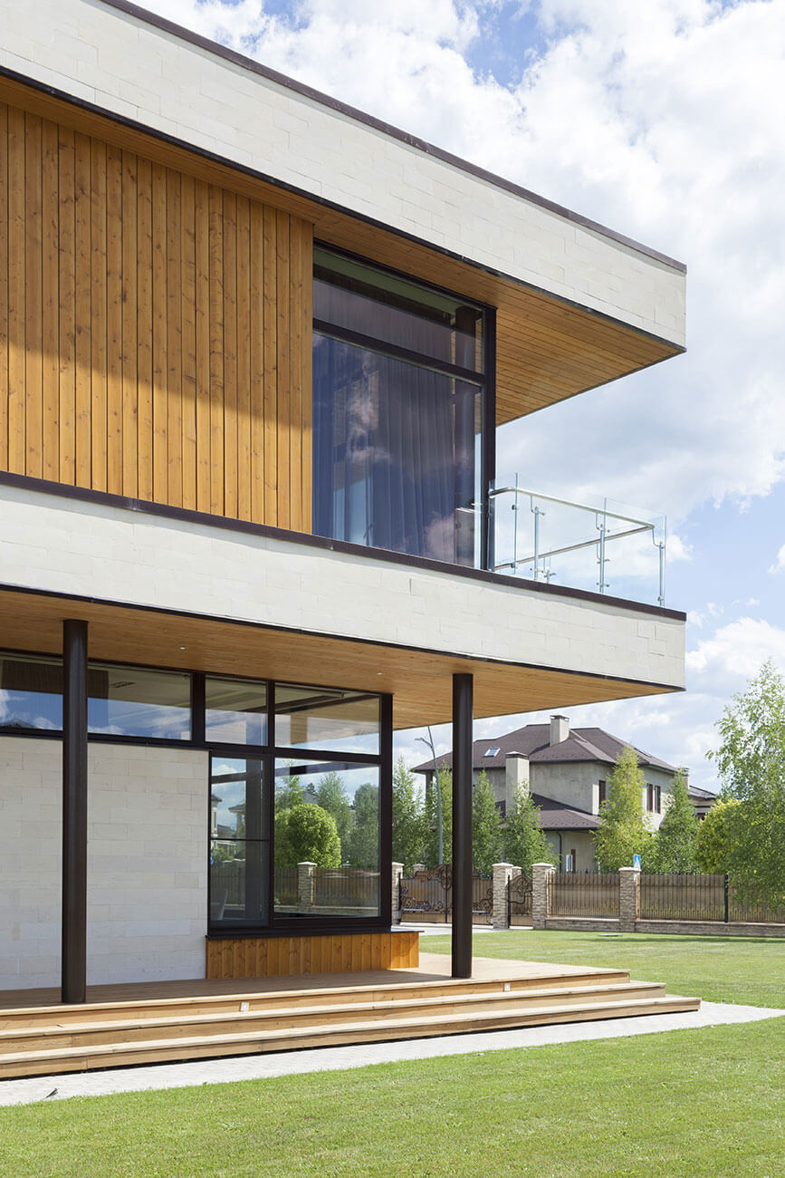 Дом построен в авангардной стилистике. Простейшие, казалось бы, формы, тем не менее они довольно трудны и в проектировани, и в строительстве.