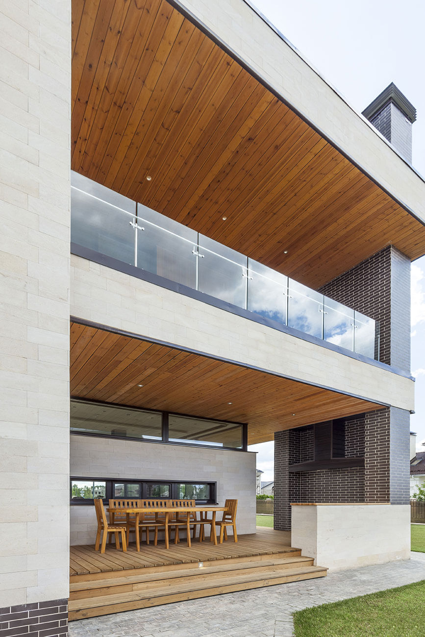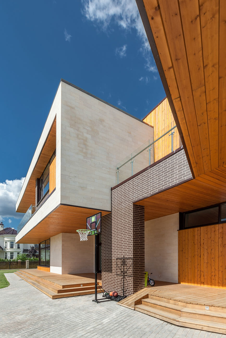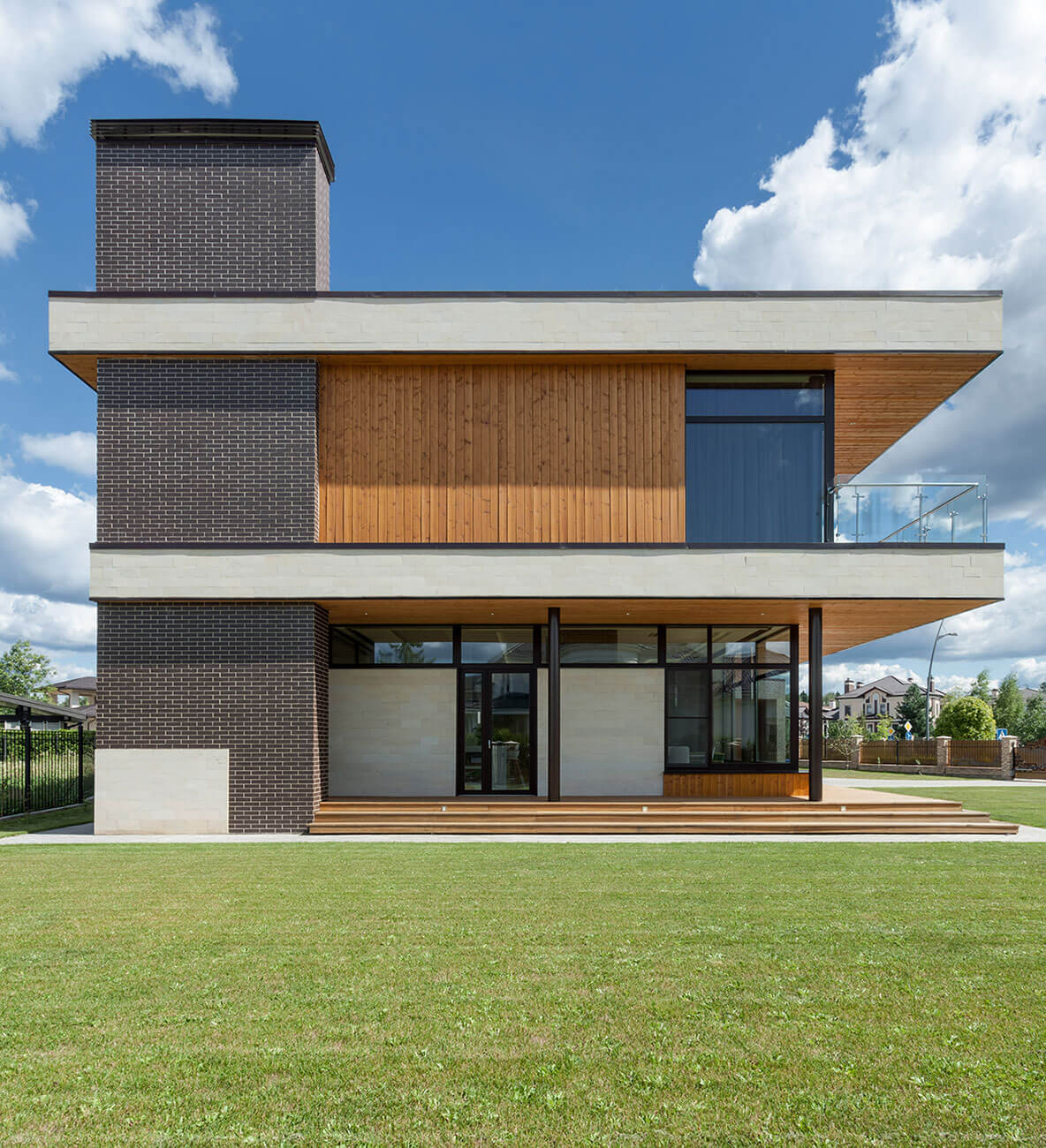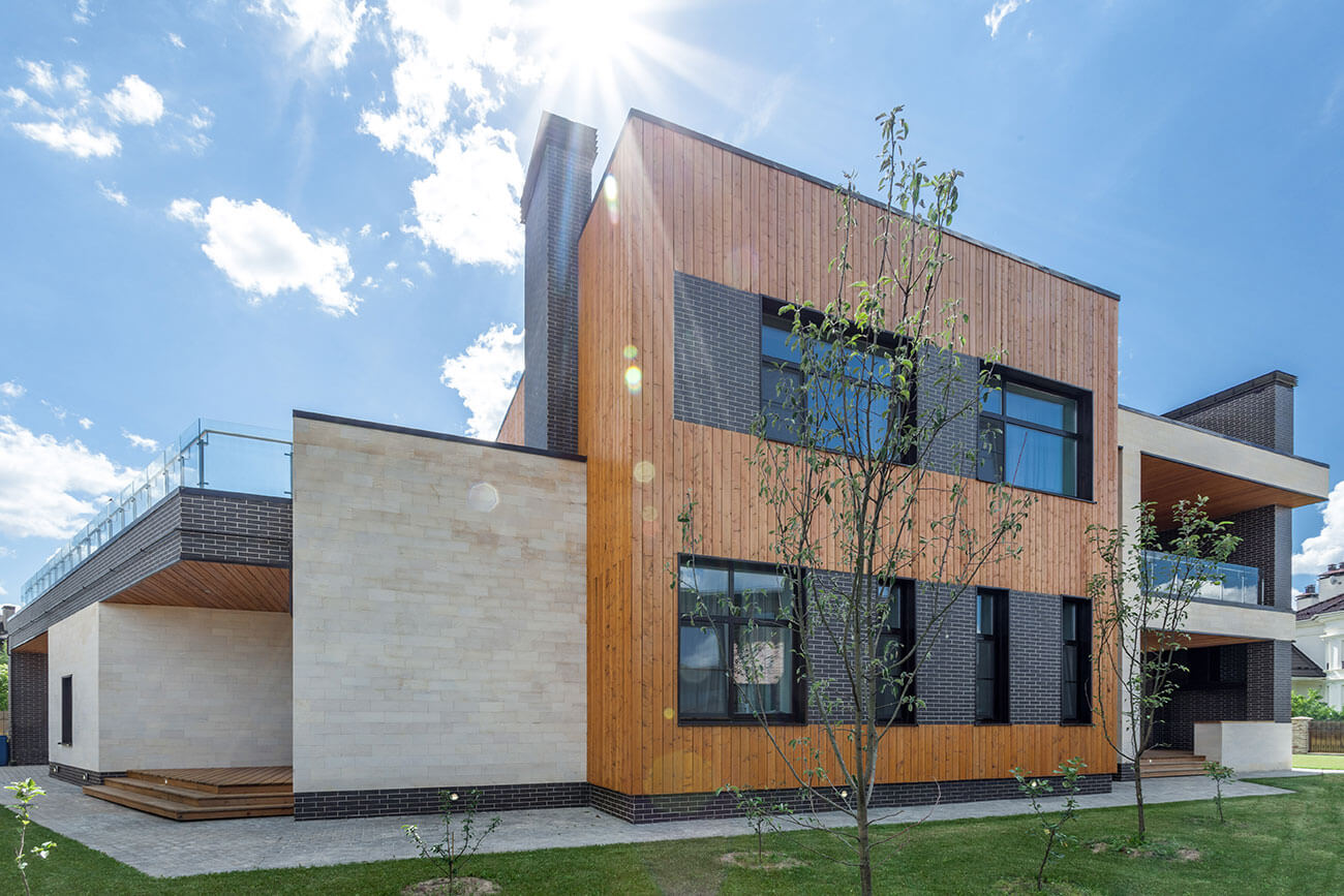 Использование в разных плоскостях натуральных материалов, таких как деревянный планкен, белый известняк и клинкерная плитка, придает силуэту здания динамичность. Разные по цвету прямоугольники складываются в единый объем.