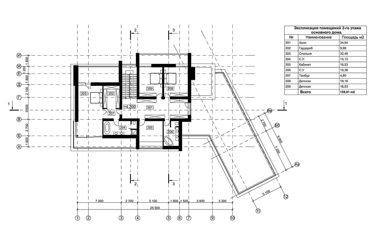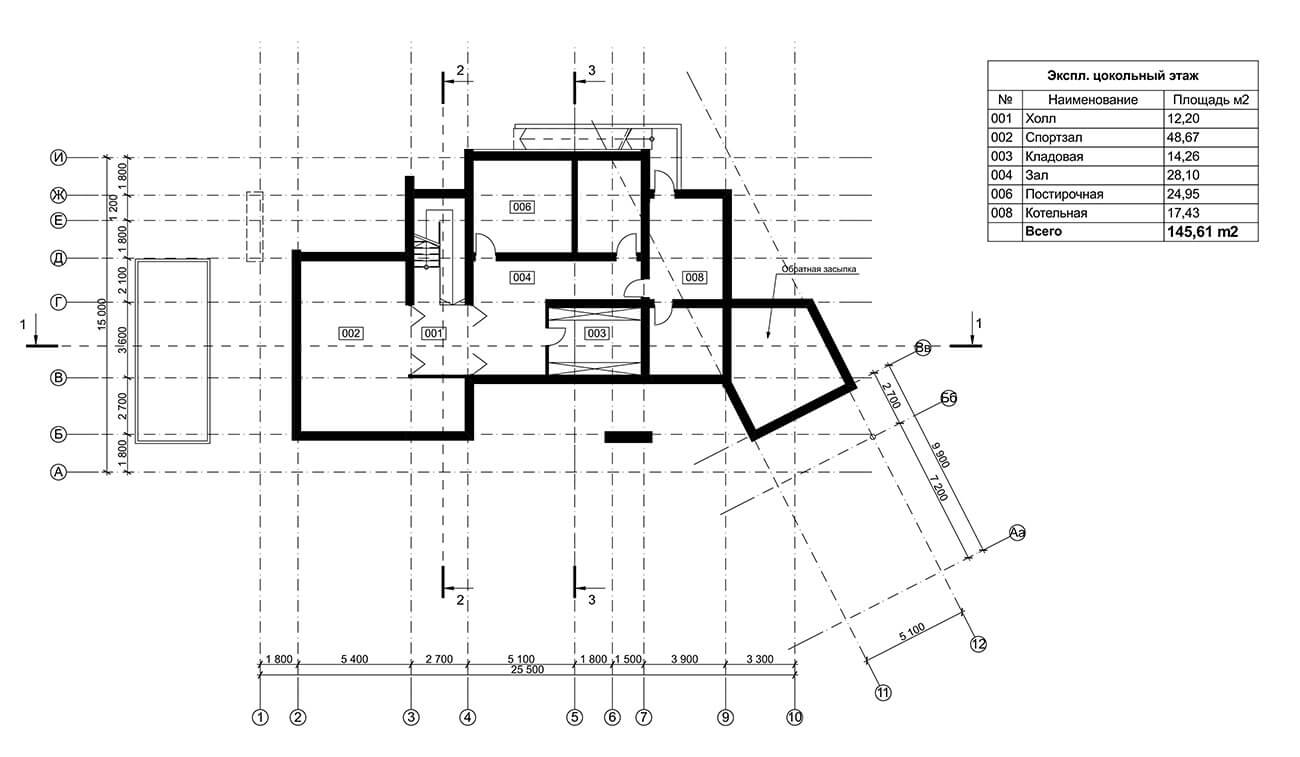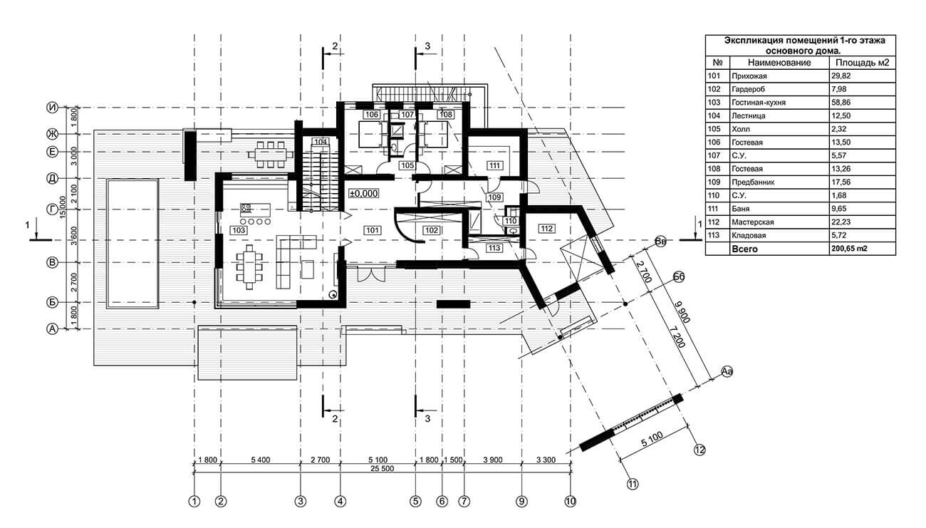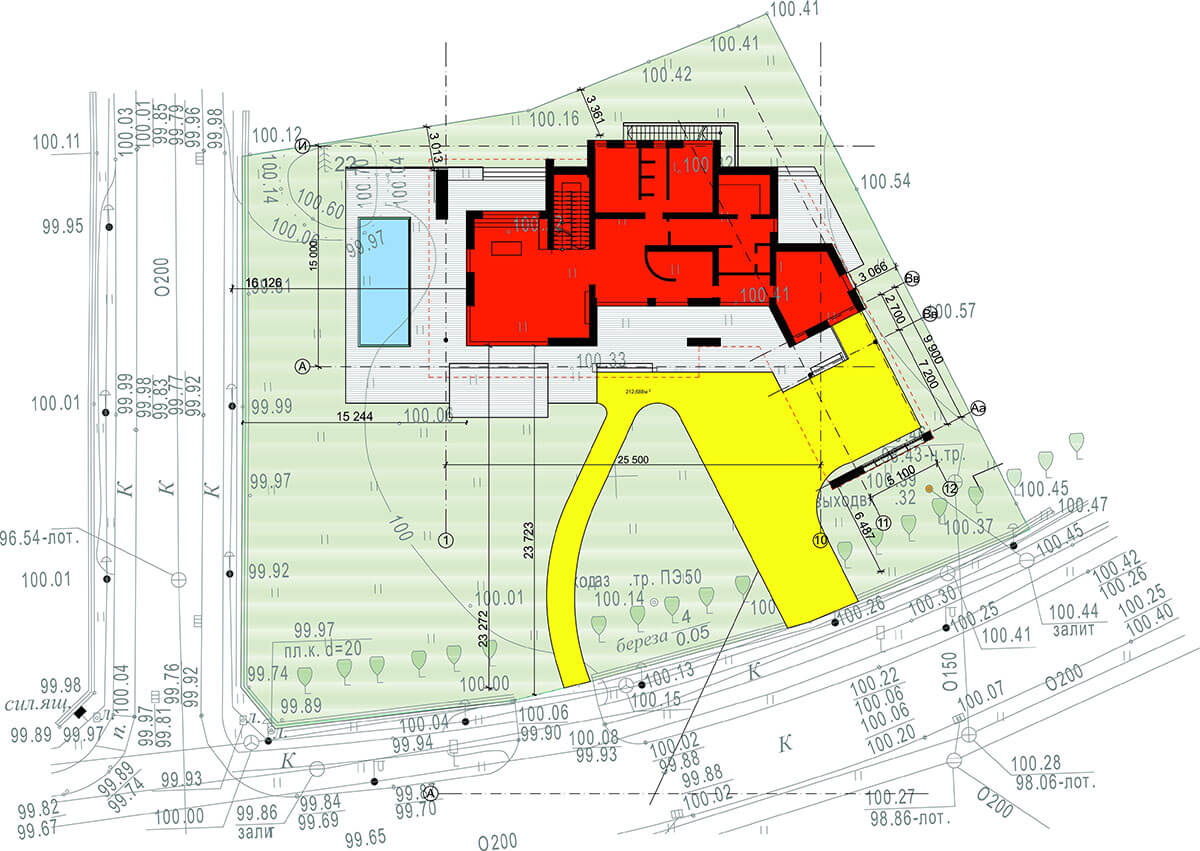 Дом сдвинут к границе с соседями, а гараж развернут под углом к основному корпусу, в целом план дома следует геометрии участка. Общественные пространства и гостевые комнаты размещены на первом этаже, приватные и детские — на втором, спортивные и технические помещения — в цокольном.