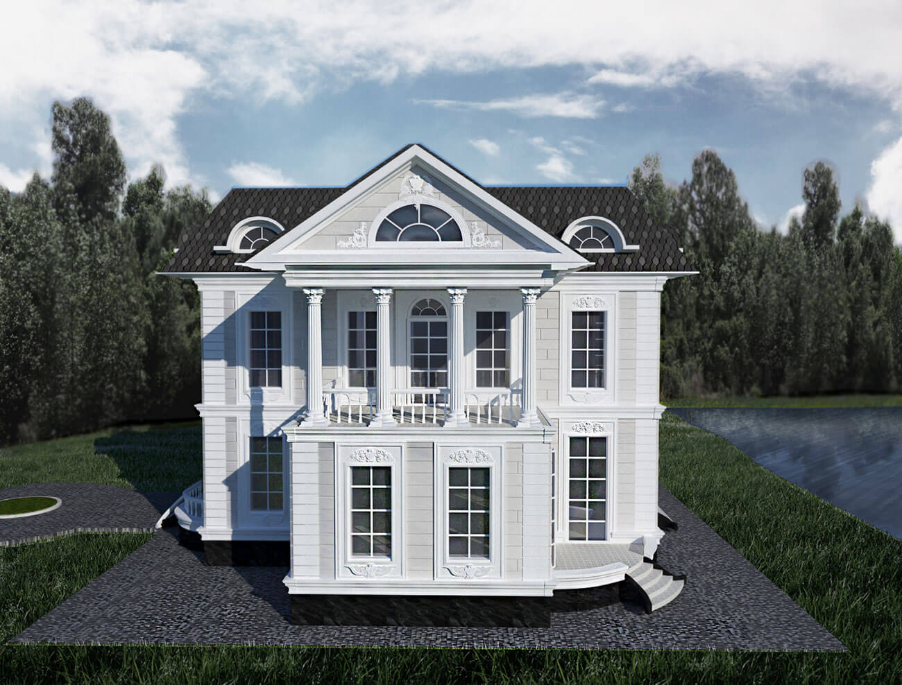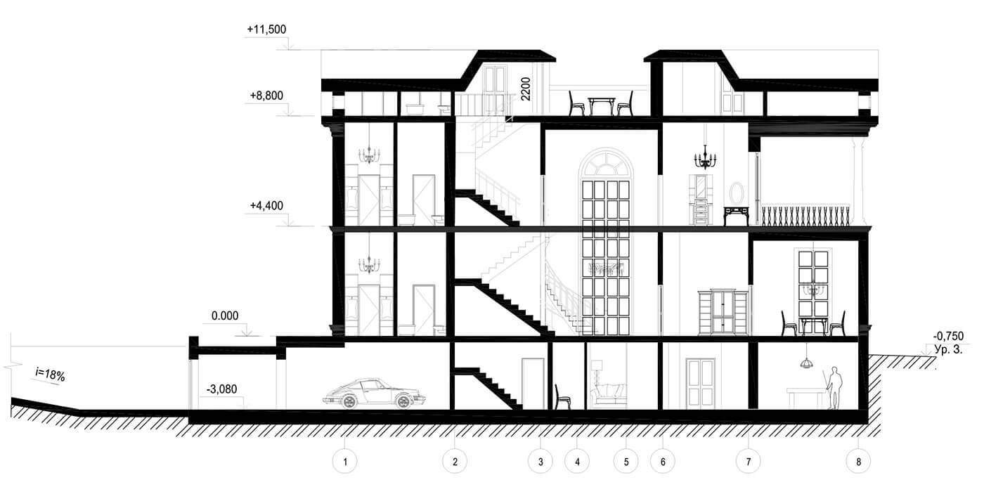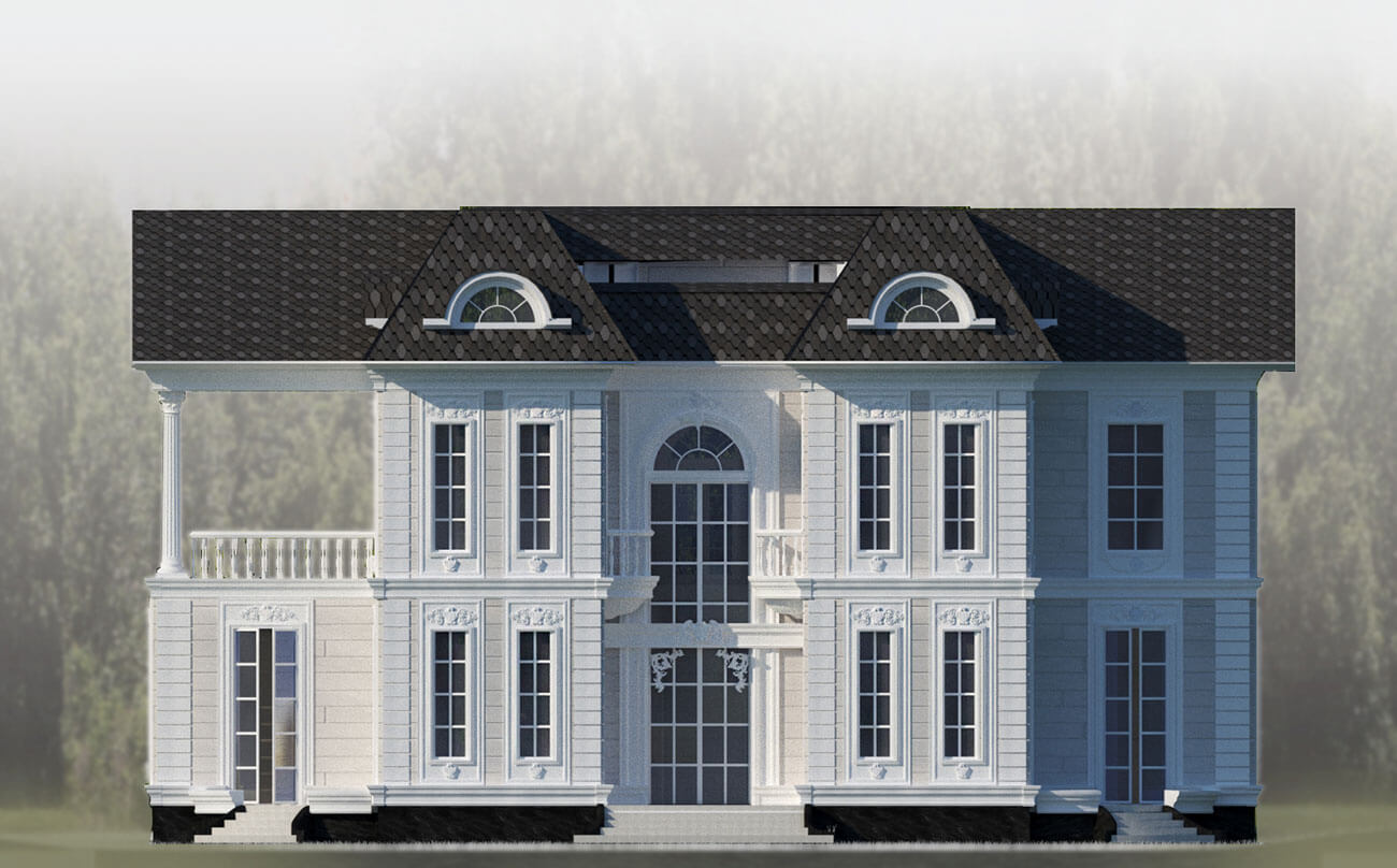 Пространство особняка формируется симметрично относительно главной композиционной оси дома. Гостиная, располагающаяся на первом этаже, освещена вторым светом и имеет витражное остекление на всю высоту. Данное пространство является общим на два этажа и связывает все планировочные элементы. Здесь же располагается парадная винтовая лестница, соединяющая два этажа. В данной зоне 5 спален (включая гостевую), в каждой из которых предусмотрены индивидуальные санузлы и гардеробные, а также выходы на лоджии и террасы. Для теплого времяпрепровождения предусмотрены каминный зал, пранзо (обеденный зал) — для семейных обедов. На втором этаже располагается библиотека, на первом — кабинет.