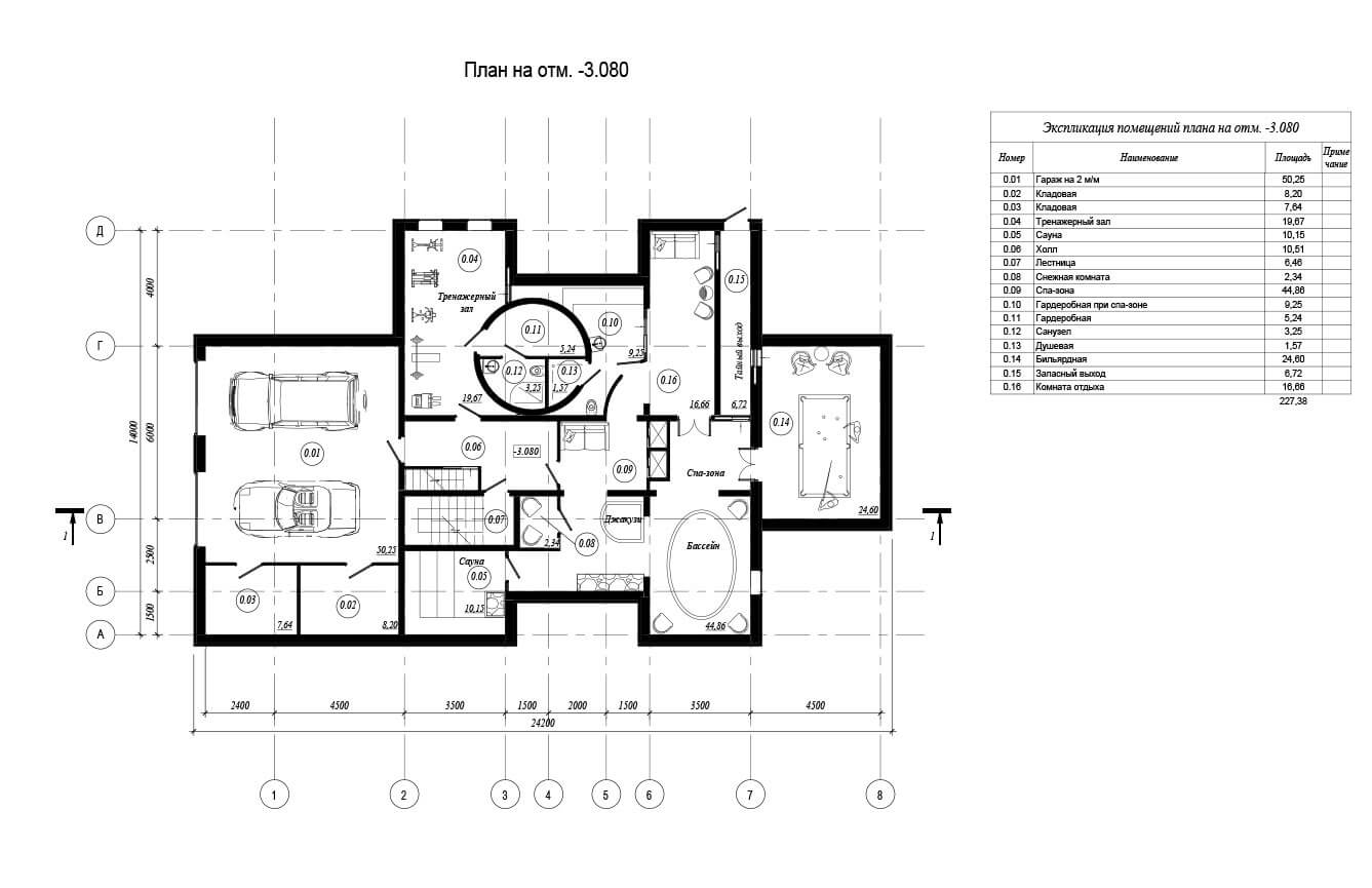 В цокольном этаже находятся спа-зона с бассейном, сауной, снежной комнатой и комнатой отдыха. Предусмотрены тренажерный зал и бильярдная.