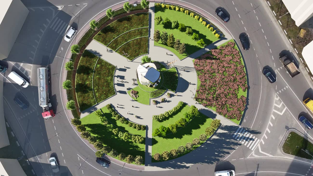 Масштабируемый сад представляет собой модульную центричную композицию, которая заполняет круглый сквер в центре кругового перекрестка. Этот проект вполне может быть масштабируемым и многократно применятся в различных комбинациях для решения транспортных развязок.