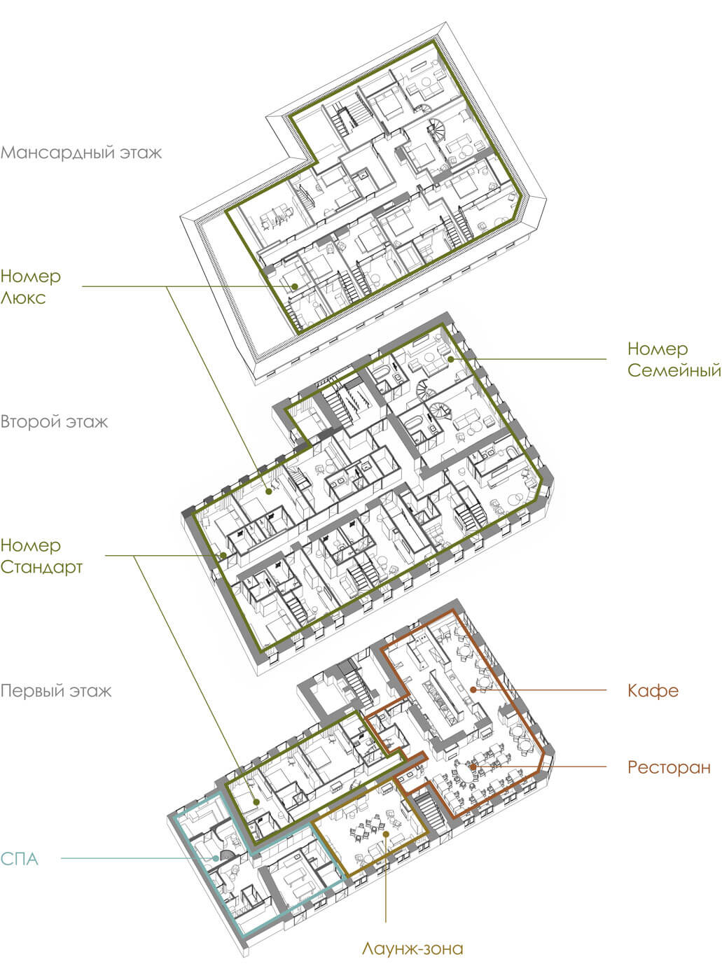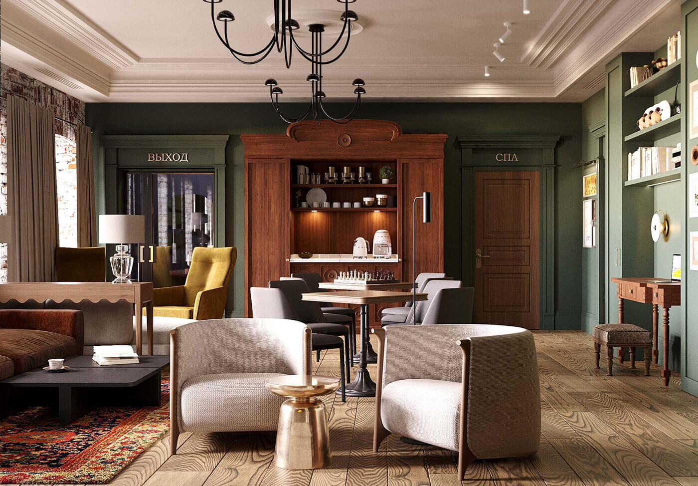 Отель «Дом Демидова» — бережная реанимация доходного дома 1852 года в бутик-отель. Вместо привычного ресепшн — чайная гостиная с камином, облицованным белоснежными изразцами со сказочными зверями: здесь начинается сценарий гостеприимства. Номерной фонд — 1-й этаж с приватными террасами и основной блок на 2 этаже, где антресоли задают вертикальный ритм, а контрастные прихожие в глубоких терракотовых и зелёных тонах формируют характер. В больших номерах — винтовые лестницы, отдельно стоящие ванны; везде — продуманная эргономика и доступная среда.