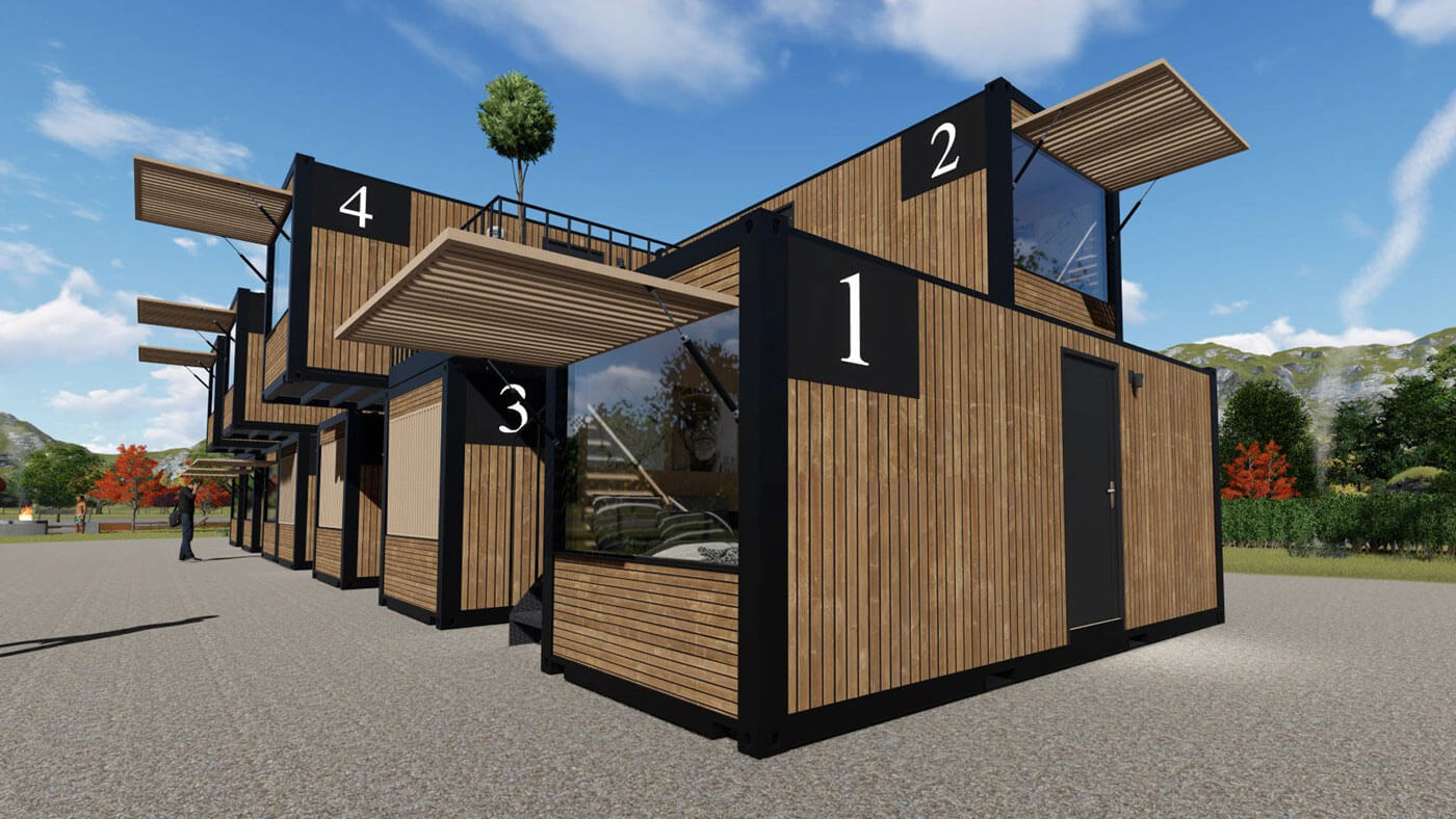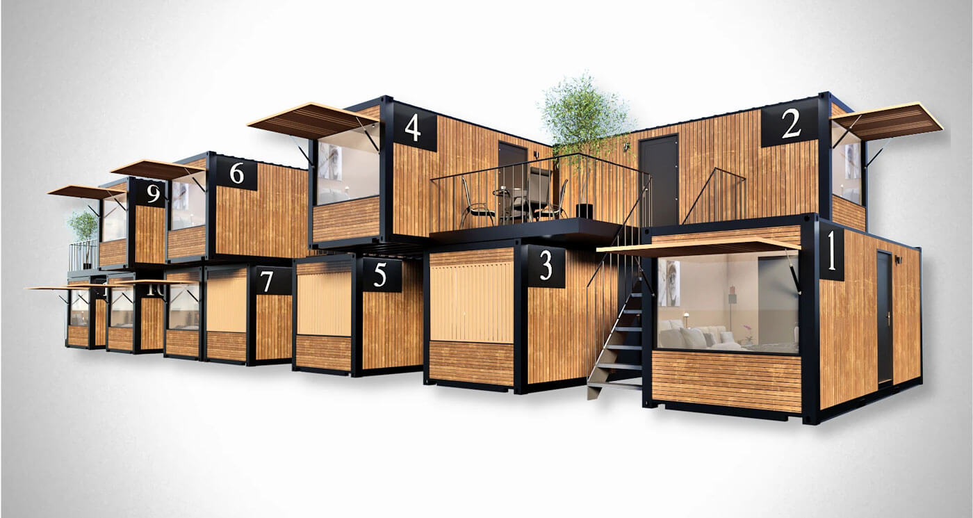 Концепция отеля из транспортных контейнеров — это пример прогрессивной модульной архитектуры, выразительно переосмысливающей типовые индустриальные объекты как гибкие современные пространства для проживания. Архитектура этого отеля строится на композиционном комбинировании стандартных крупноразмерных контейнеров, размещённых в два уровня и сдвинутых относительно друг друга по горизонтали и вертикали.