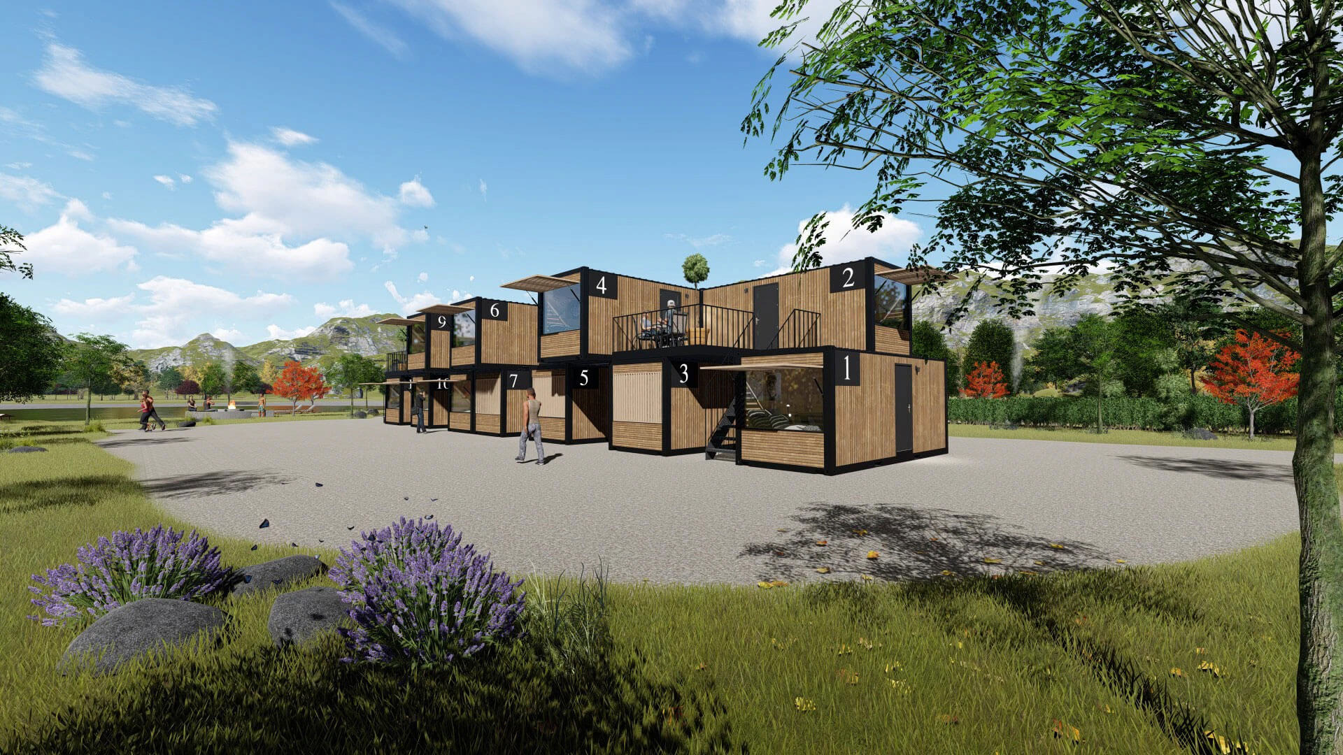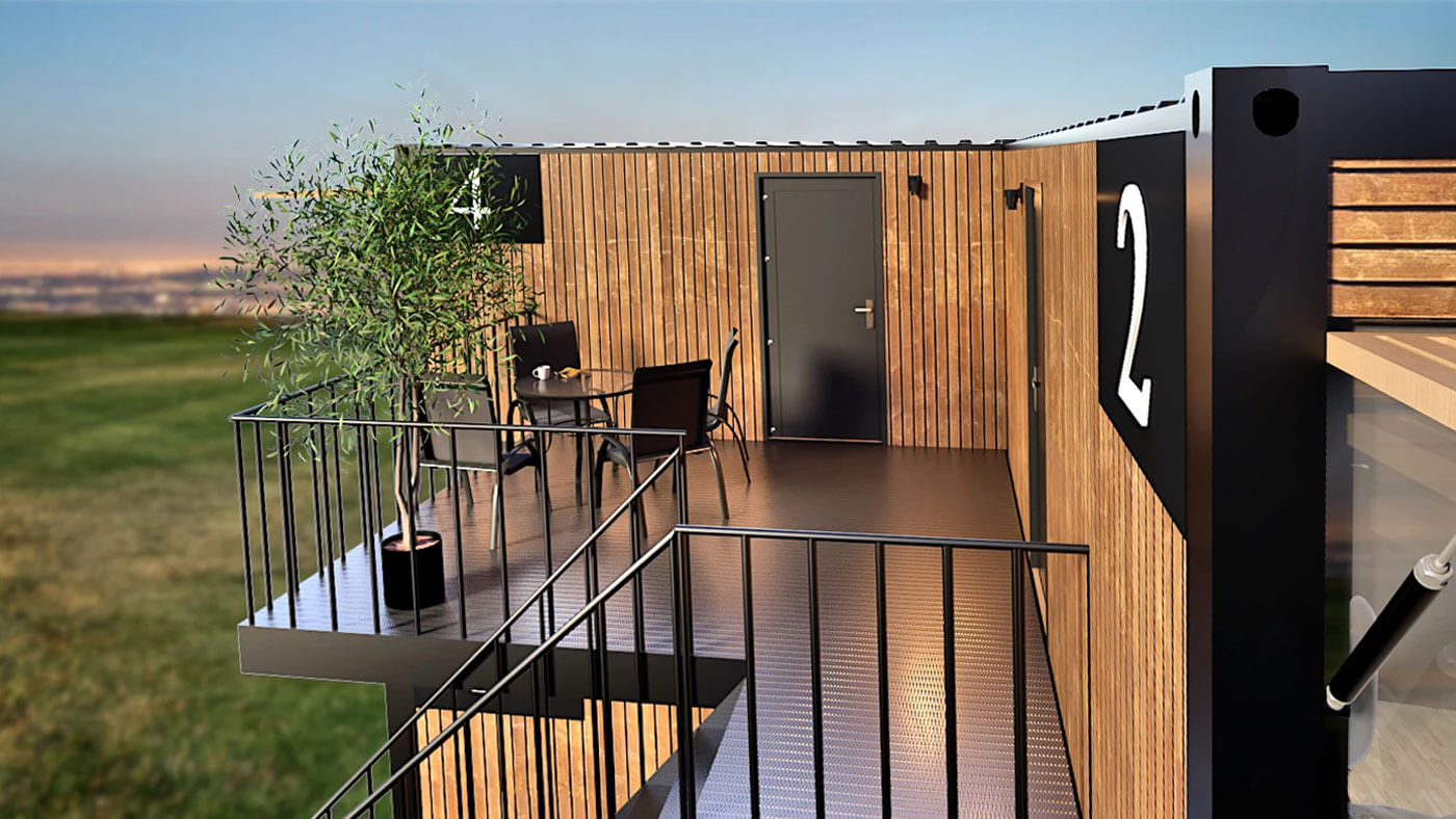 В результате необычного монтажа блоков формируется единый и ритмичный фасад здания, развивающийся как архитектурный конструктор: линии, углы и выносы контейнеров определяют динамичный силуэт комплекса. Каждый блок имеет свою индивидуальную террасу — либо на первом уровне, либо на эксплуатируемой кровле второго, что обеспечивает приватность и ощущение личного пространства для каждого гостя. Современное решение — балконы-террасы, образованные выступами верхних модулей, ставшие ключевыми пространственными и визуальными акцентами.