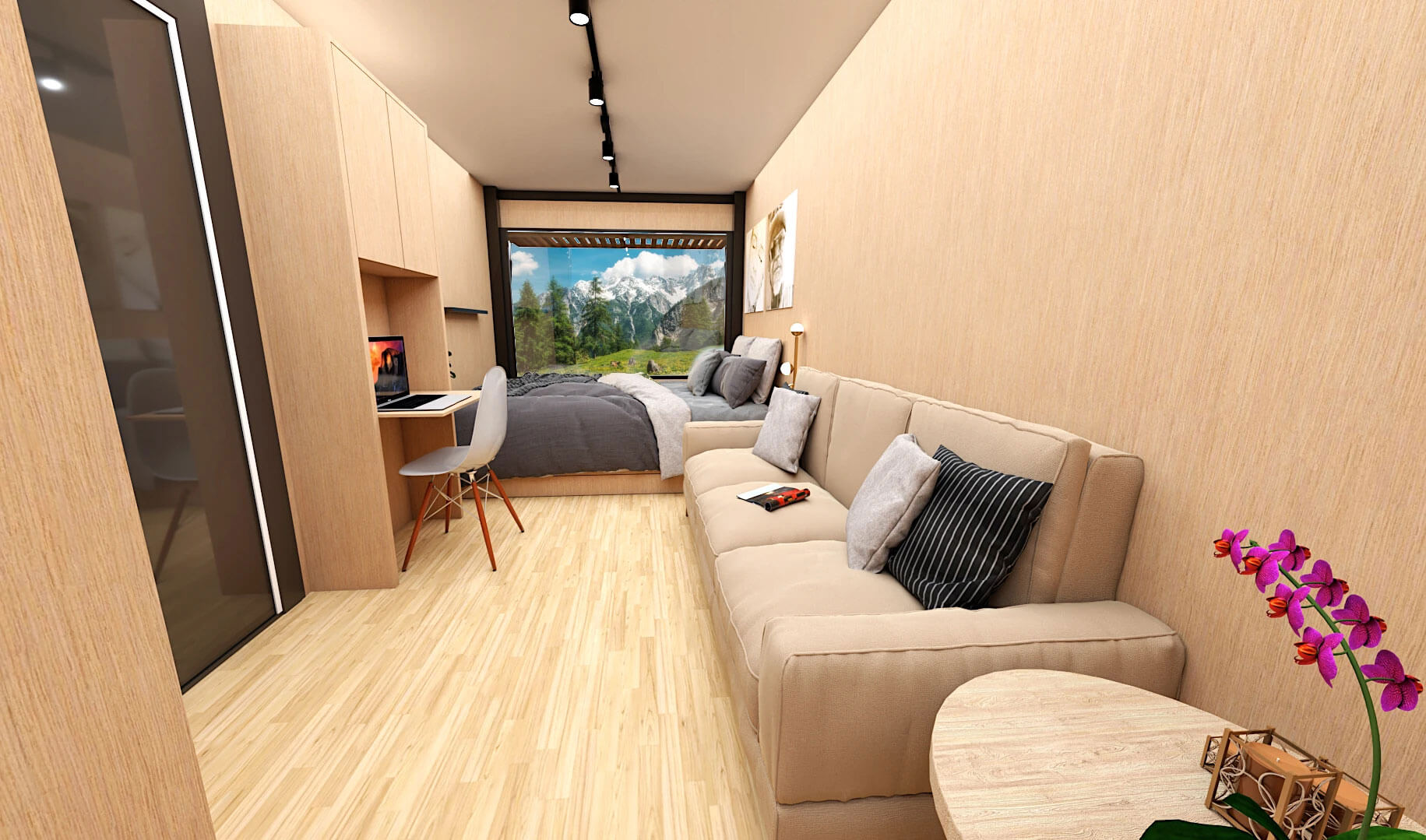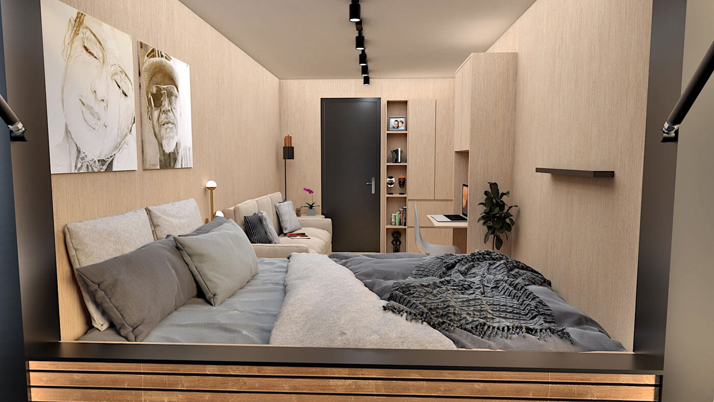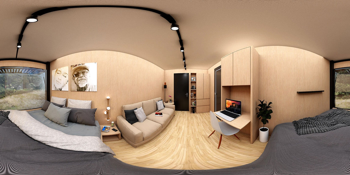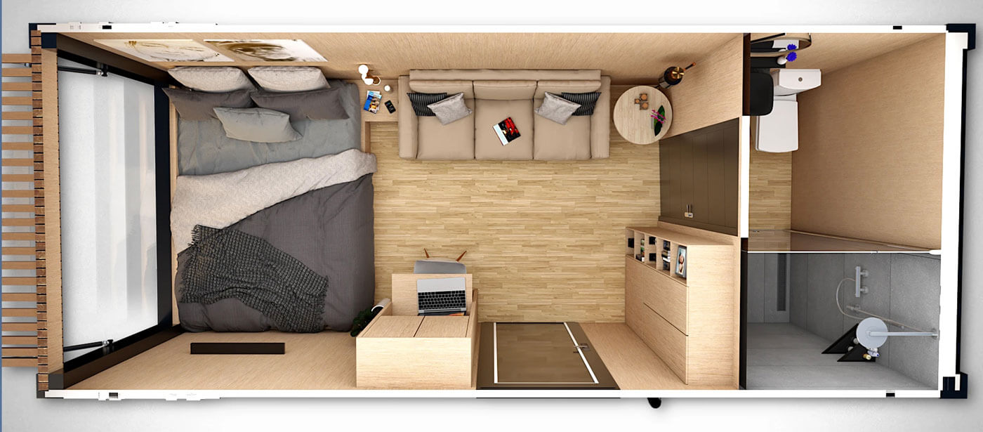 В интерьере контейнеров пространство оптимизировано под современные стандарты уюта, эргономики и визуальной легкости. Использование натурального дерева в отделке сглаживает индустриальное происхождение модулей и обогащает интерьер тактильностью и домашним уютом.