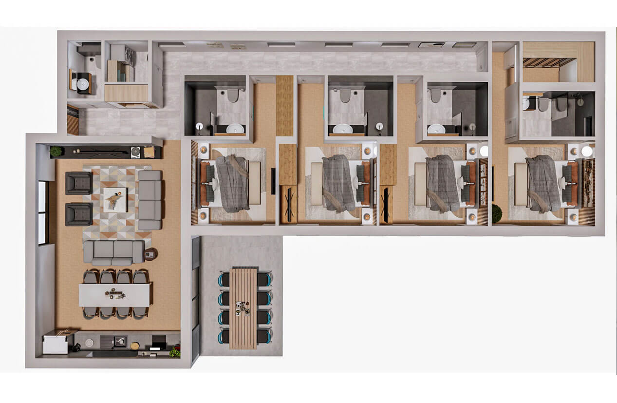 Планировка отеля продумана до мелочей для обеспечения максимального комфорта гостей. Внутреннее пространство выстроено по классическому коридорному принципу: приватная зона (ряд отдельных комнат с собственными санузлами) отделена от общественной части, где размещены просторная гостиная и столовая. Кухонная зона интегрирована с обеденной группой: это способствует непринуждённому общению и функциональности при сервировке ужинов и завтраков.