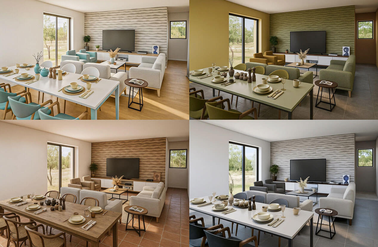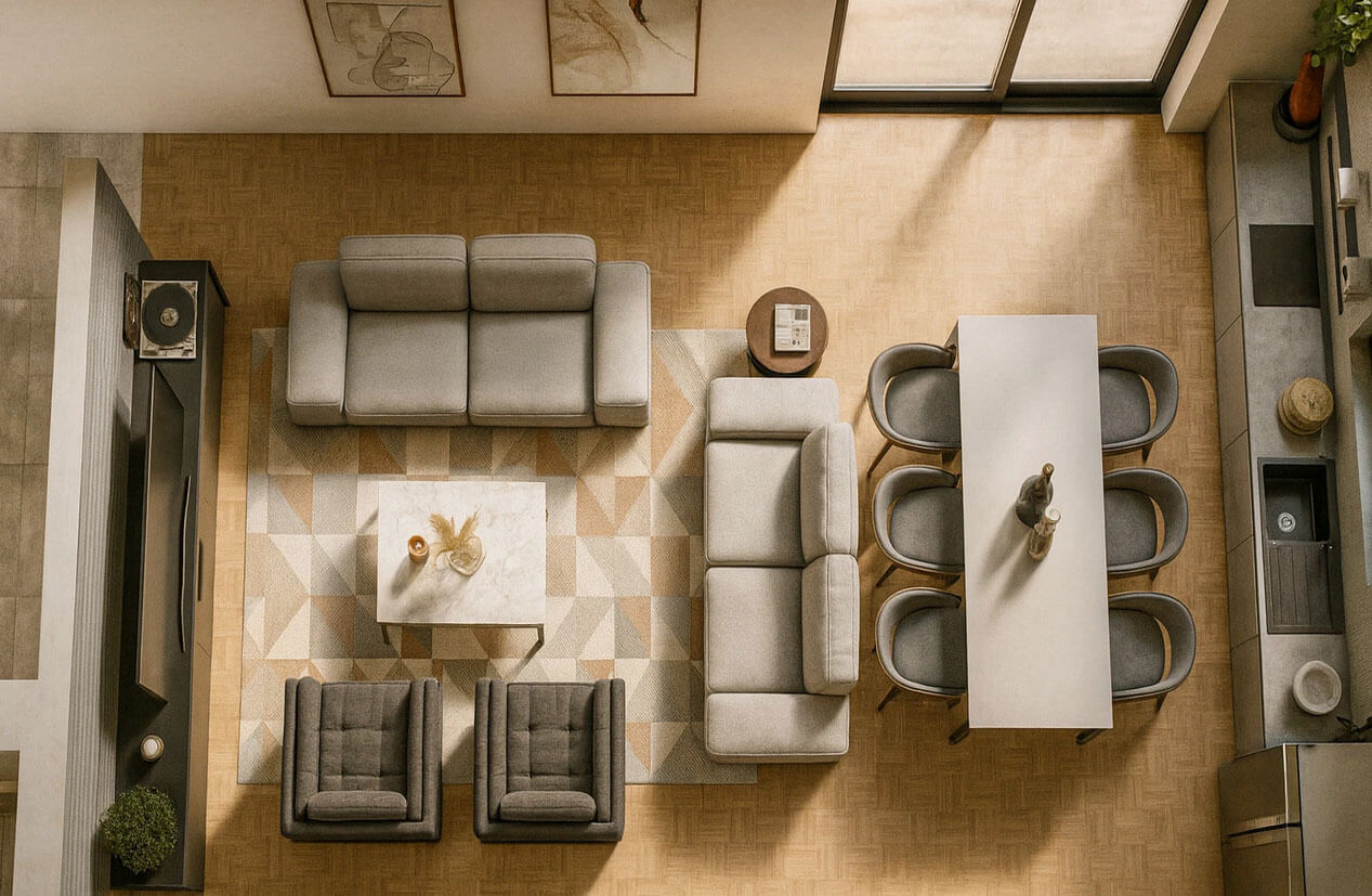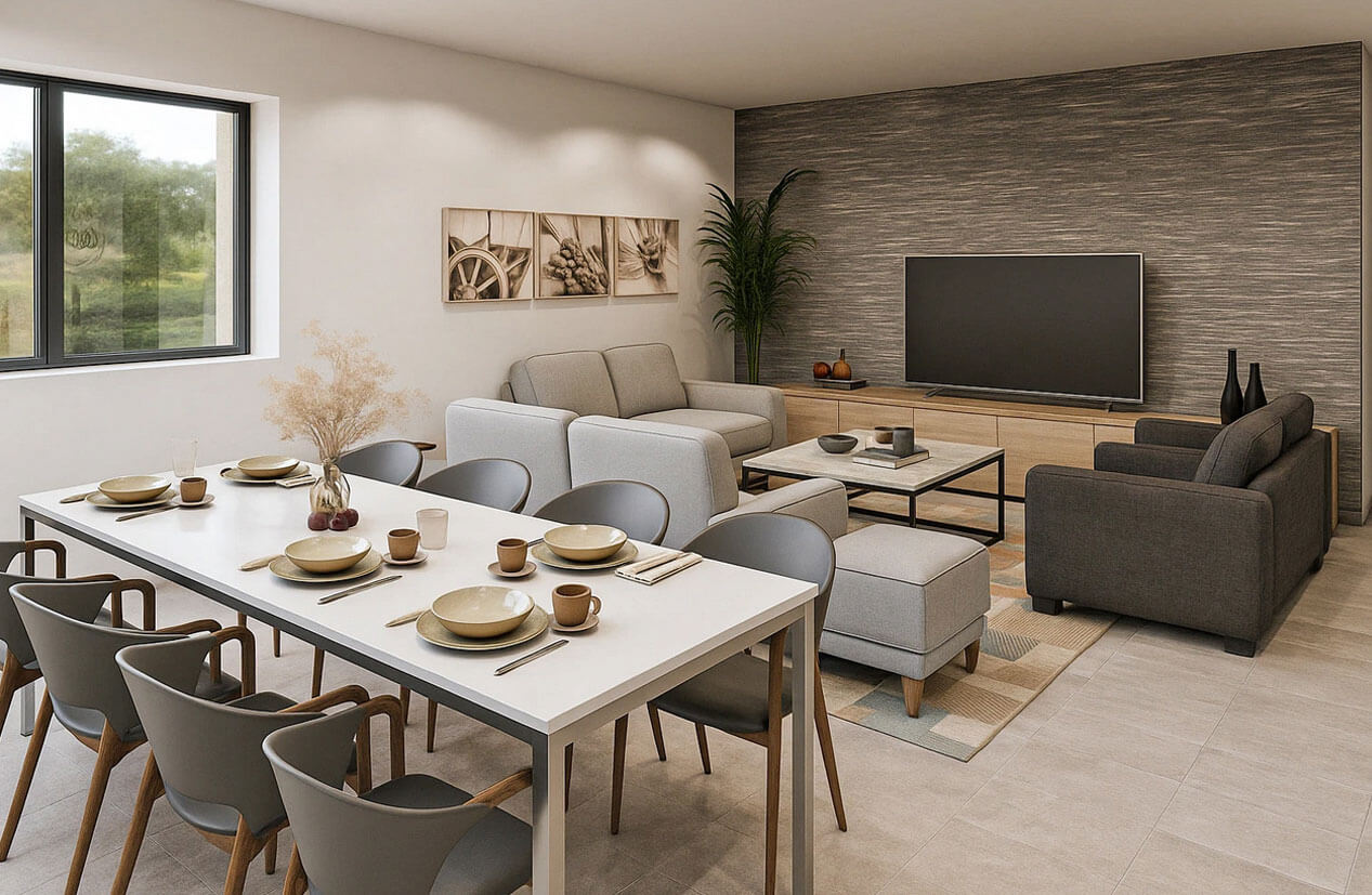 Гостиная с большими диванами, мягкими креслами и центральным журнальным столом логично переходит в обеденную зону с длинным столом на 8–10 персон. Простор и вид из окна в сторону бассейна и сада создают атмосферу отдыха, а лаконичная цветовая гамма и современная мебель обеспечивают уют и визуальную целостность. Такое решение делает зону для коллективного отдыха открытой, удобной для разных сценариев (вечеринки, семейные ужины, малые мероприятия).