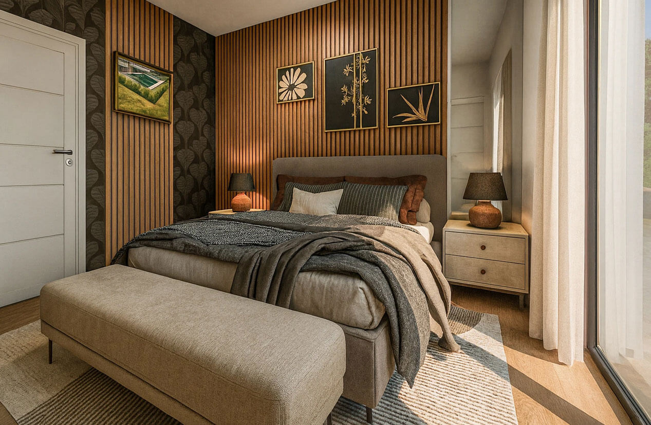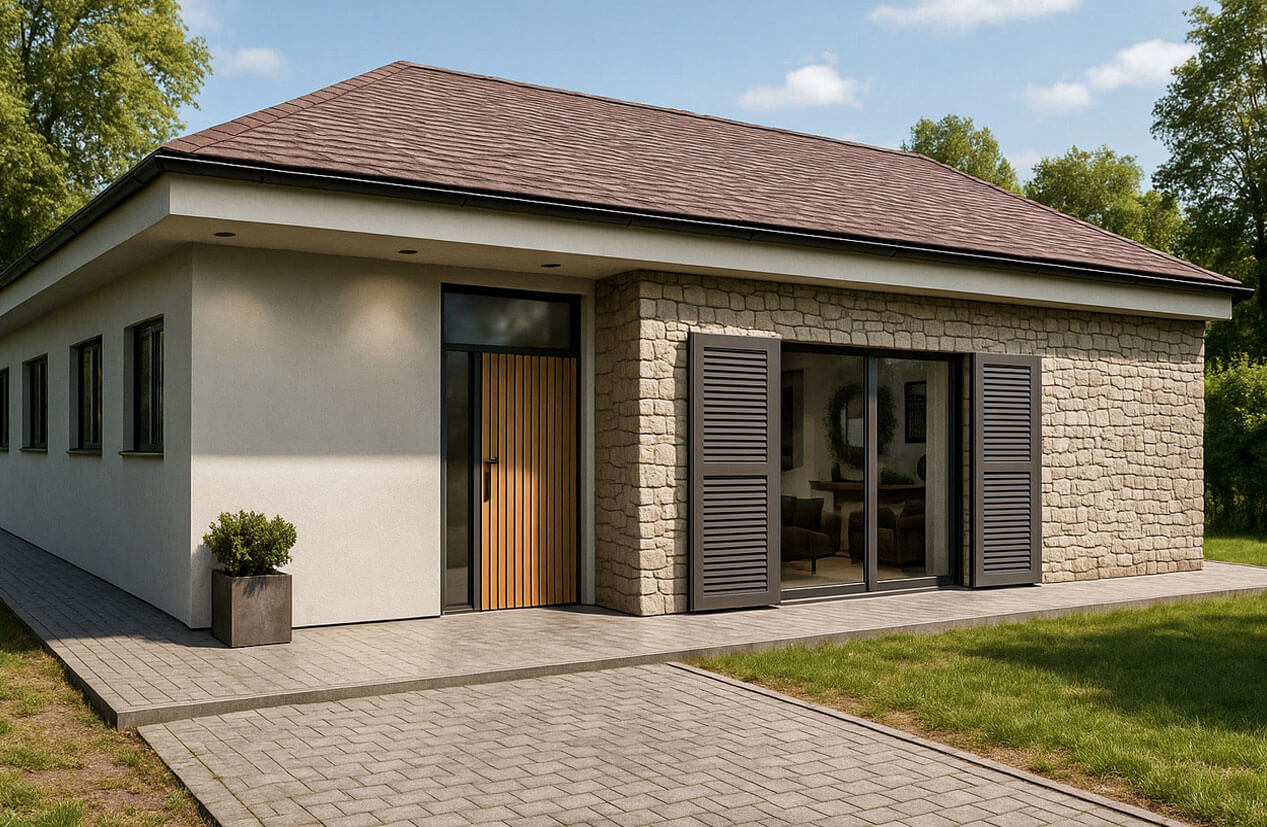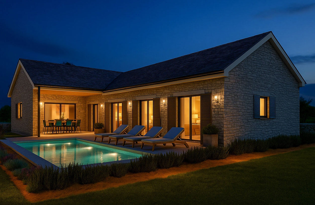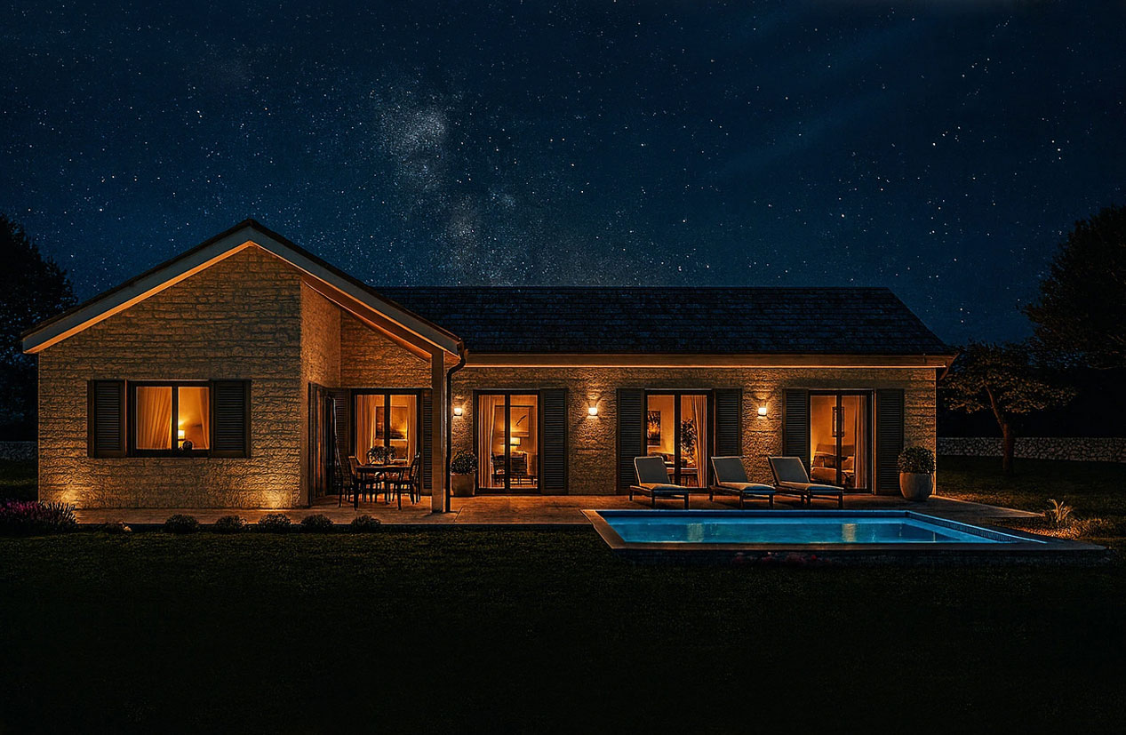 Основной акцент фасада — это сочетание натурального камня и гладкой штукатурки светлых оттенков, которые объединяют различные части здания и создают визуально тёплый, гостеприимный облик. Каменная кладка придаёт архитектуре основательность и эффект близости к традиционному европейскому стилю, а обширные панорамные окна и стеклянные двери усиливают ощущение легкости и подчёркивают связь с садом и террасой у бассейна. Жалюзи на окнах функциональны, обеспечивают приватность и позволяют регулировать количество дневного света. Отдельным акцентом служит отделка входной группы вертикальными деревянными рейками — это добавляет текстурности и делает вход дружелюбным.
