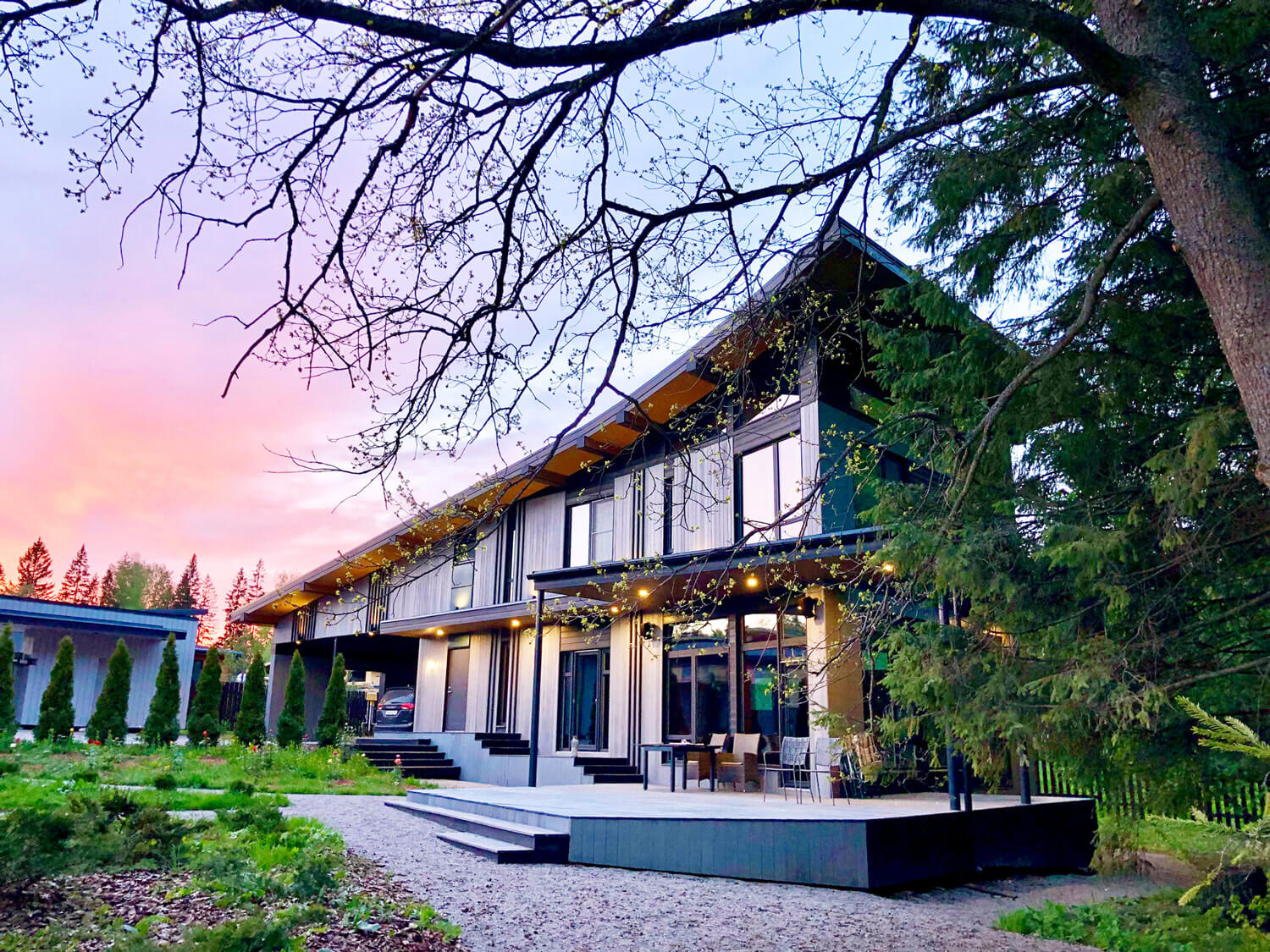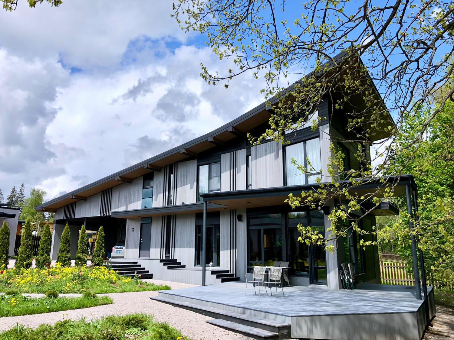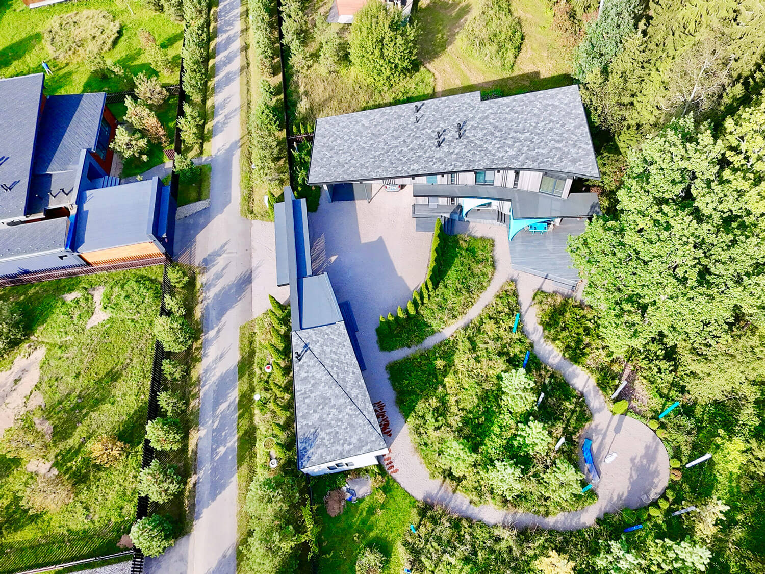 Нами проделана работа по озеленению участка. Стоит отметить, что мы не из породы «инвазивных ландшафтников», всегда стараемся раскрыть потенциал места, рельефа, растительности, отдавая предпочтение тому, что тысячелетиями росло в этих местах. Используем технику «Мозаичного кошения», применяем инкрустацию и деинсталляцию отдельных видов растений, нам дружественна концепция «серебряного дома». Всегда отдаем предпочтение более легким фундаментам, сводим к минимуму работу тяжелой строительной техники ради сохранения почвенного и травянистого покрова местности.