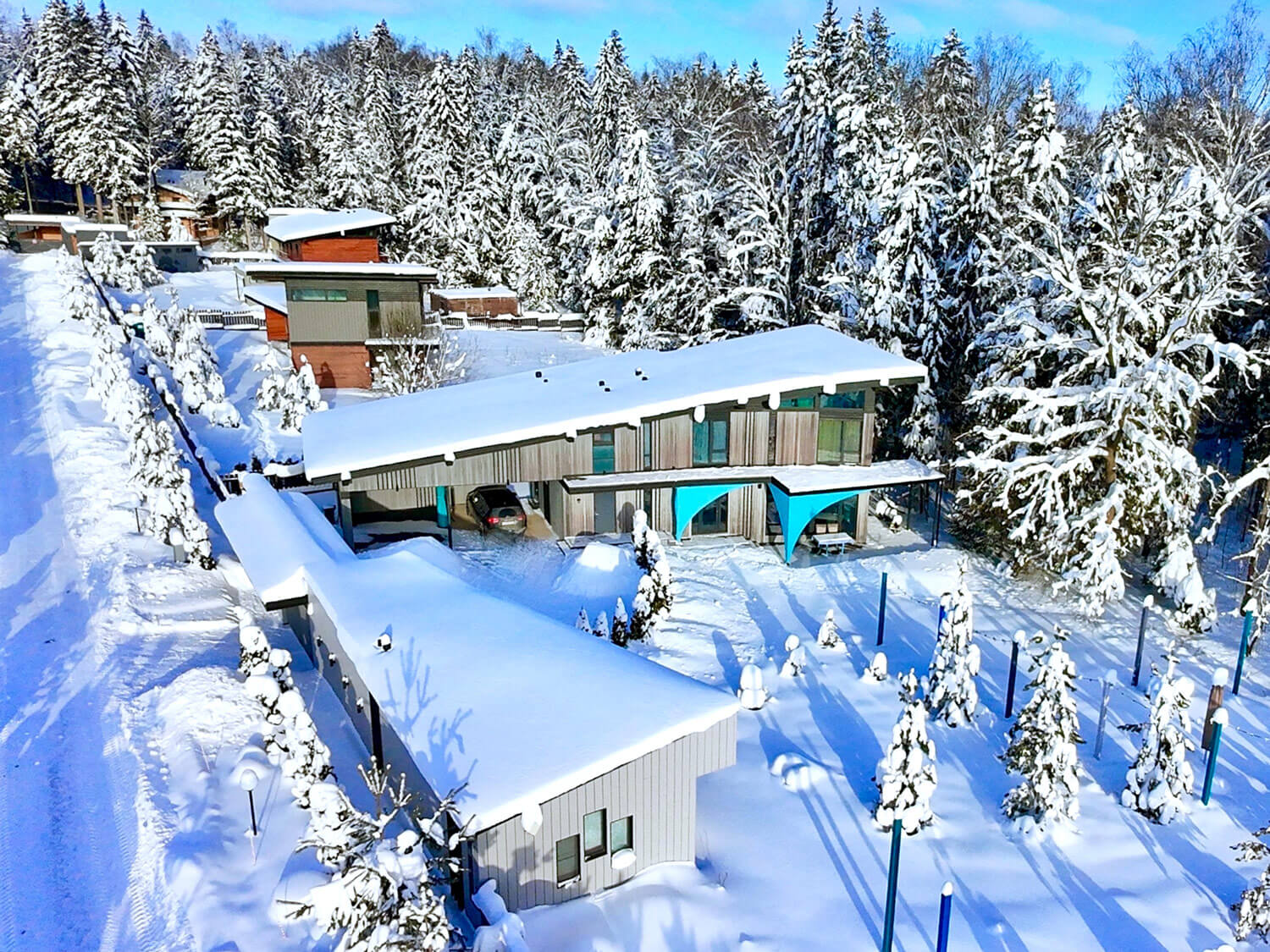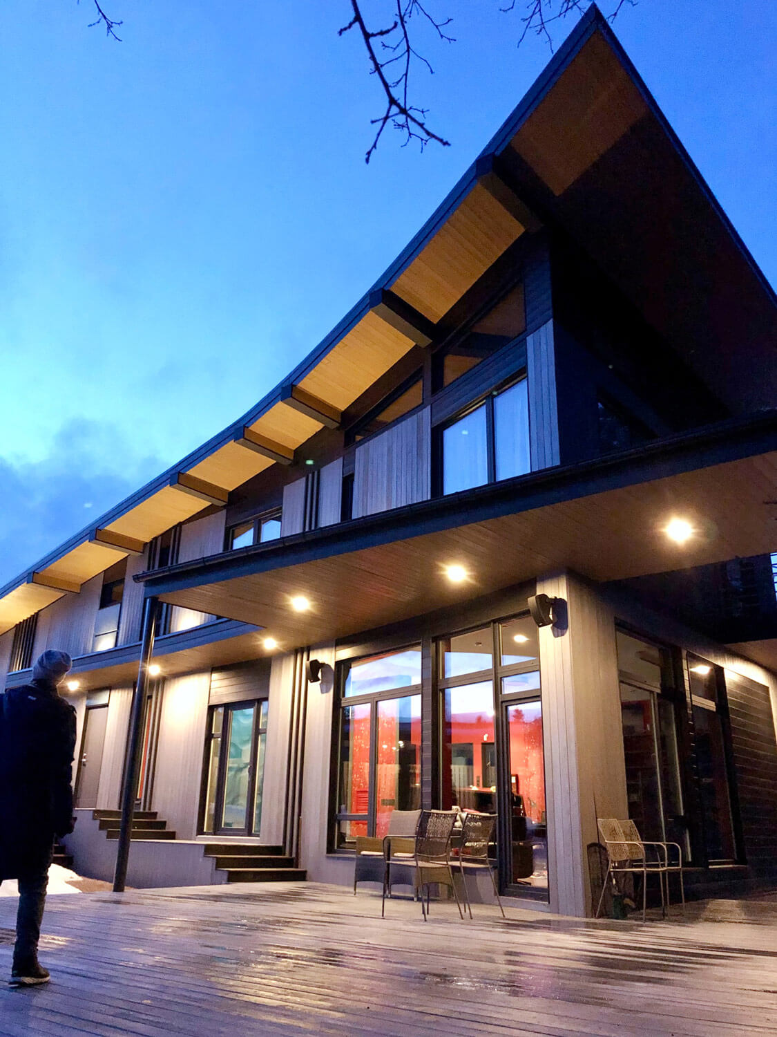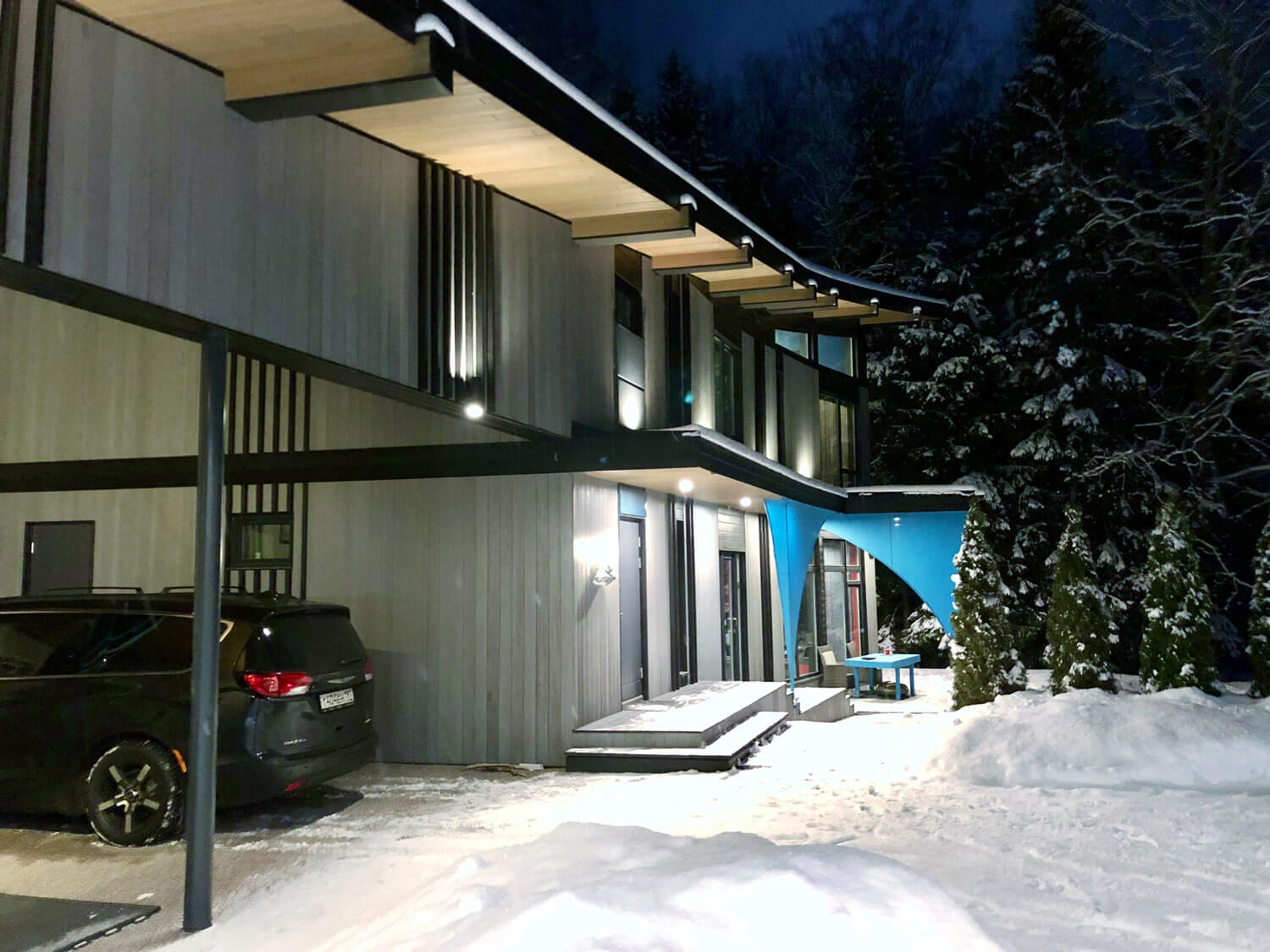Главный фасад здания (общее пространство, столовая, две спальни) с большой площадью остекления ориентирован на юг, прикрыт крышами дома, террасы, навесом и парусом. Это позволяет низкому зимнему солнцу пронизывать жилые помещения здания теплыми, не перегревающими лучами, а летом хорошо защищает от перегрева. Восточный фасад (общее пространство и две спальни, балконы) смотрит на реликтовый лес, имеет также большую площадь остекления. Благодаря сложному рельефу с сильным перепадом высот в двухэтажном доме пять! уровней пола. В детской спальне, расположенной на втором этаже, есть полуэтаж, на котором оборудовано спальное место для детей. Благодаря удачному проектированию шторы в доме не предусматриваются, достигнут хороший уровень приватности, есть светозащита на окнах в зоне кинотеатра в общем пространстве.