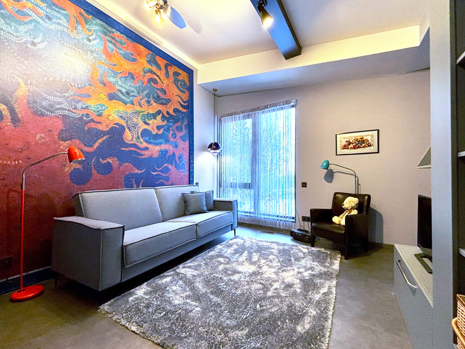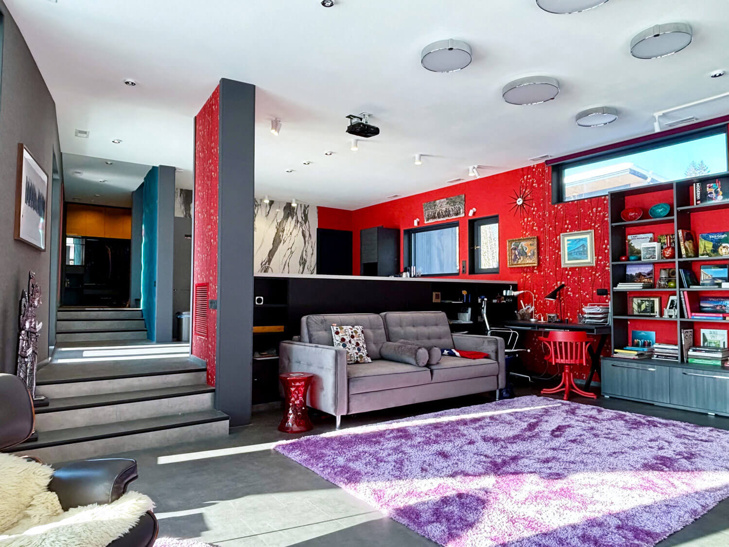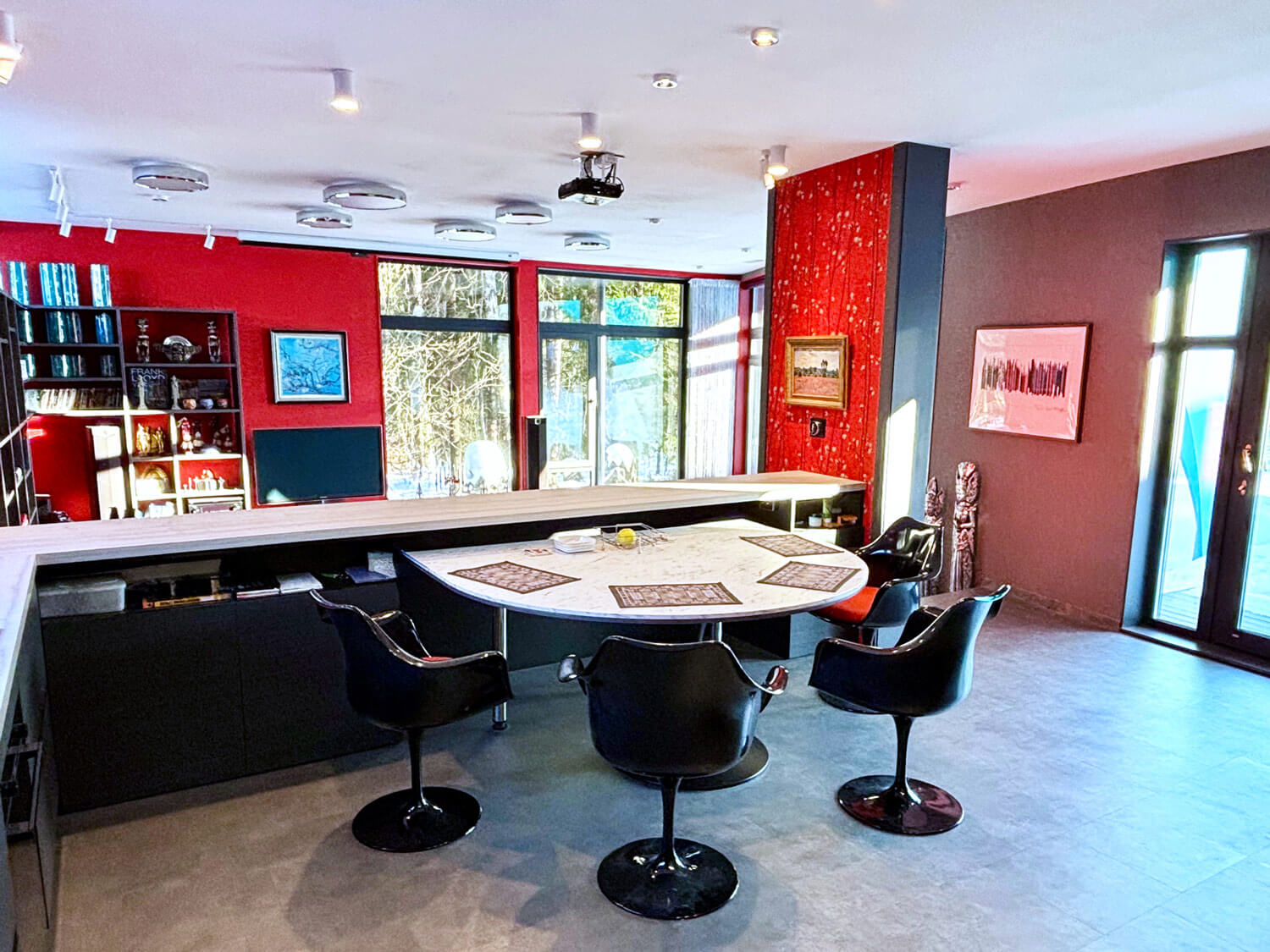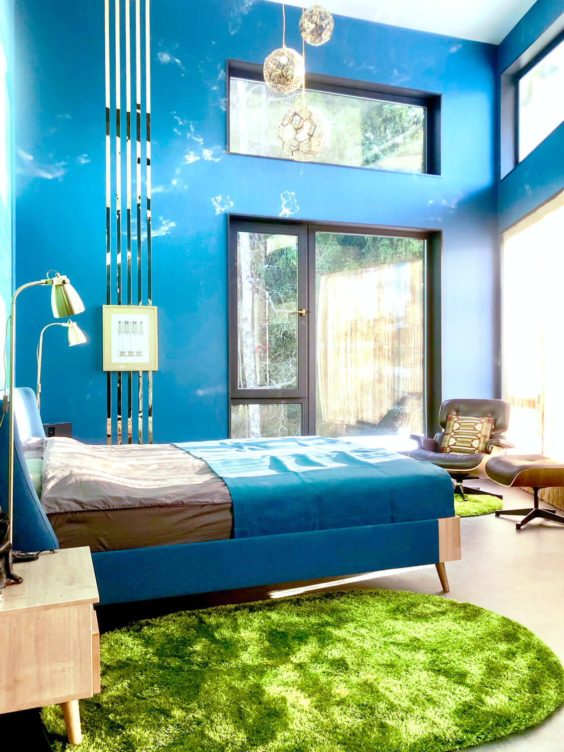Главный фасад здания (общее пространство, столовая, две спальни) с большой площадью остекления ориентирован на юг, прикрыт крышами дома, террасы, навесом и парусом. Это позволяет низкому зимнему солнцу пронизывать жилые помещения здания теплыми, не перегревающими лучами, а летом хорошо защищает от перегрева. Восточный фасад (общее пространство и две спальни, балконы) смотрит на реликтовый лес, имеет также большую площадь остекления. Благодаря сложному рельефу с сильным перепадом высот в двухэтажном доме пять! уровней пола. В детской спальне, расположенной на втором этаже, есть полуэтаж, на котором оборудовано спальное место для детей. Благодаря удачному проектированию шторы в доме не предусматриваются, достигнут хороший уровень приватности, есть светозащита на окнах в зоне кинотеатра в общем пространстве.