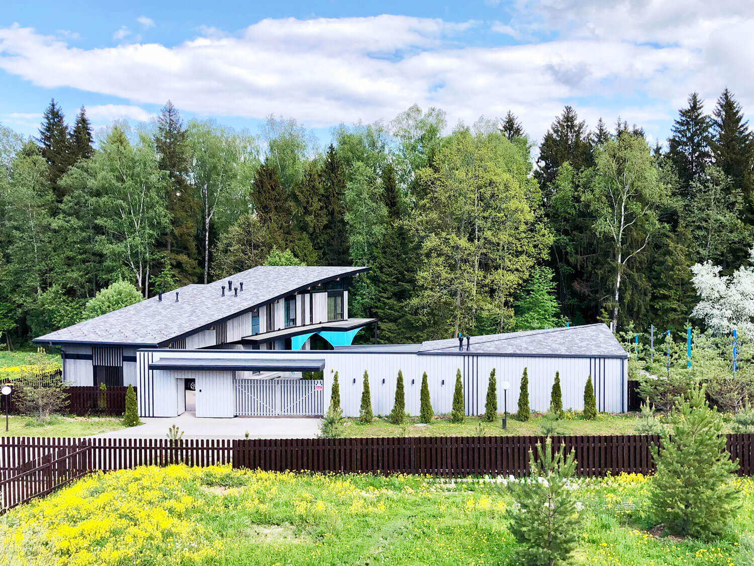 Симпатичная угловая композиция из 2 объемов, строго перпендикулярных друг другу. Интересные, лёгкие фасады.