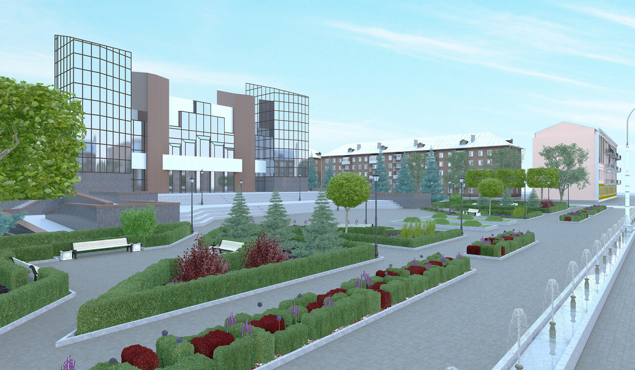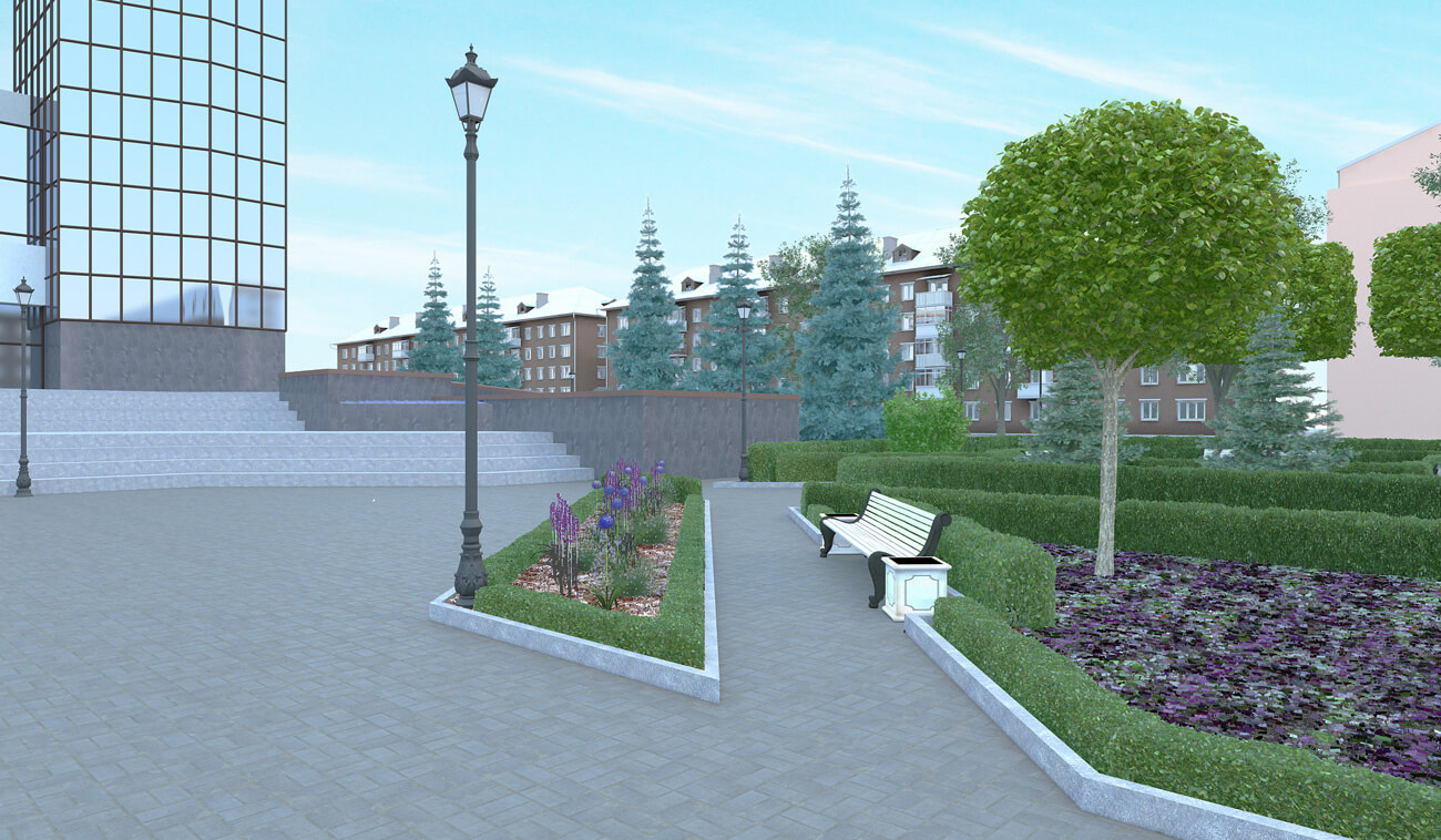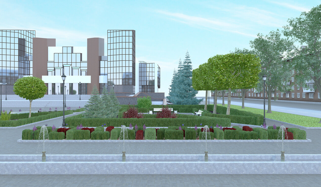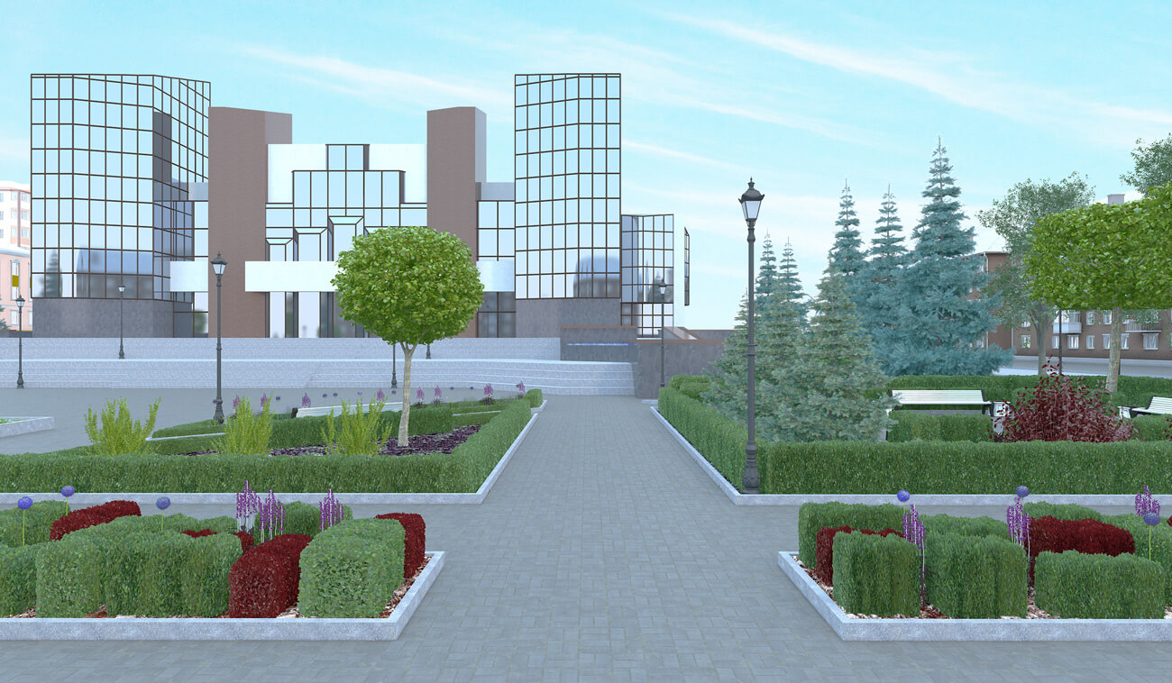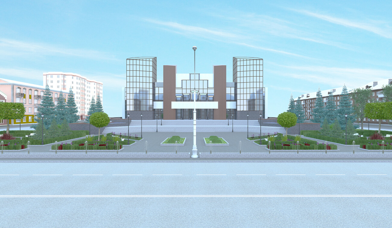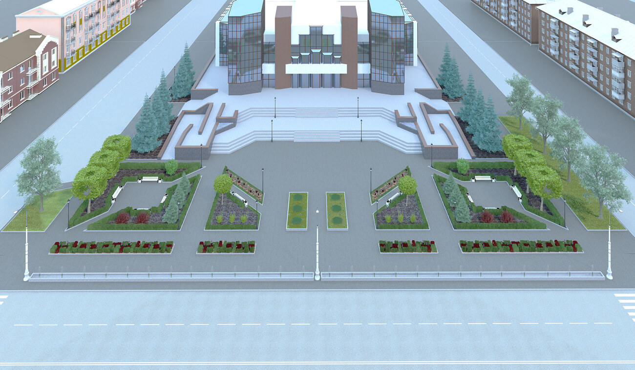 Проект озеленения площади им. Ю.П. Киселёва (территория перед входом в Театр Юного Зрителя, г. Саратов). Цель данного проекта — подчеркнуть с помощью насаждений значимость здания и в то же время смягчить обилие камня в его конструкции.