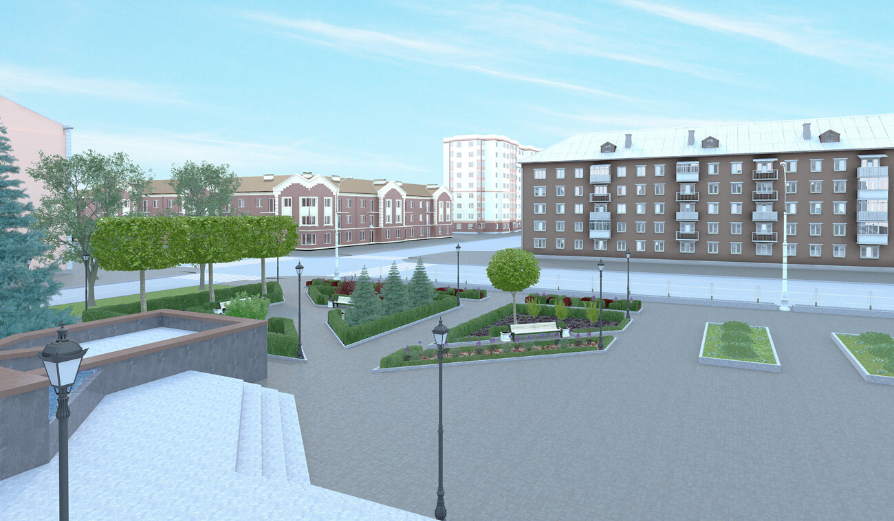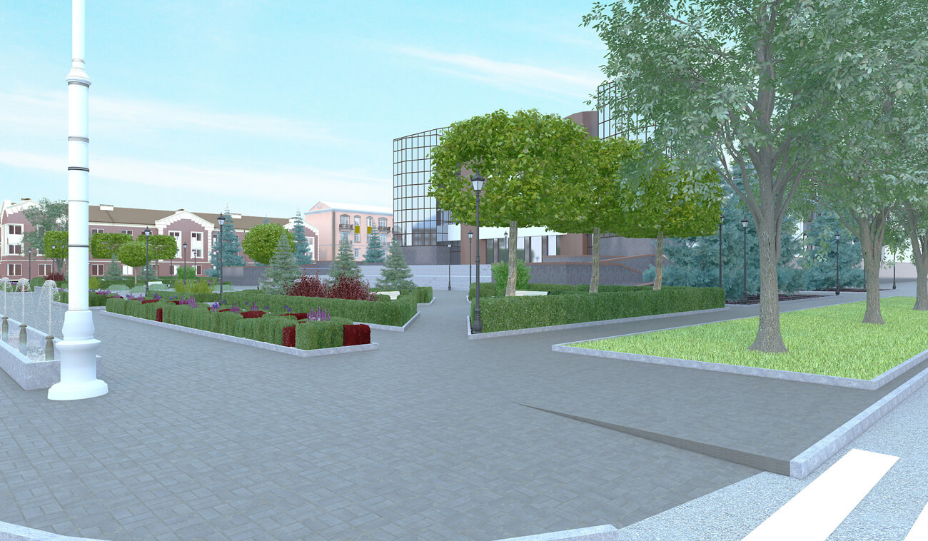 Проект решен в регулярном стиле, что создает эффект торжественности и парадности. Концепция данного проекта состоит в том, что более высокие растения занимают периферийные зоны, постепенно снижаясь к центру площади. Таким образом, территория площади как бы обосабливается от прилегающих транзитных пешеходных и автомобильных путей, но в то же время не теряет визуальную связь с окружающим пространством.
