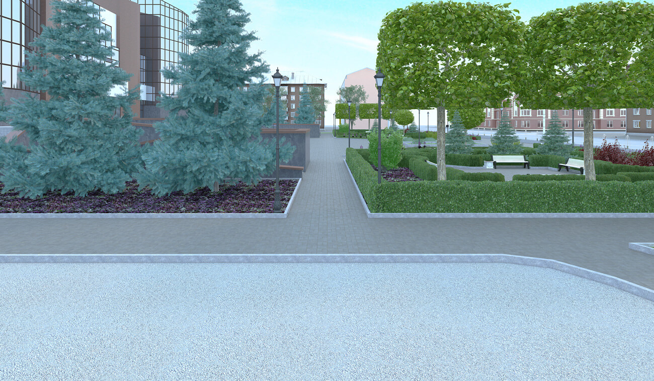 Строгость геометрических линий стриженого кустарника смягчают цветы, посаженные в специально оставленные пространства. Покрытие в этих зонах выполнено древесной щепой. В качестве газонного покрытия используется живучка ползучая, так как она также не требует постоянного ухода и спокойно относится к недостатку света. Завершает композицию узкая линия фонтана, психологически отделяющая пешеходную зону от автомобильной.