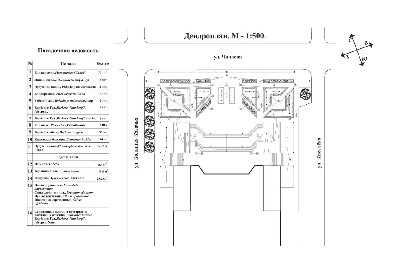 Древесные и кустарниковые насаждения подобраны с учетом их малотребовательности к уходу, адаптированные к городским условиям. Исключение составляют формованные виды робинии и липы мелколистной, стриженые живые изгороди и куртины кустарника по переднему фасаду всей композиции, которые необходимо будет периодически постригать.