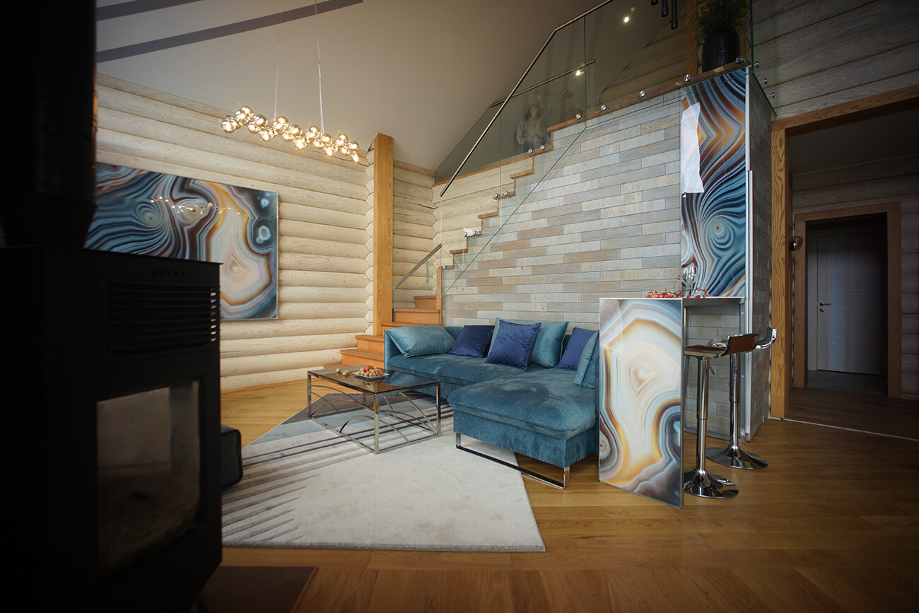 На первом этаже удивляют огромные окна, наполняющие воздухом небольшую, но очень уютную гостиную с высокими потолками. Мягкая группа в гостиной создана для наслаждения камином и видом из окна. В отделке активно применяются натуральные материалы: деревянное панно из хвойной фанеры, шпонированные панели, деревянные полы и баффели, натуральный оникс.