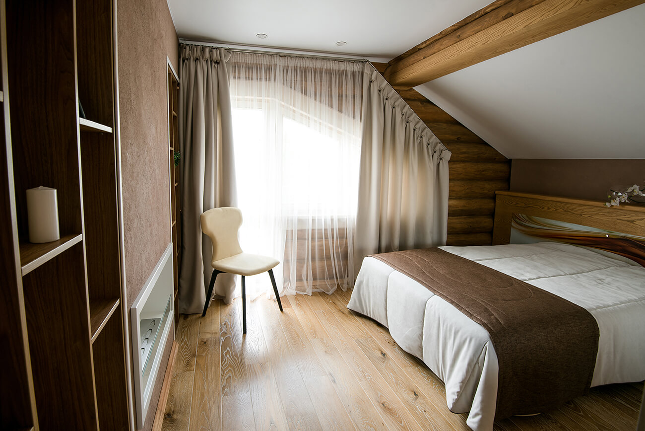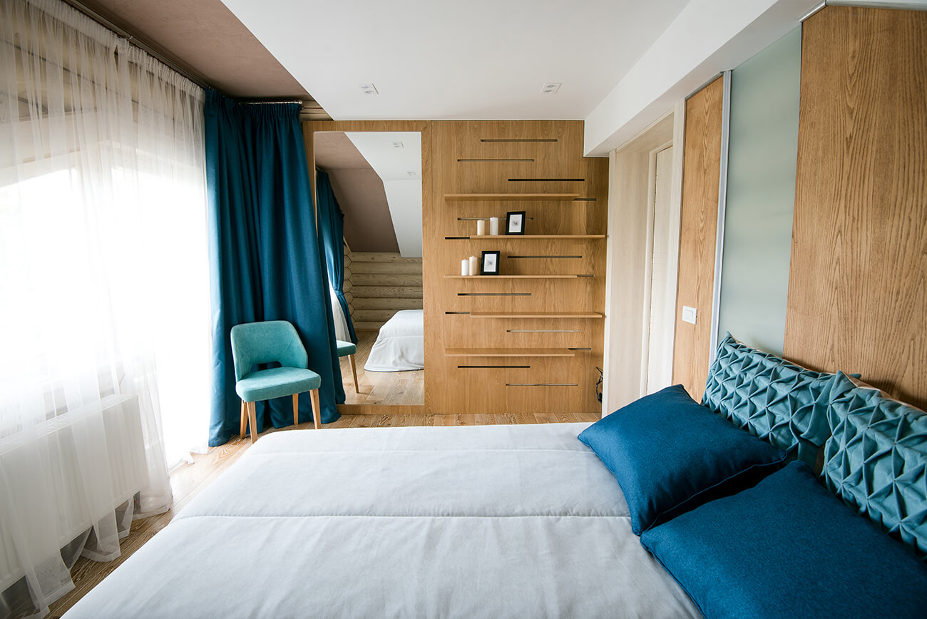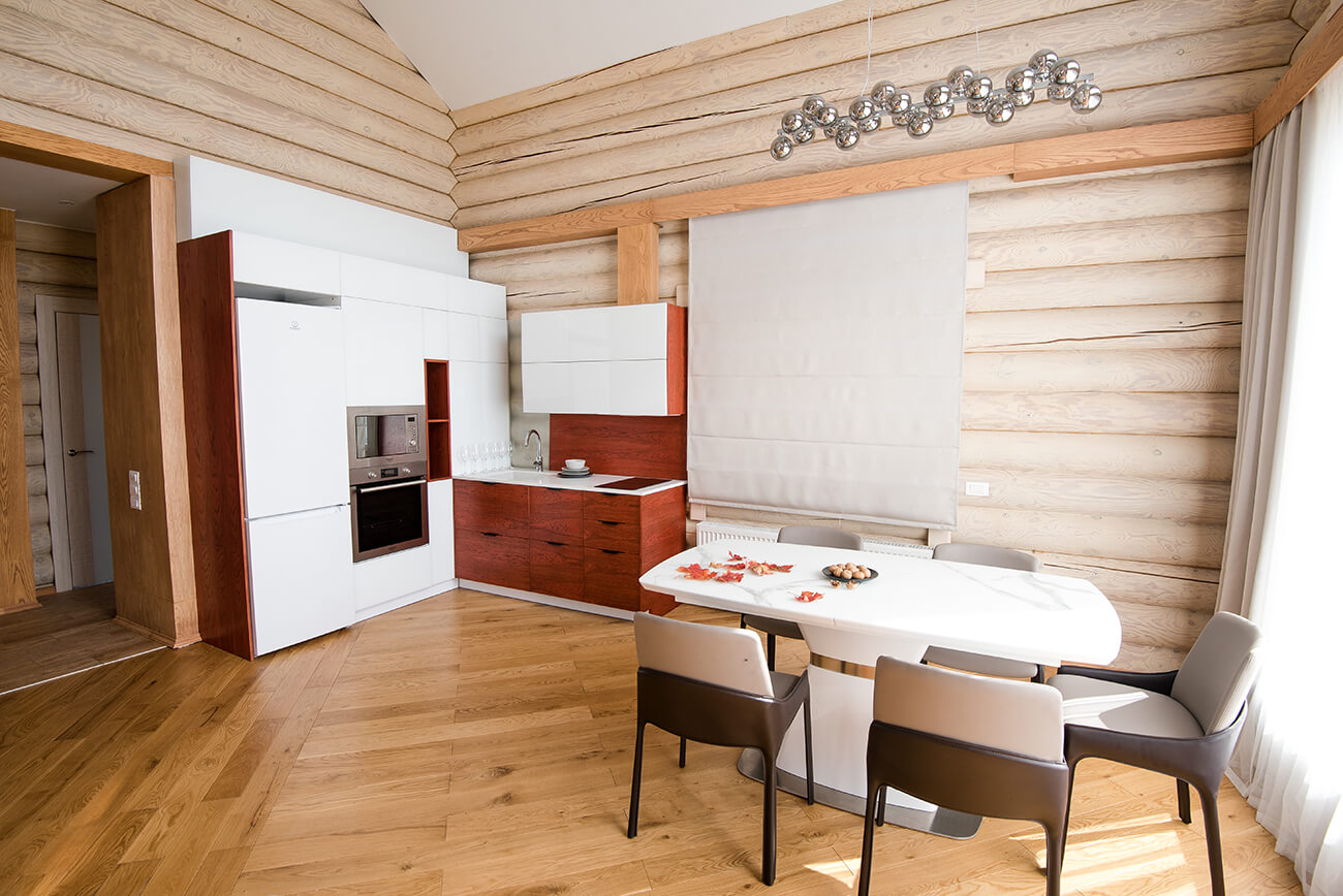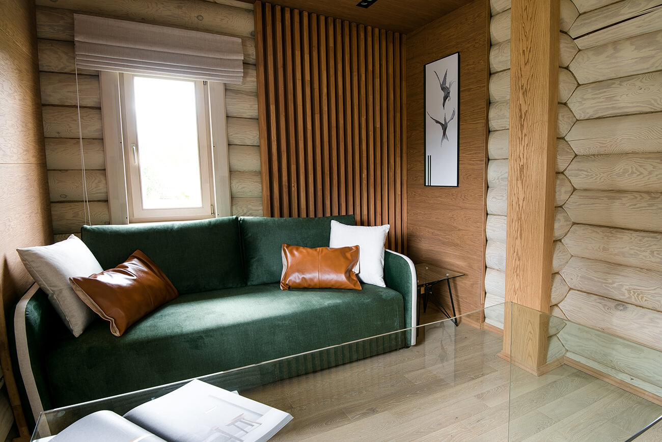 В нашу первую встречу дом поразил своей шикарной структурой бревна, ведь это настоящие оцилиндрованные бревна диаметром двадцать восемь сантиметров. Чтобы сохранить эти стены, мы покрыли их маслом, которое подчеркнуло структуру и придало им особую замшевую фактуру.