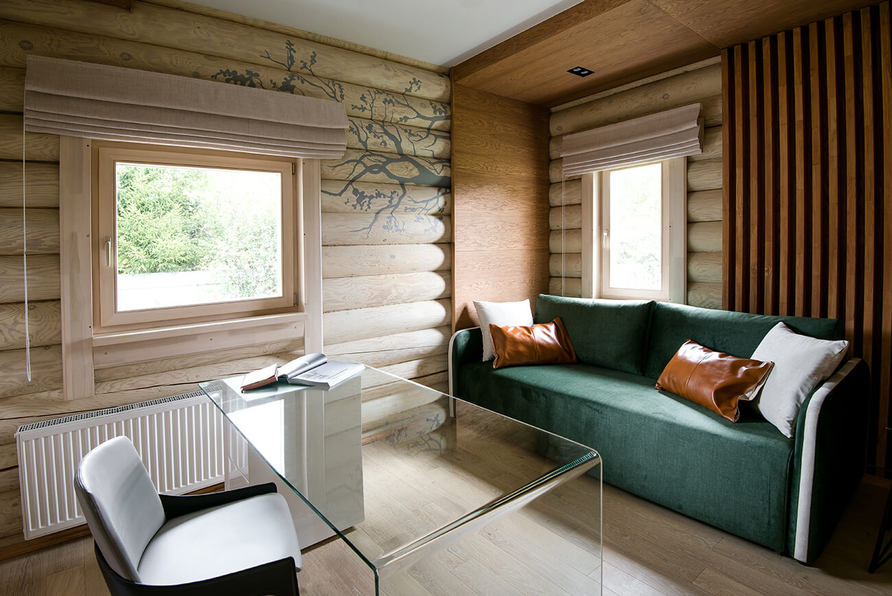 Особой гордостью хозяина стал рабочий кабинет. Его площадь всего 12,3 кв.м, но здесь предусмотрены системы хранения книг и гостевого постельного белья, рабочий стол, раскладной мягкий диван. На фоне бревенчатых стен прекрасно смотрится легкий стеклянный стол. Интересно и нетривиально украсила стену роспись.