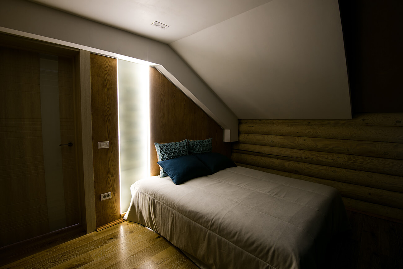 На втором этаже расположены две спальни, санузел и очень атмосферный балкон с видом на кухню-гостиную. В хозяйской спальне разместили интересный вертикальный светильник из матового стекла, подчеркивающий своим мягким светом структуру бревна. Модульная шпонированная панель не только красивая, но и функциональная, с легкостью меняющая высоту и количество полочек.
