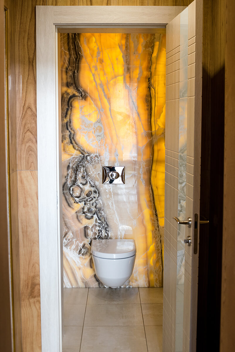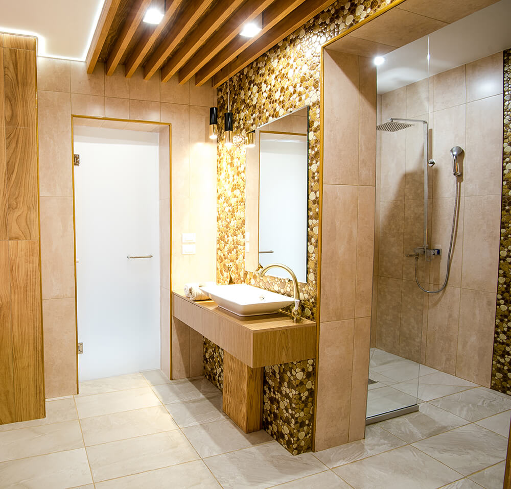 Внимание привлекает и небольшой банный комплекс. На площади 14 кв.м разместили ванну, душ и сауну. Ванна установлена вдоль окна, чтобы можно было наслаждаться природой. Раздвижные стеклянные створки защищают окна во время приема душа.