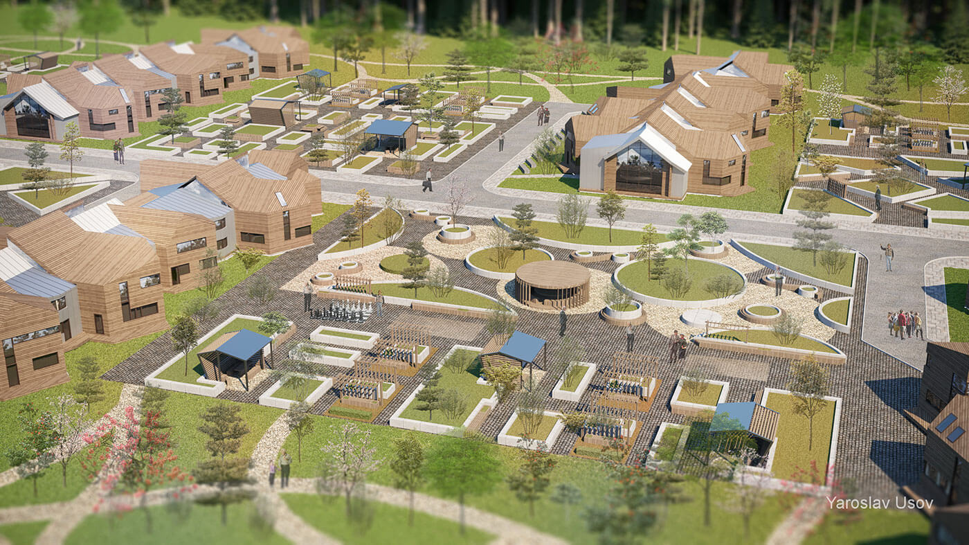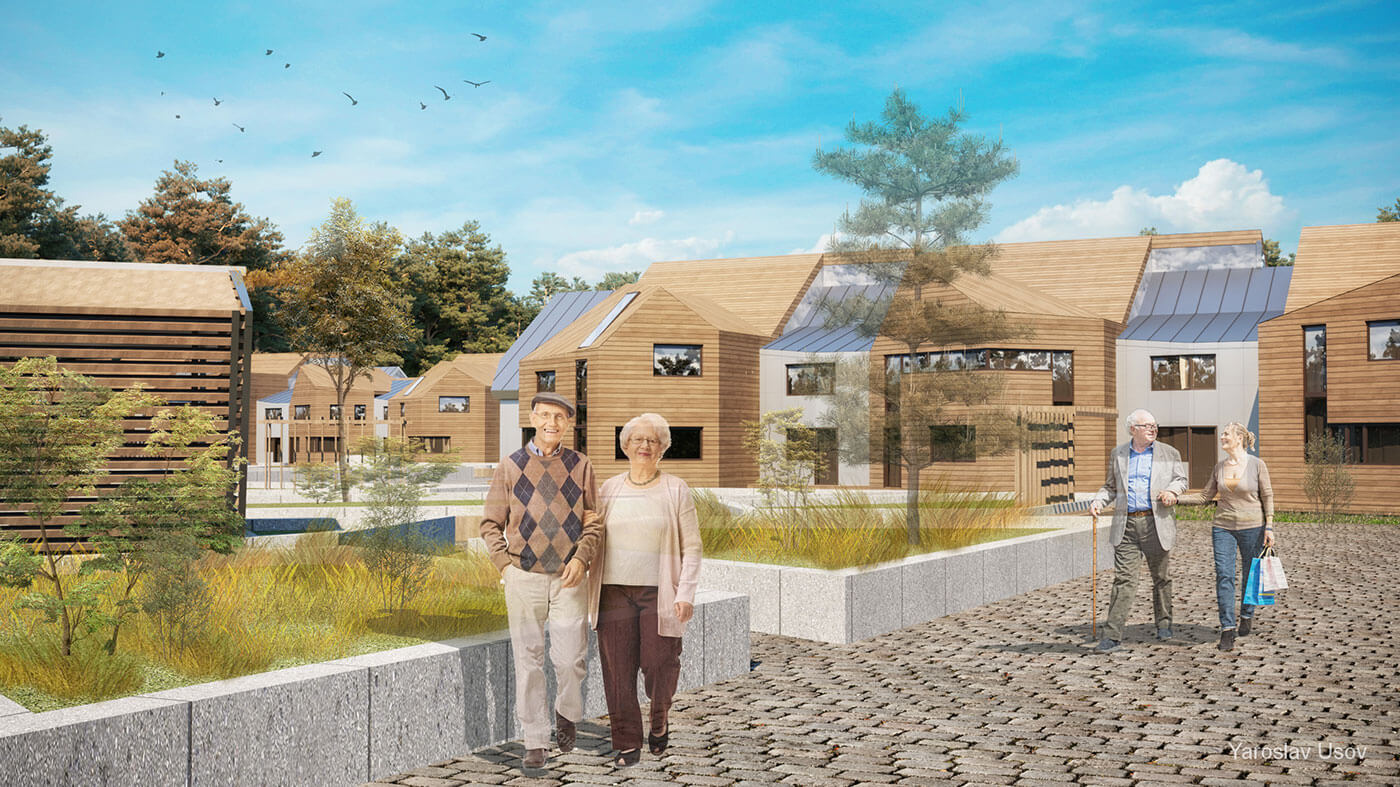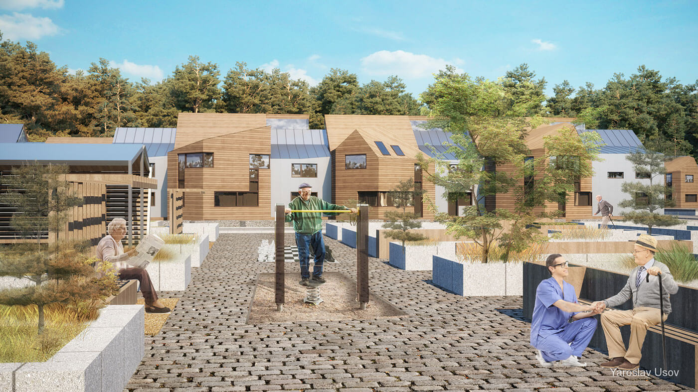 Концепция пансионата для пожилых выполнена на условном участке площадью 7 га в Московской области. Проектом предусмотрено создание комфортной среды, способствующей отдыху и оздоровлению в гармонии с природой в атмосфере, приближенной к домашней.