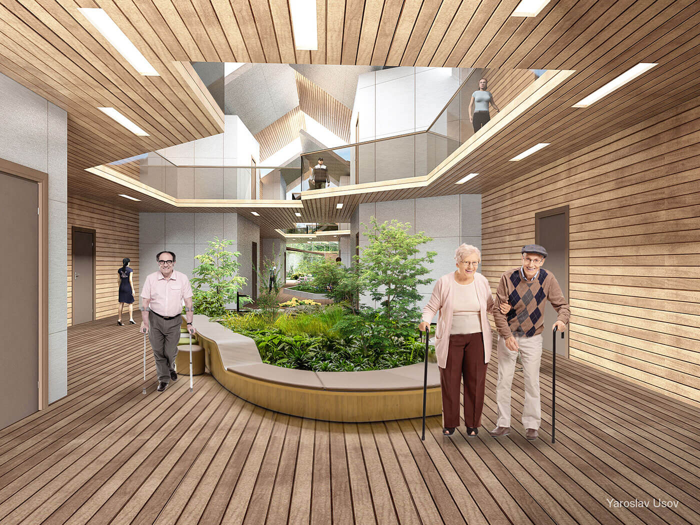 Жилая часть каждого корпуса представлена 40 жилыми номерами. В общественной части запроектированы помещения дневного пребывания: гостиные на каждом этаже, кинозал и библиотека. Также запроектирован блок медицинских помещений, включающих в себя помещение дежурной медсестры, массажные, процедурные и смотровые кабинеты, а также необходимые вспомогательные помещения.