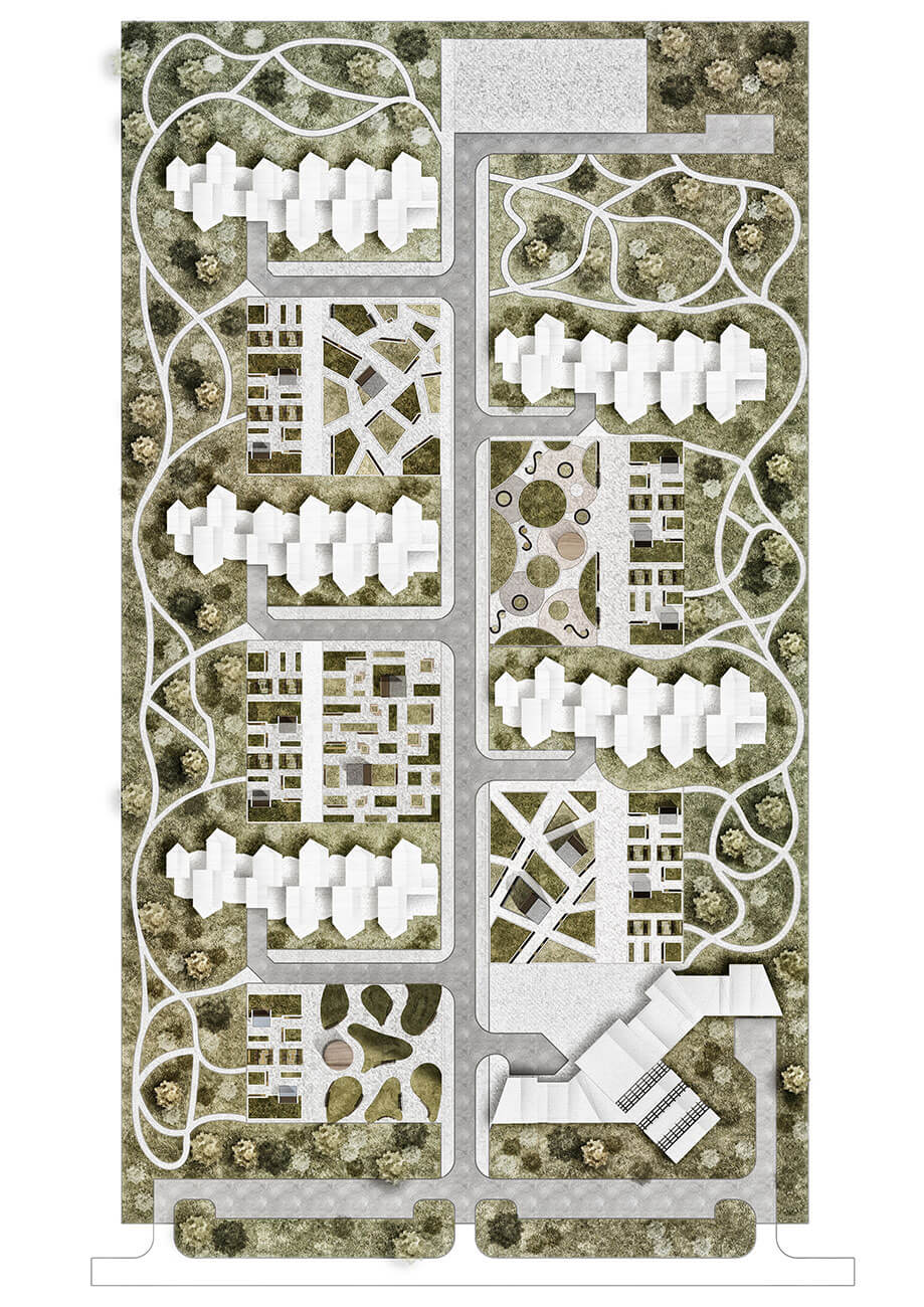 По периметру территории запроектирован нерегулярный парк с дорожками. Жилые корпуса запроектированы двухэтажными.