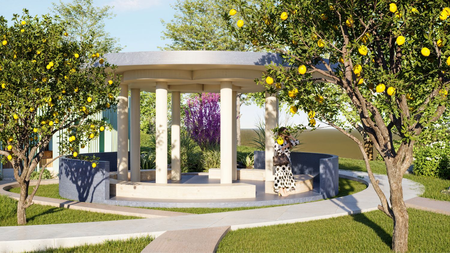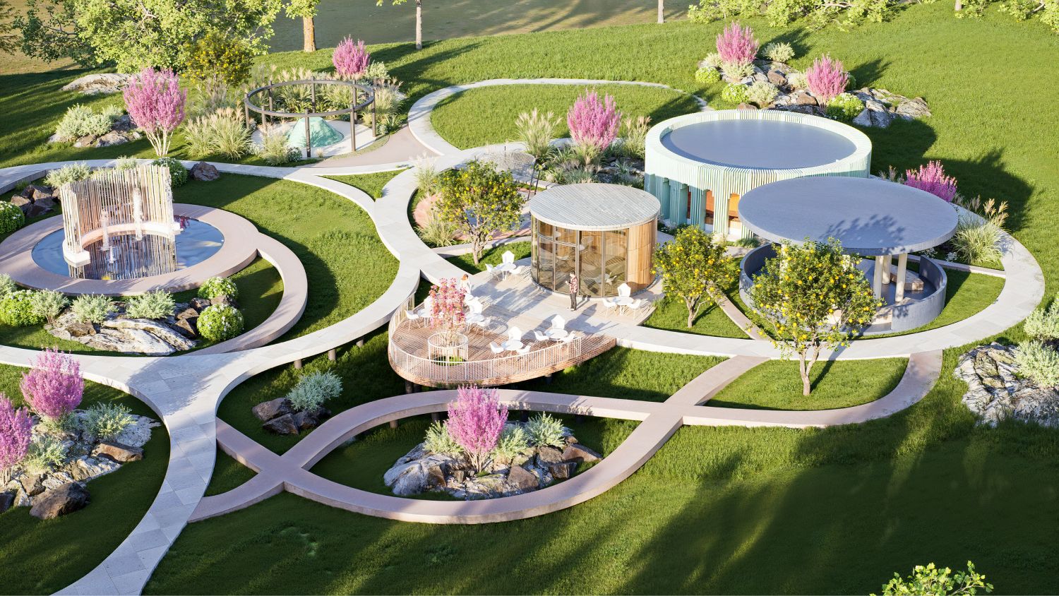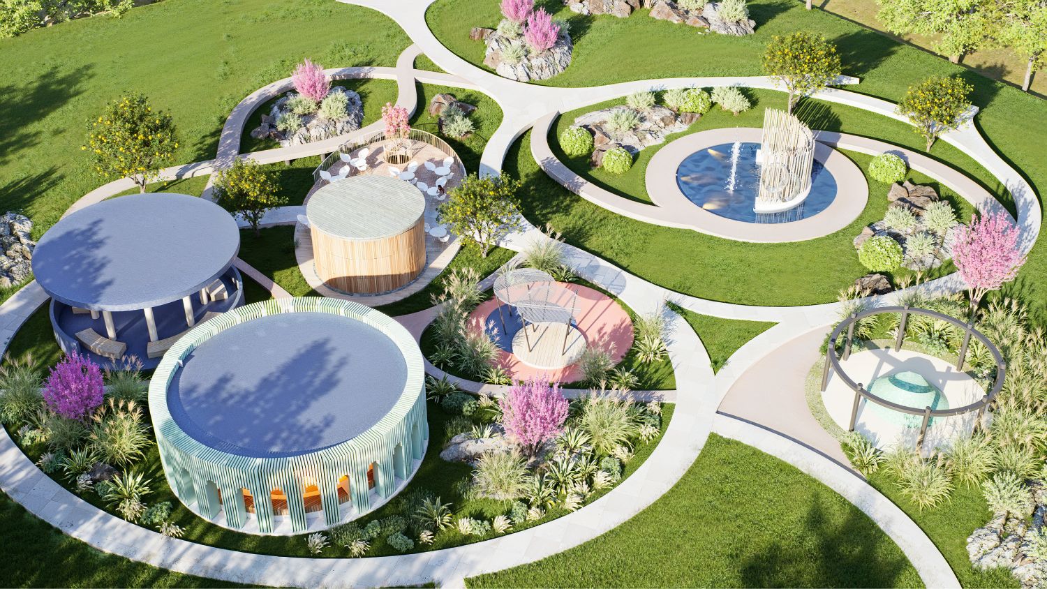 Очень понравилась идея комбинации круглых форм в дорожках и строениях! Красиво