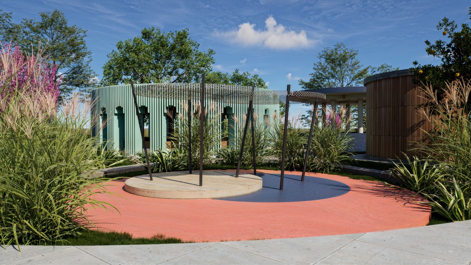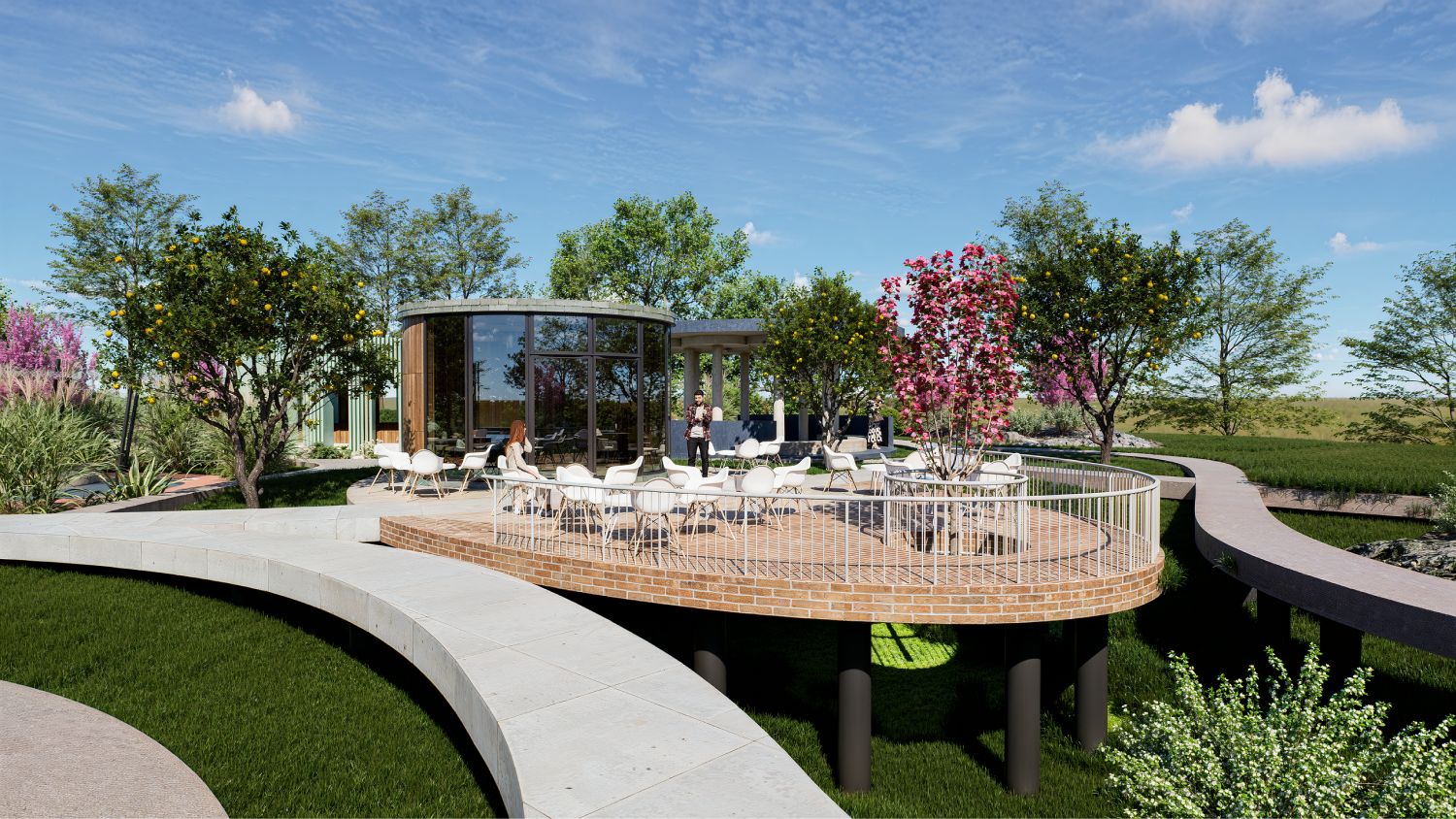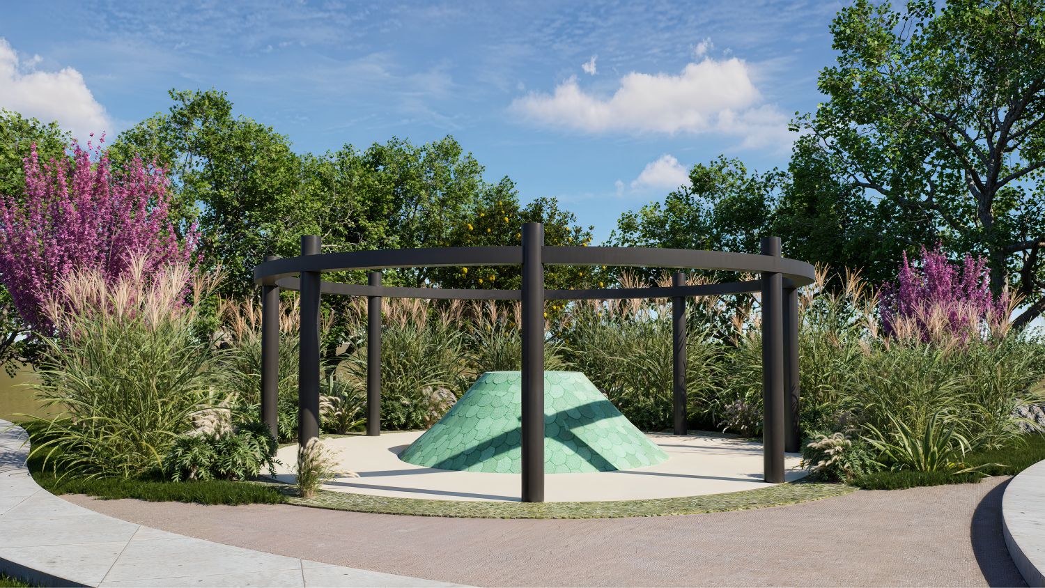 Легкие круглые сооружения различного назначения — от навесов до закрытых пространств. Они формируют узнаваемый визуальный образ территории.