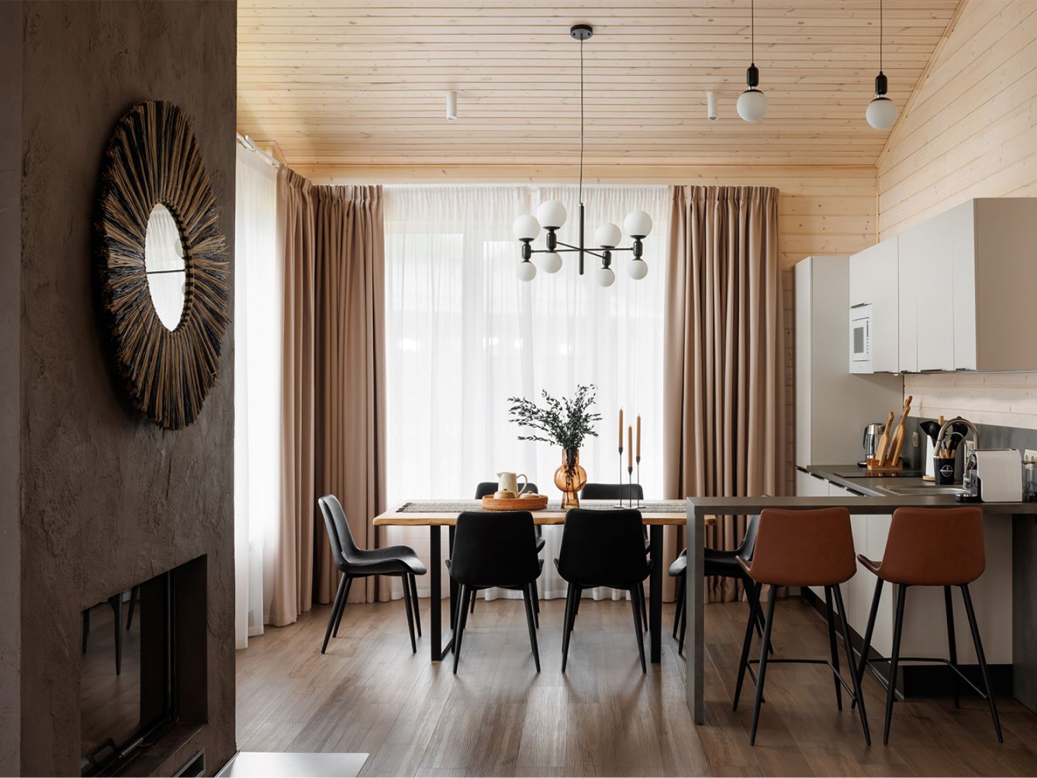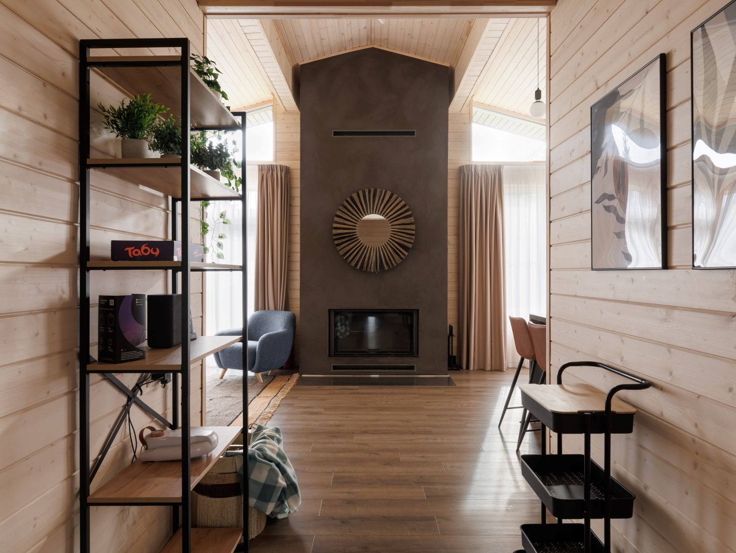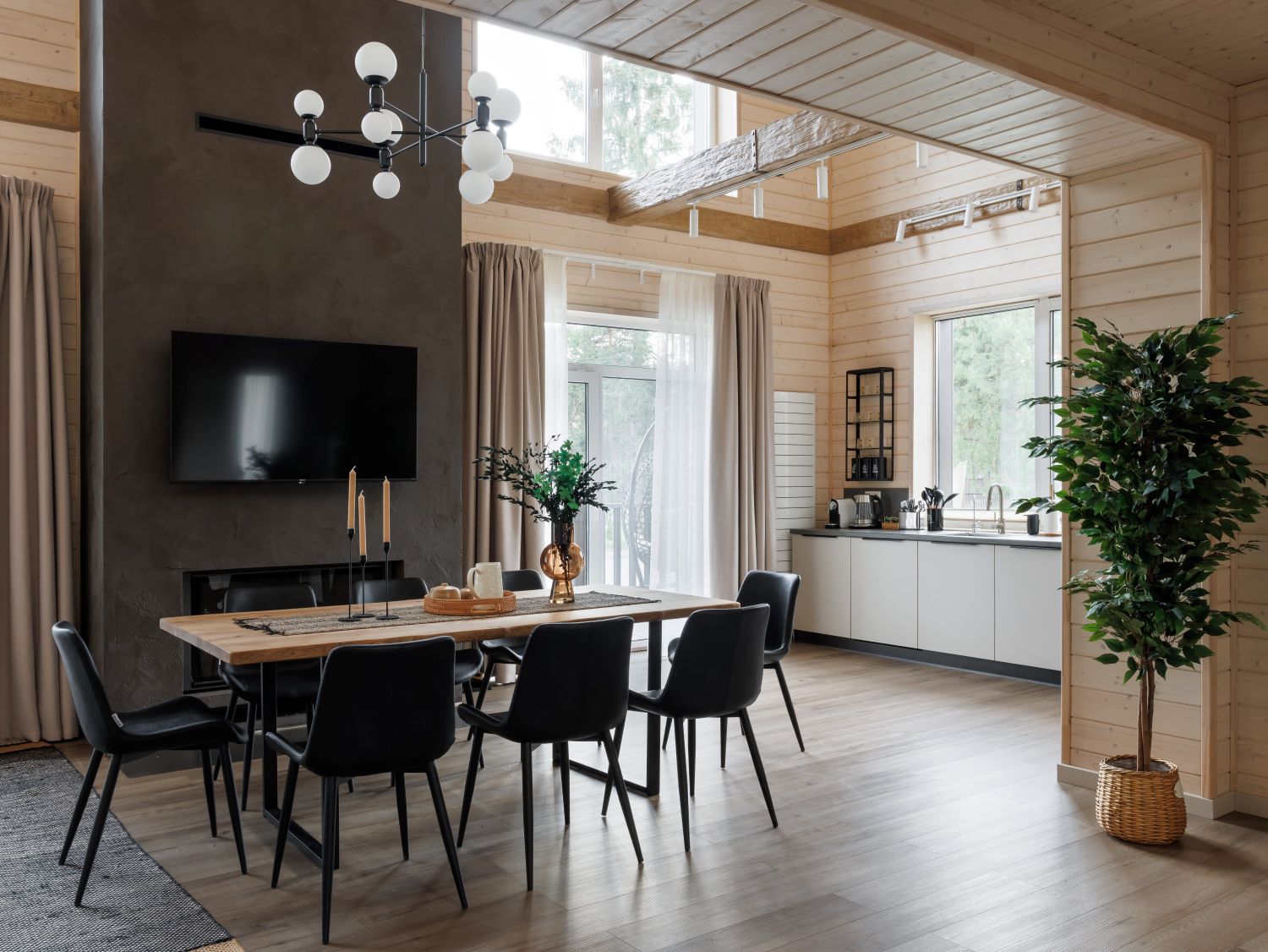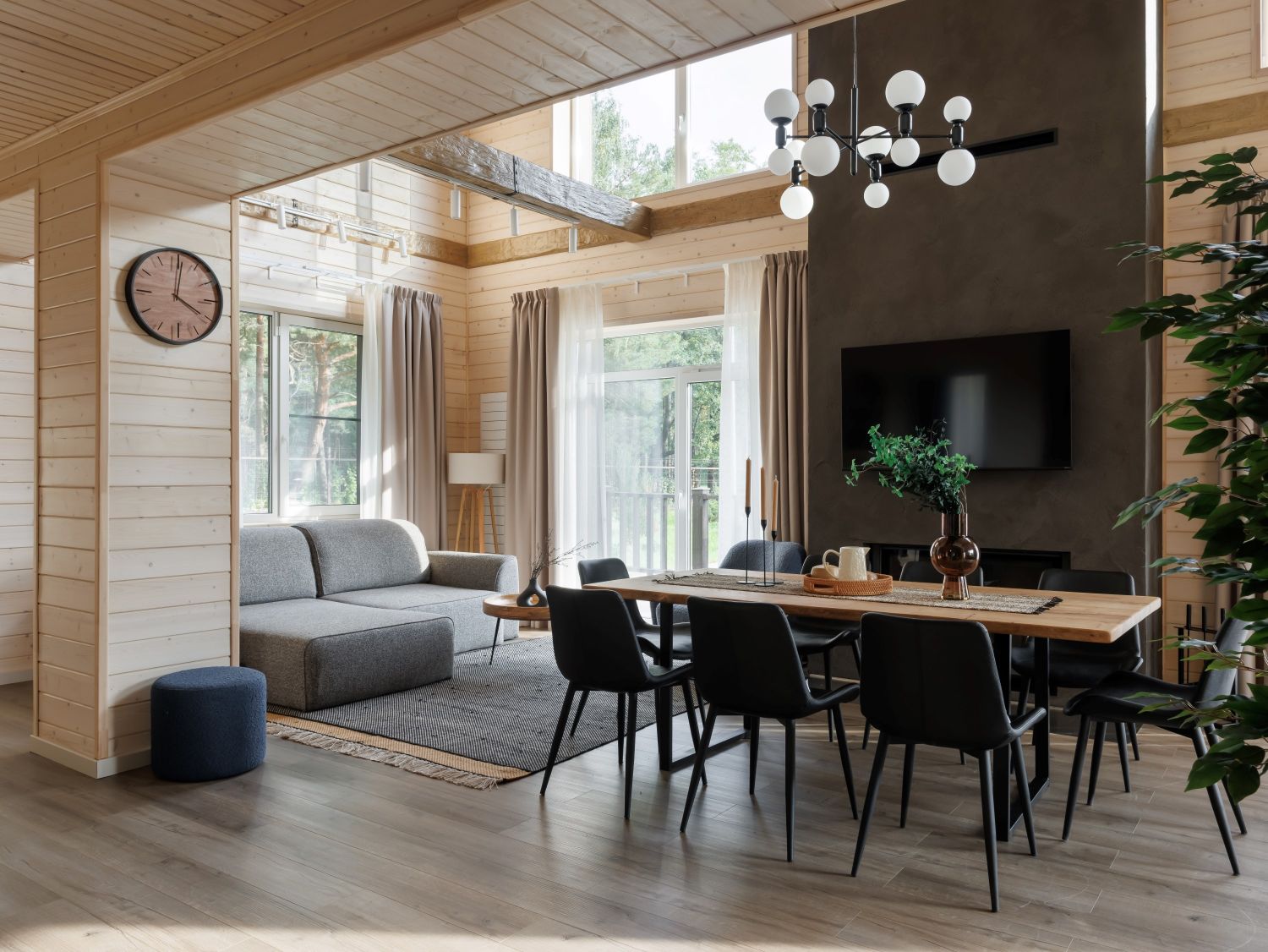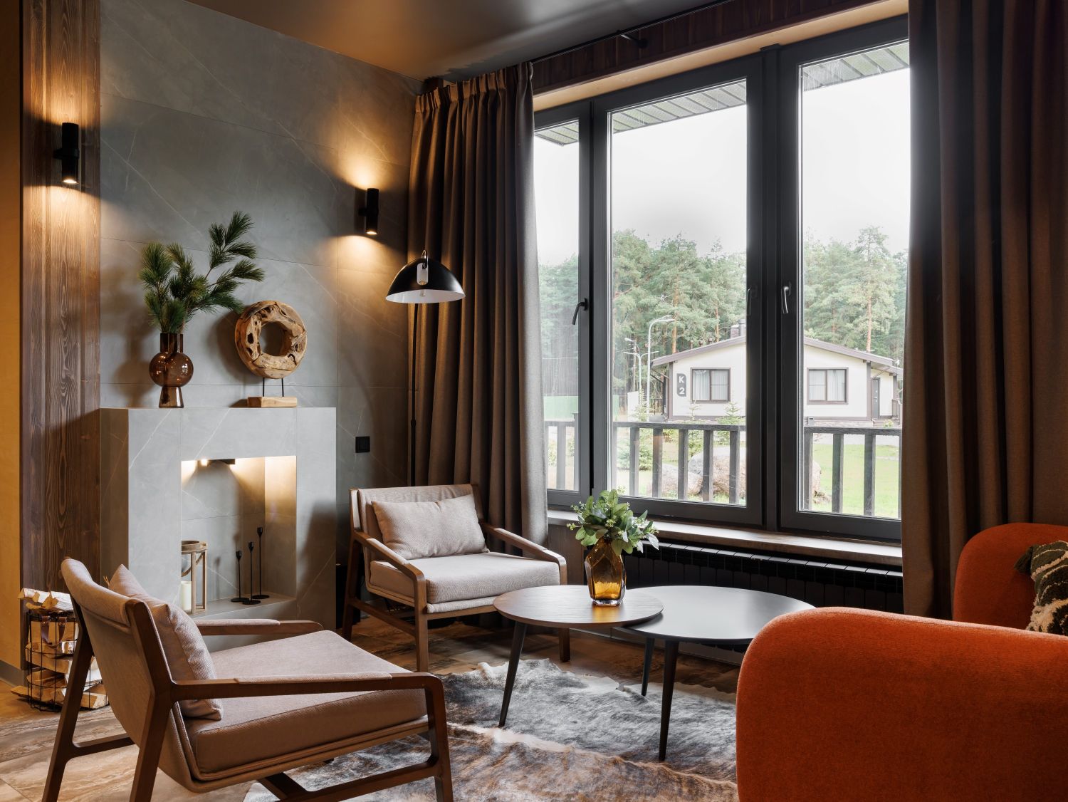 Особое внимание в коттеджах парка-отеля «Лесная Ривьера» уделено созданию каминных зон, являющихся сердцем пространства. Камин, выполненный в минималистичном, современном стиле с отделкой из натурального камня и темного металла, гармонично вписывается в природную эстетику интерьера. Строгие формы подчеркивают брутальность и одновременно элегантность, создавая выразительный акцент, который притягивает взгляд и дарит ощущение тепла и уюта. Языки пламени, отражающиеся в темной поверхности, создают завораживающее зрелище, а окружающее пространство, где используются натуральные материалы, мебель из дерева и мягкий текстиль, приглашает к отдыху и созерцанию.