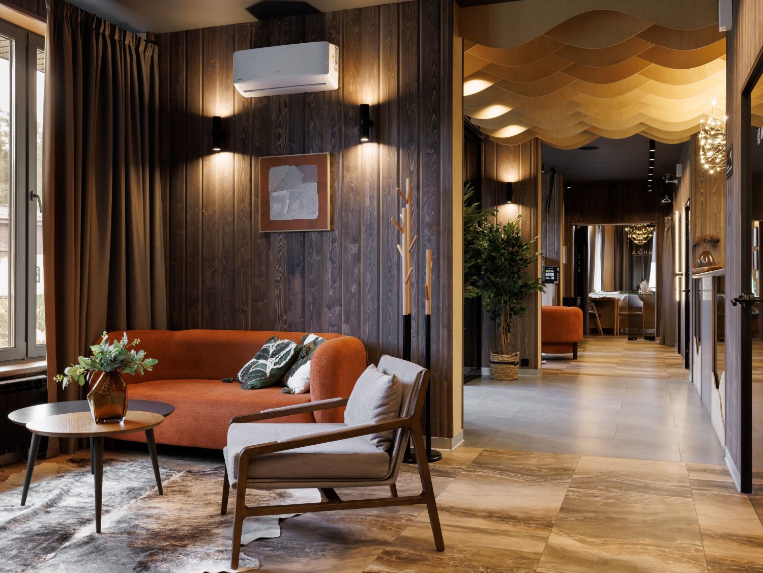 - Первый корпус – «Лесная глушь»: Интерьеры этого корпуса окутаны свежестью зелени, приглушенными тонами древесины и натуральных тканей. Атмосфера спокойствия и обновления достигается за счет обилия растительных мотивов, легких текстур и мягкого, рассеянного освещения, напоминающего солнечные блики в чаще леса.