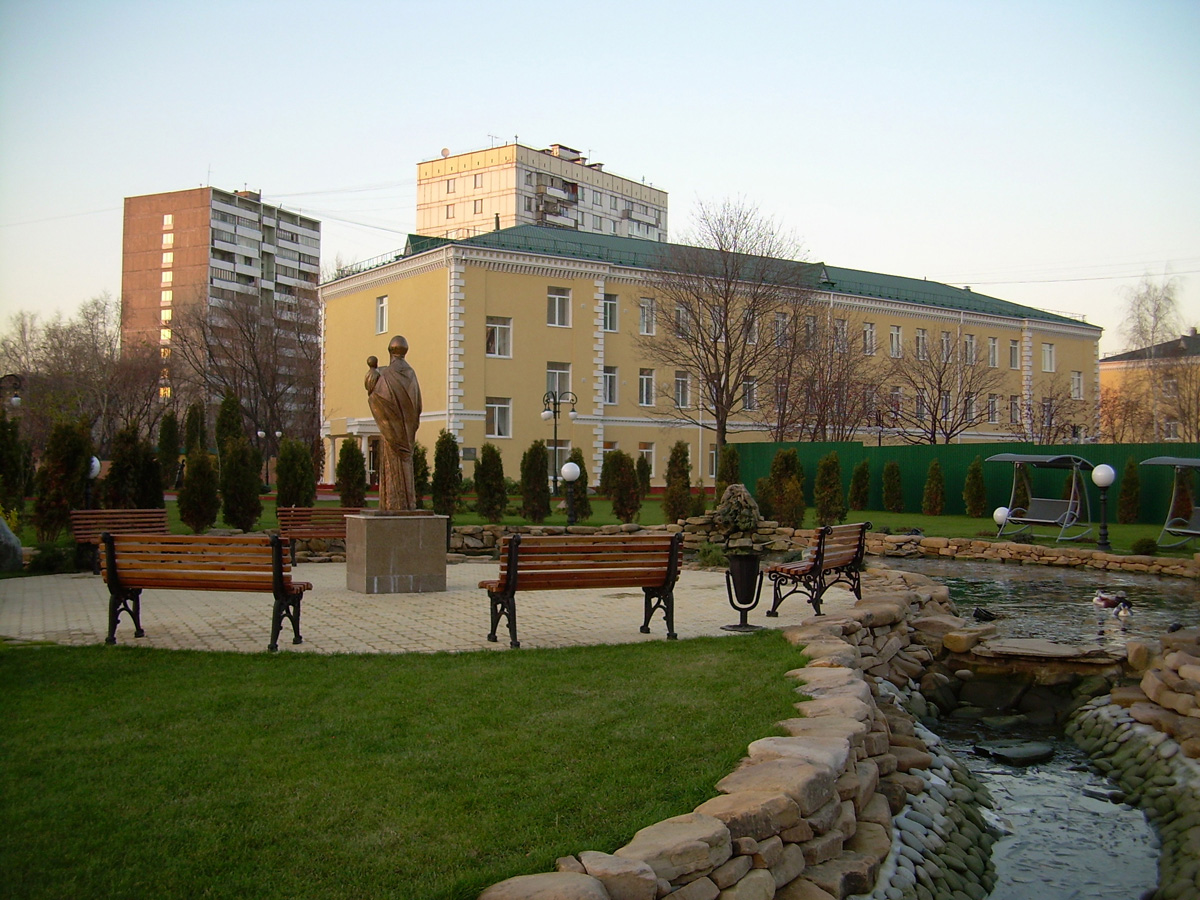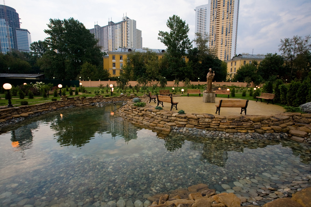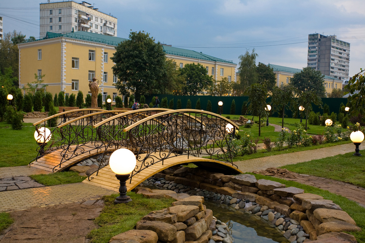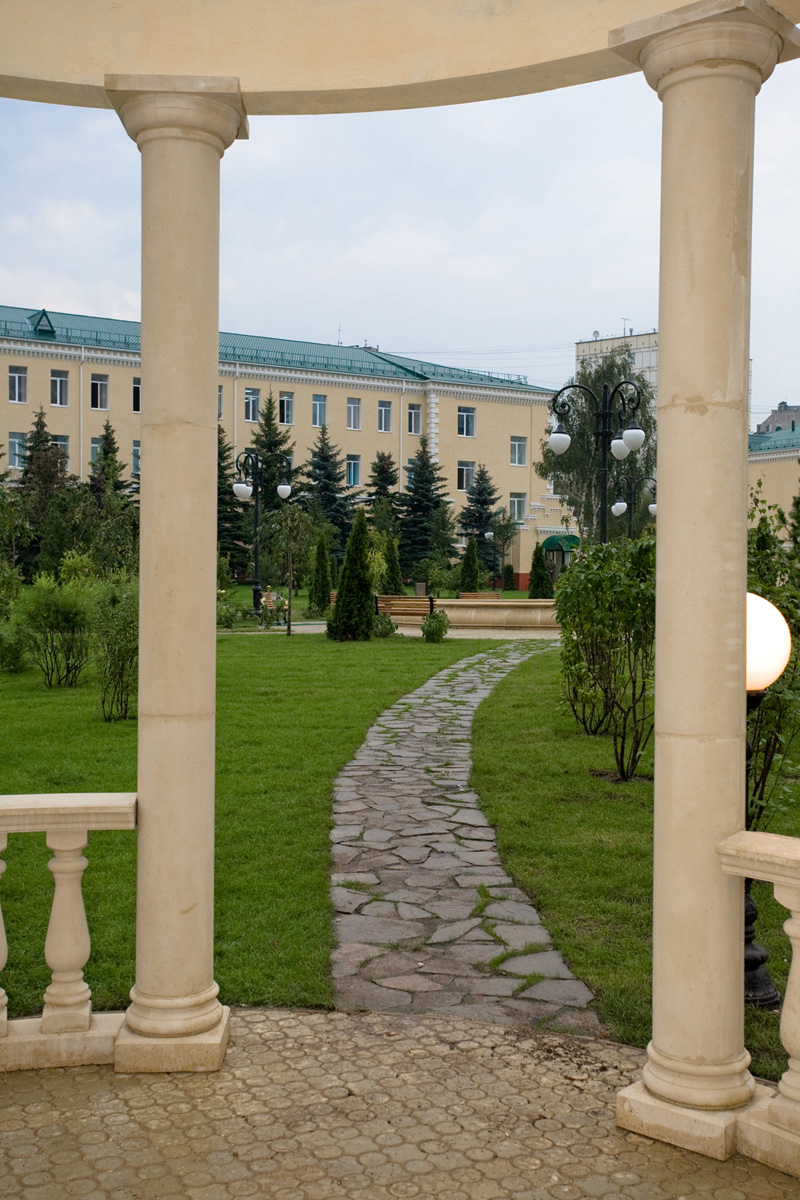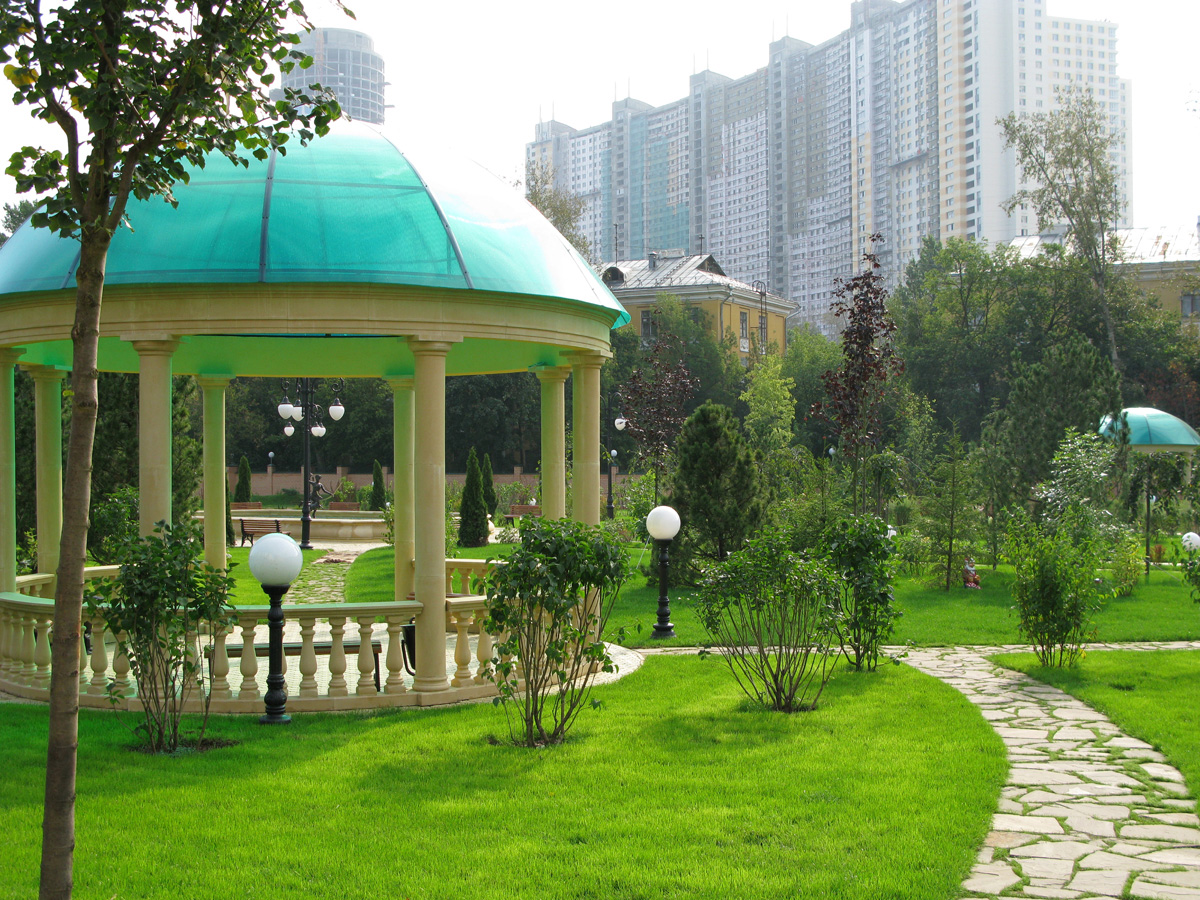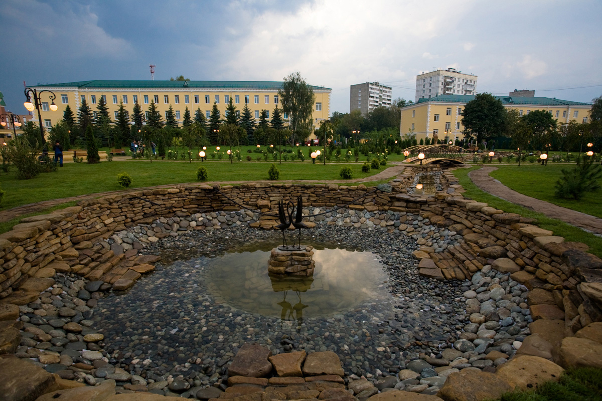 Ландшафтный дизайн разработан и реализован в пансионе воспитанниц Министерства Обороны Российской Федерации. Парк представляет собой структуру из нескольких локаций и поделен на зоны центрального фонтана, беседок, пруда и площадок для отдыха.