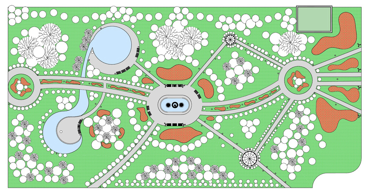 Дорожки парка организованны таким образом, чтобы при каждом повороте при перемещении раскрывалась новая локация.