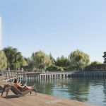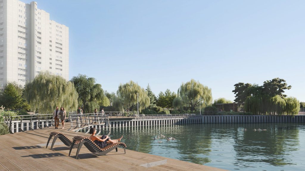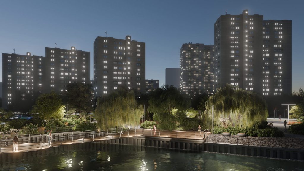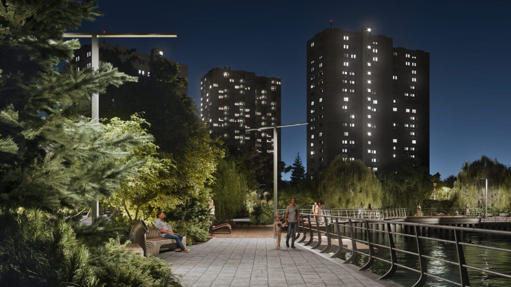 Особым пространственным акцентом стал пешеходный подвесной мост, соединяющий две части парка. Он проходит над водой и в вечернее время мягко подсвечивается, создавая выразительный силуэт и усиливая атмосферу безопасности и уюта. Для любителей живой природы предусмотрено место для кормления уточек — как место тихого взаимодействия человека и воды, важного элемента городской экологии.